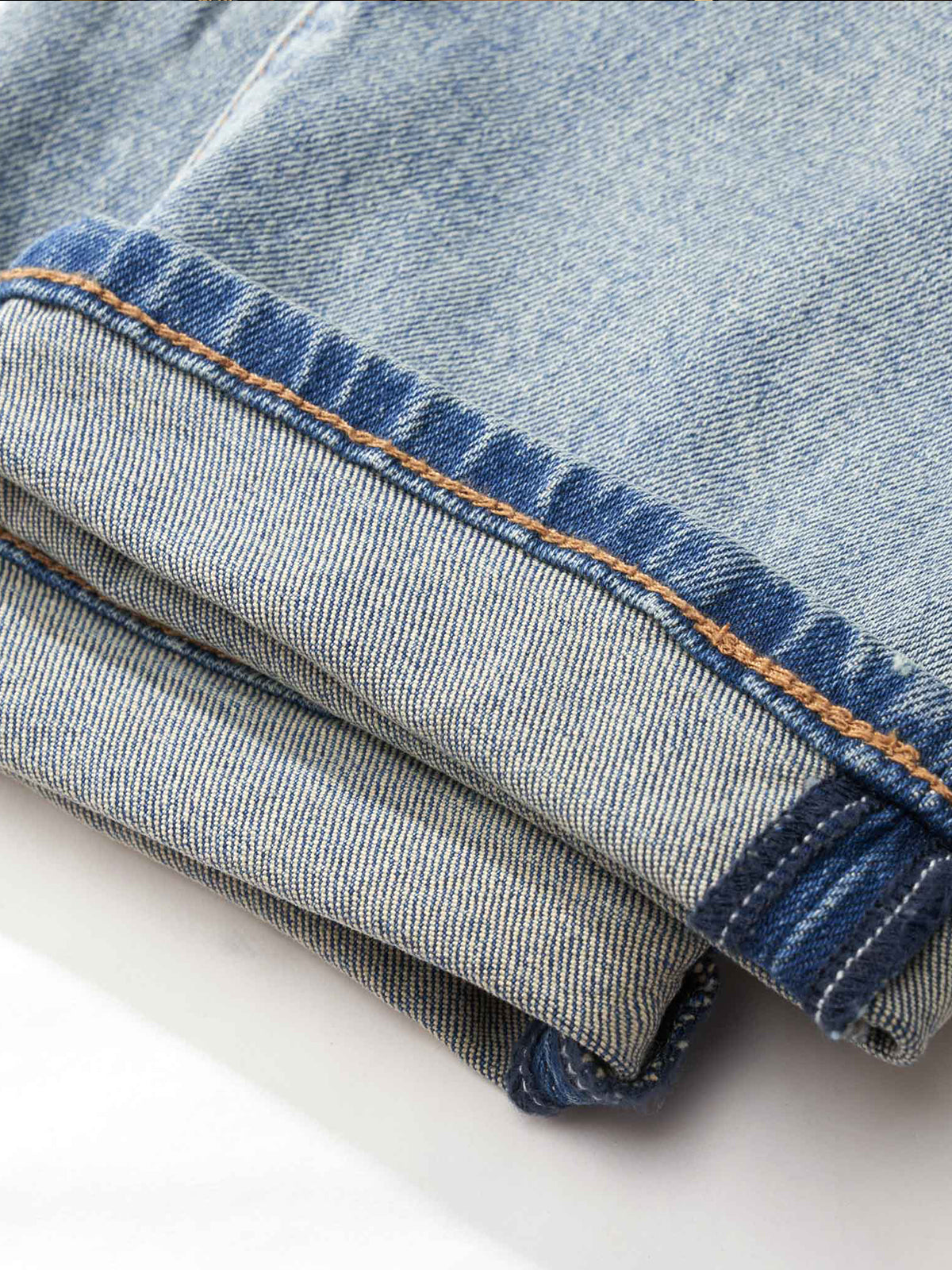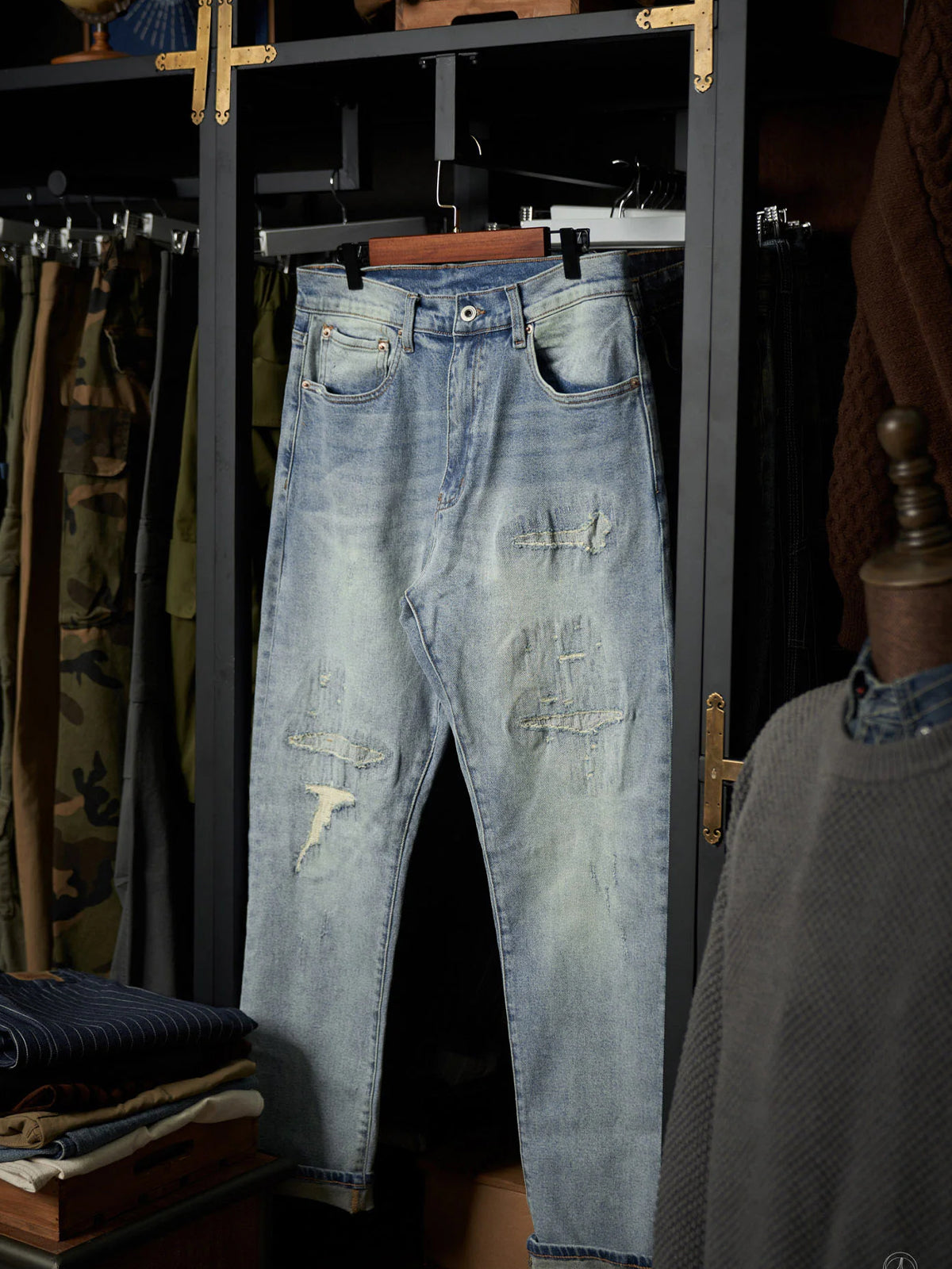 These heavyweight denim pants combine a simple color with eye-catching distressed details for a stylish streetwear vibe. Designed with two front pockets and two patch pockets at the back, every detail reflects careful craftsmanship. The deep rise ensures a comfortable fit, while the slim, balanced silhouette looks flattering on everyone.