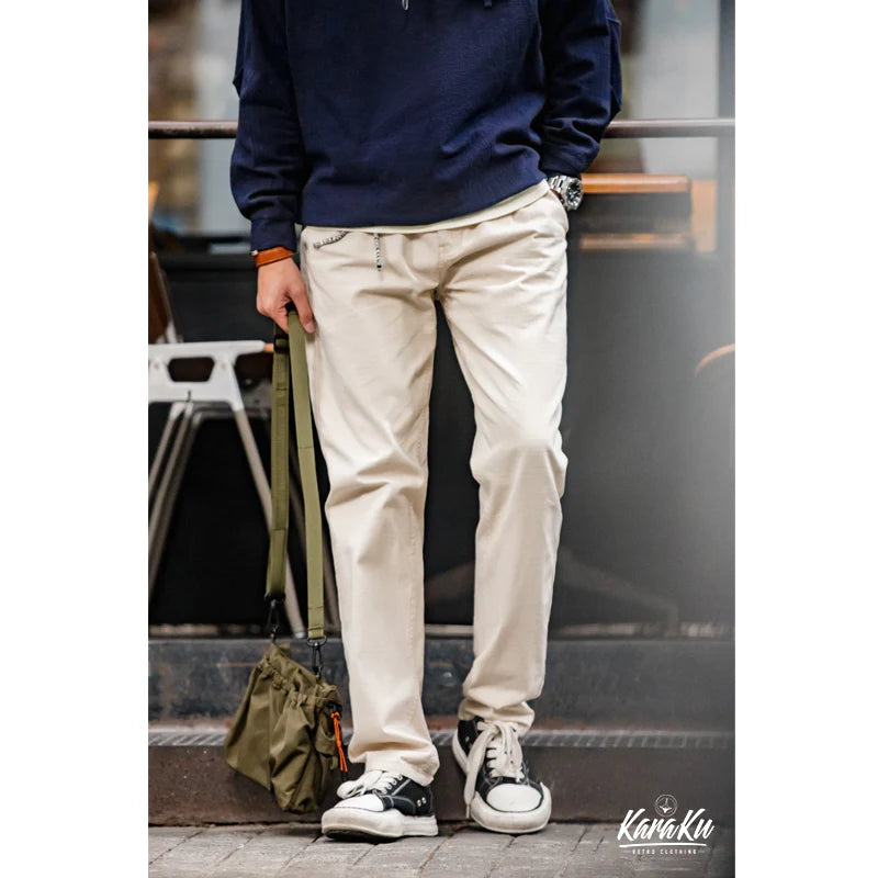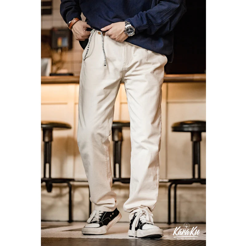 Featuring zippers and buttons, these white jeans have large front pockets and back patch pockets for functionality. Crafted from natural cotton canvas with a robust texture, they offer a vintage charm. The fabric retains cotton husks and seeds, adding to a natural feel. Finished with a wash for softness and wrinkle resistance, these slightly tapered straight-leg pants are versatile.