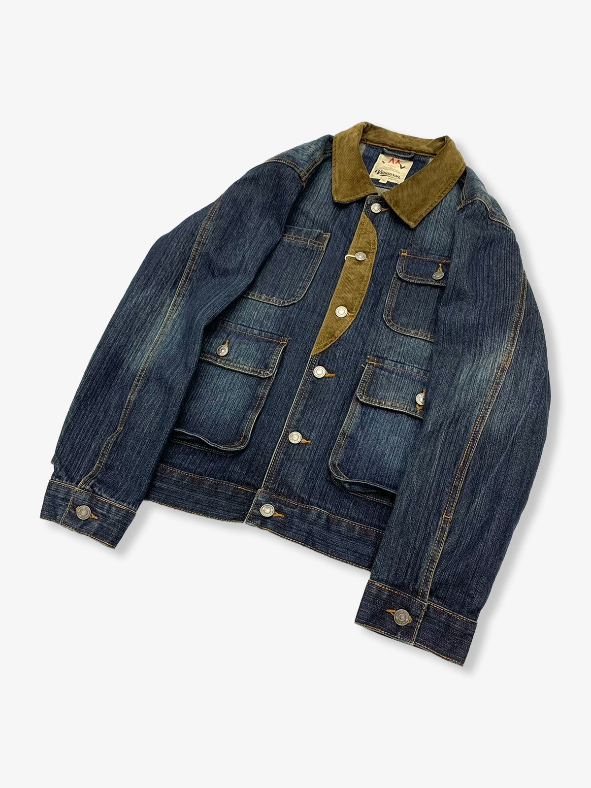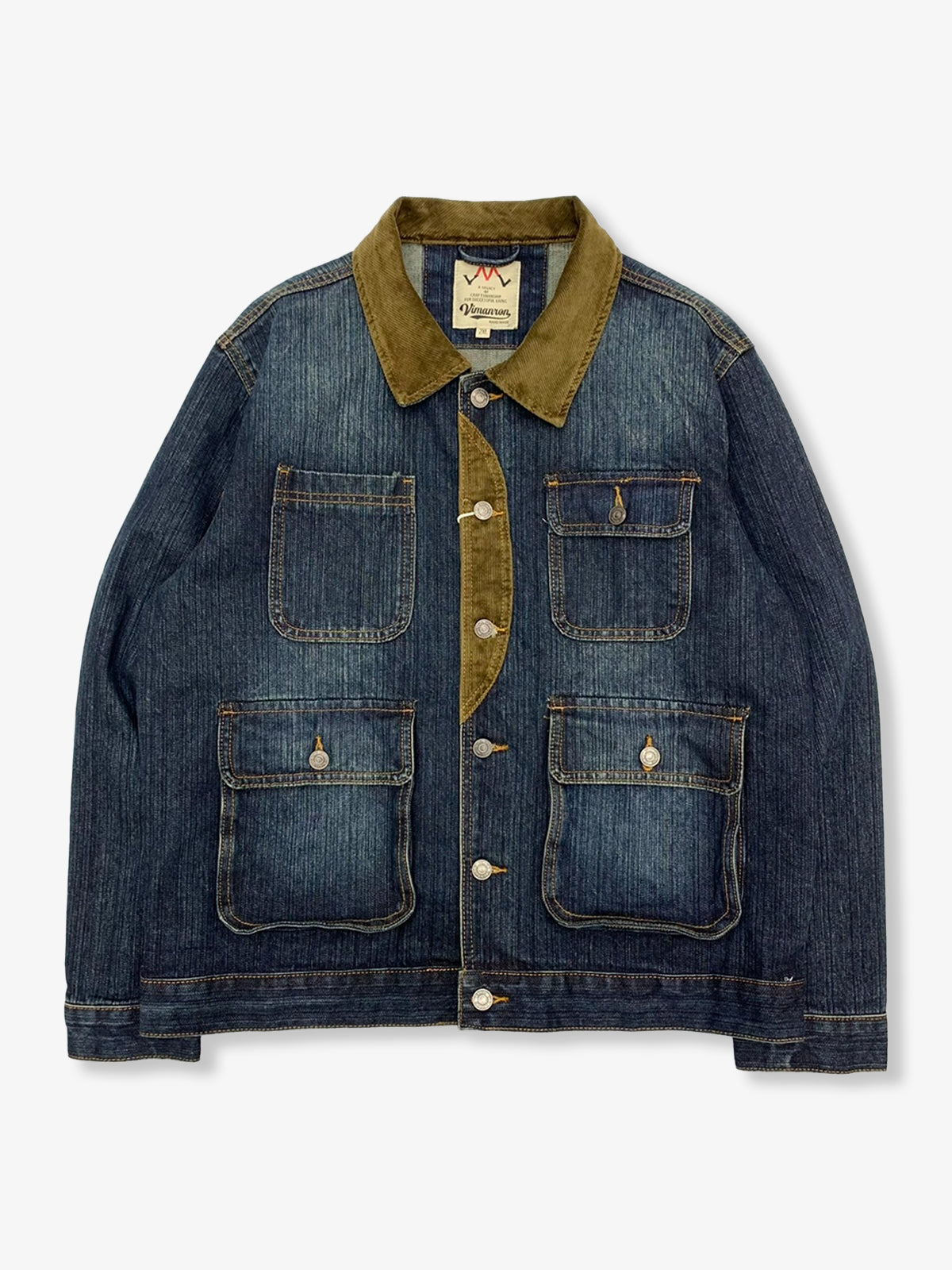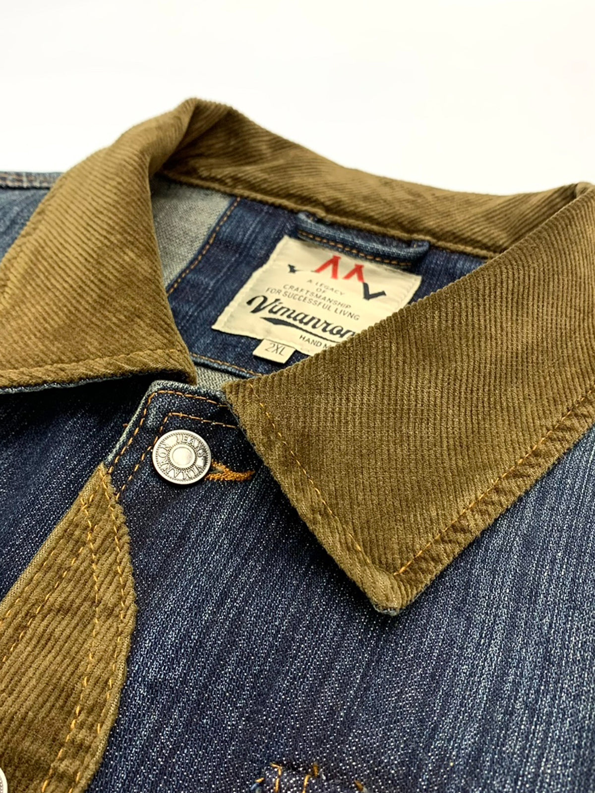 A rugged reinterpretation of the classic American work jacket. This piece combines washed denim with patchwork detailing for a well-worn, vintage look that feels both authentic and contemporary. The corduroy collar adds a mountain-inspired touch, while the loose silhouette ensures comfort and layering versatility through the fall season.