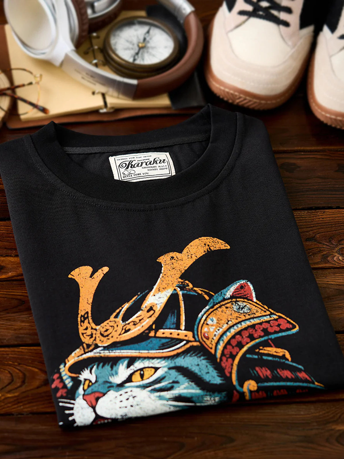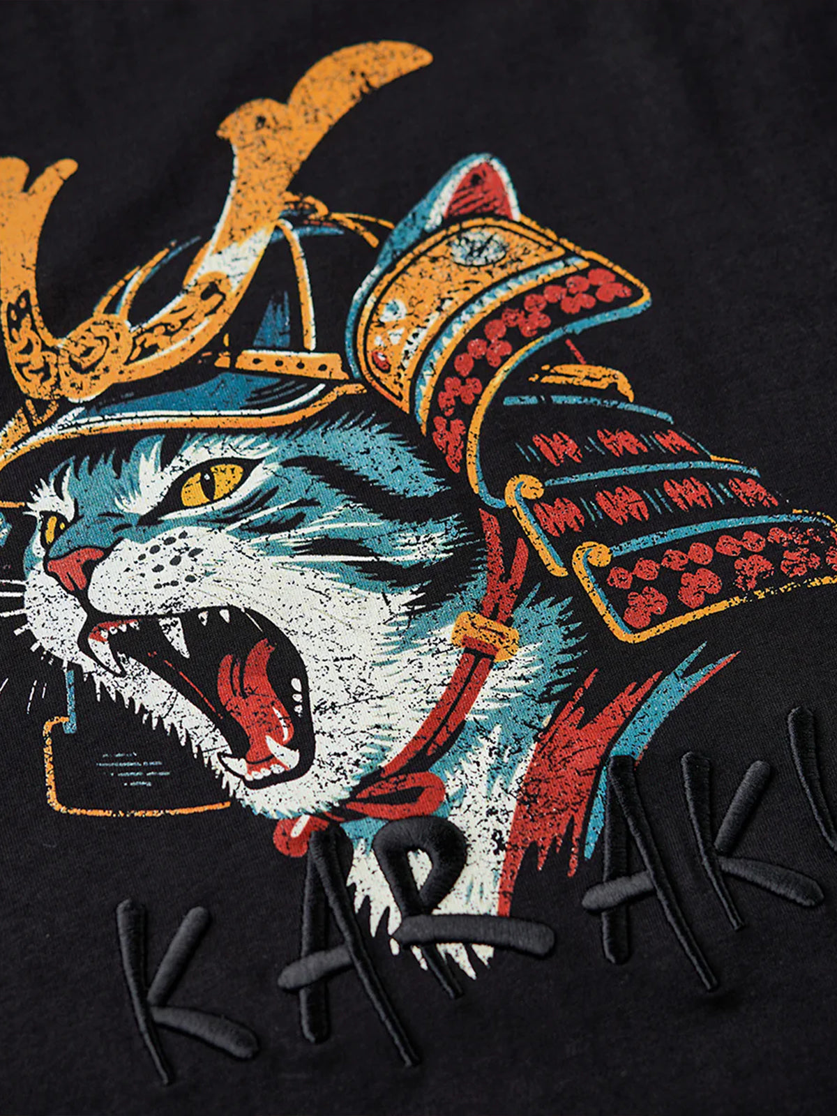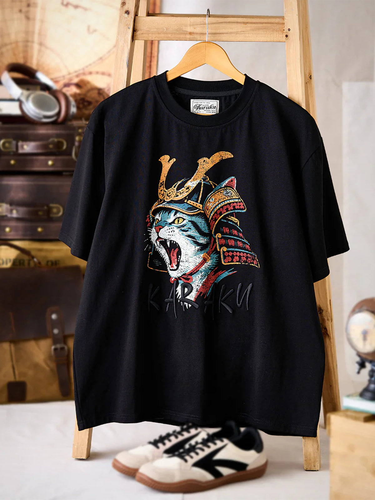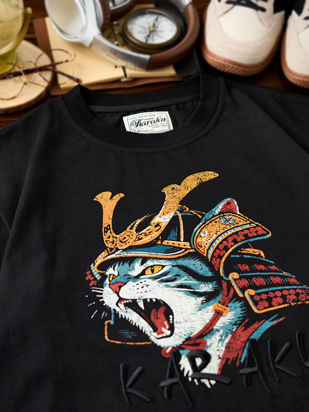 "Roaring Shogun Cat" Print & Karaku Embroidery T-shirt
