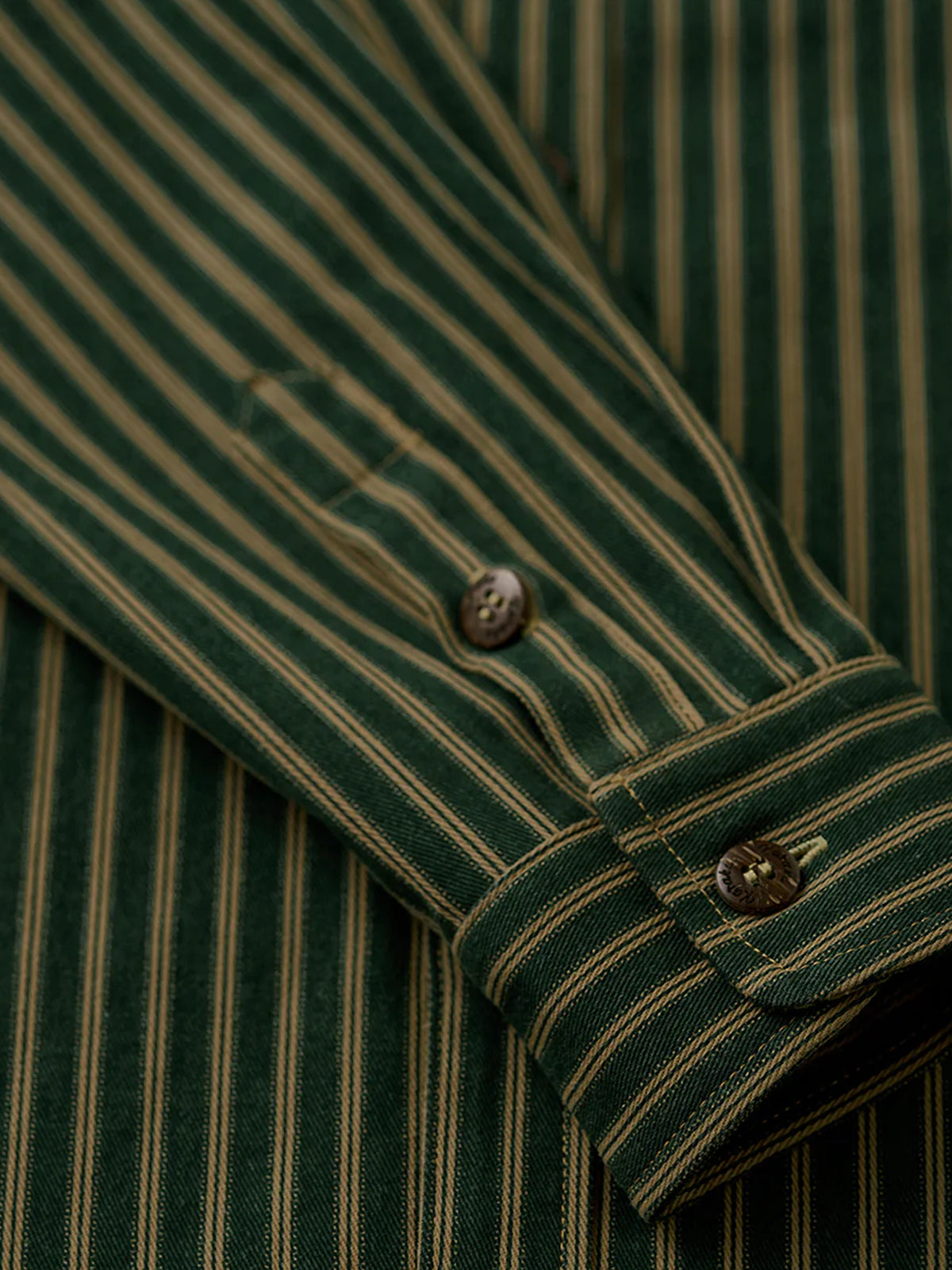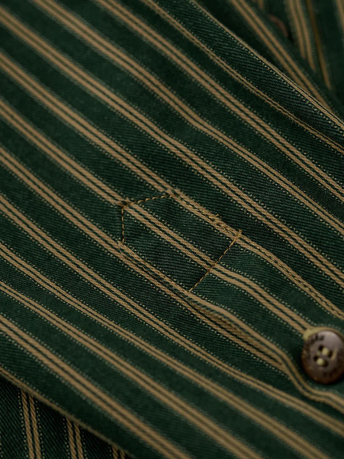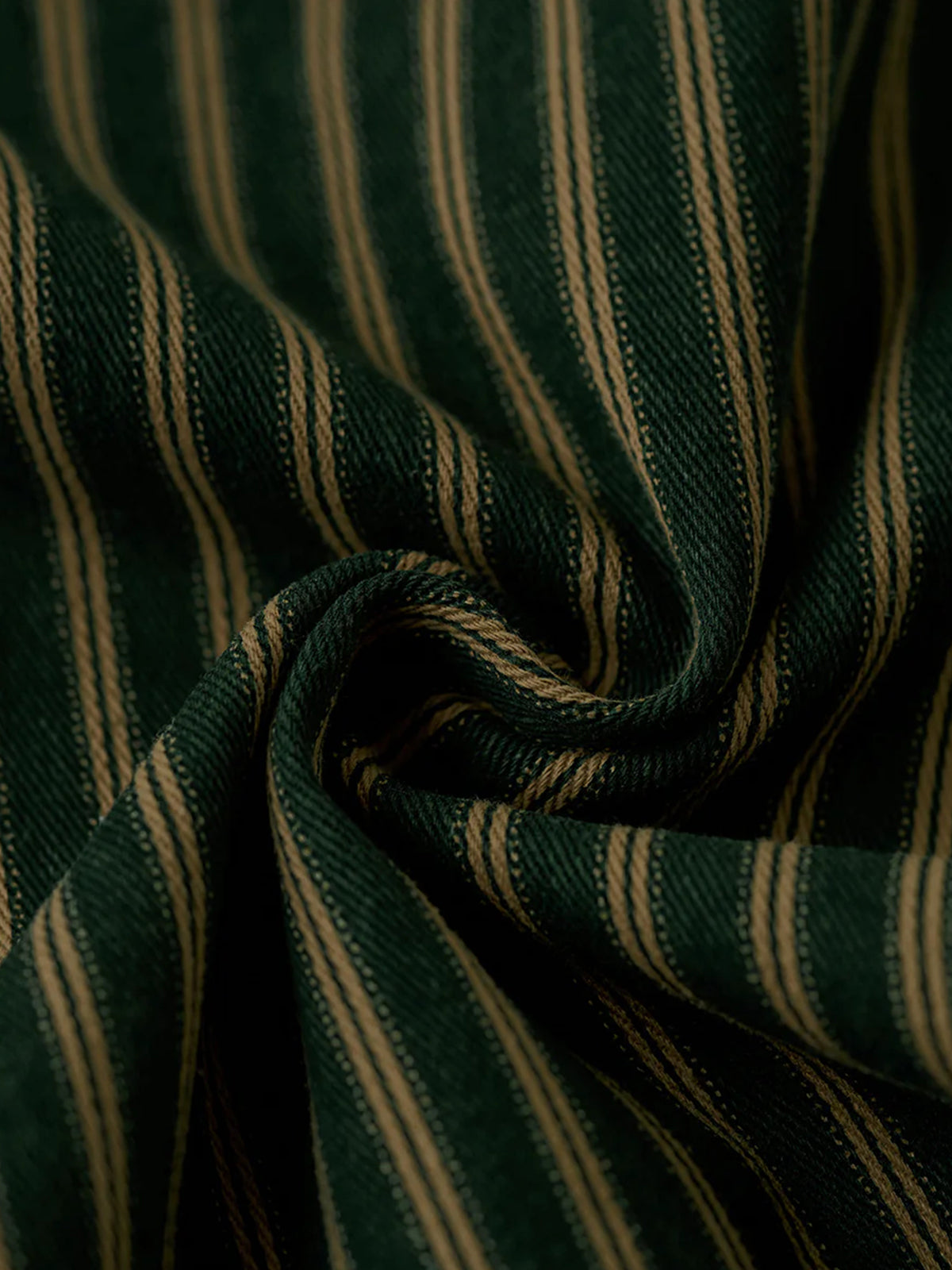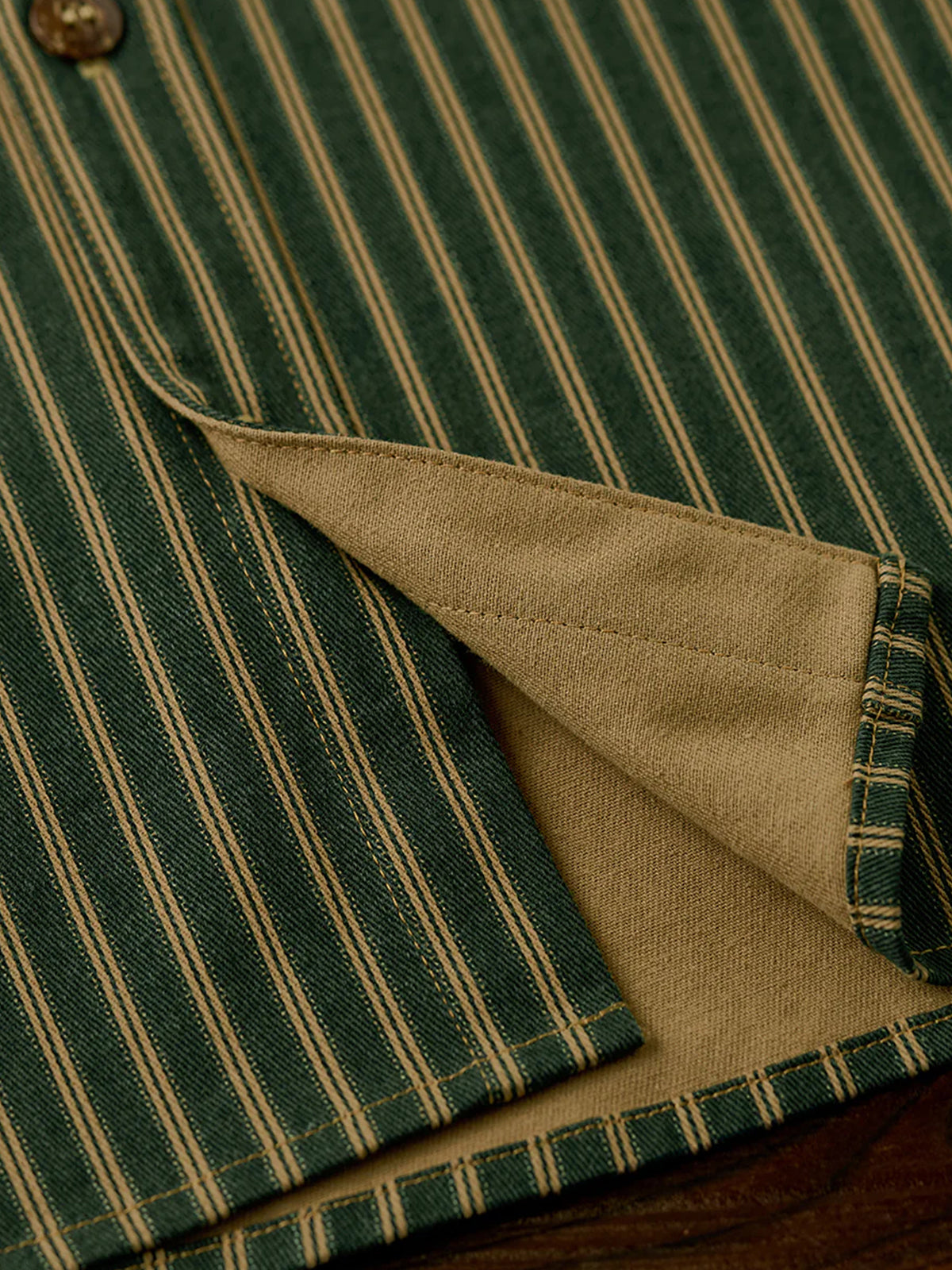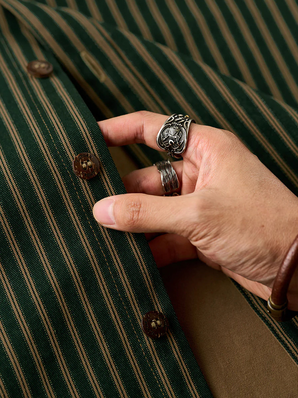 A standout piece that commands attention — the bold print of a brave Indian chief at the chest instantly draws the eye, complemented by three-dimensional embroidered lettering beneath. The retro striped pattern adds a nostalgic charm while keeping the look refined. Crafted from thick, heavyweight fabric, it works equally well as a shirt or worn open like a light jacket. The relaxed silhouette gives it a casual yet effortless feel, making it easy to style with everything from laid-back to vintage-inspired outfits. A thoughtfully designed piece that looks great on its own and becomes more personal with every wear.