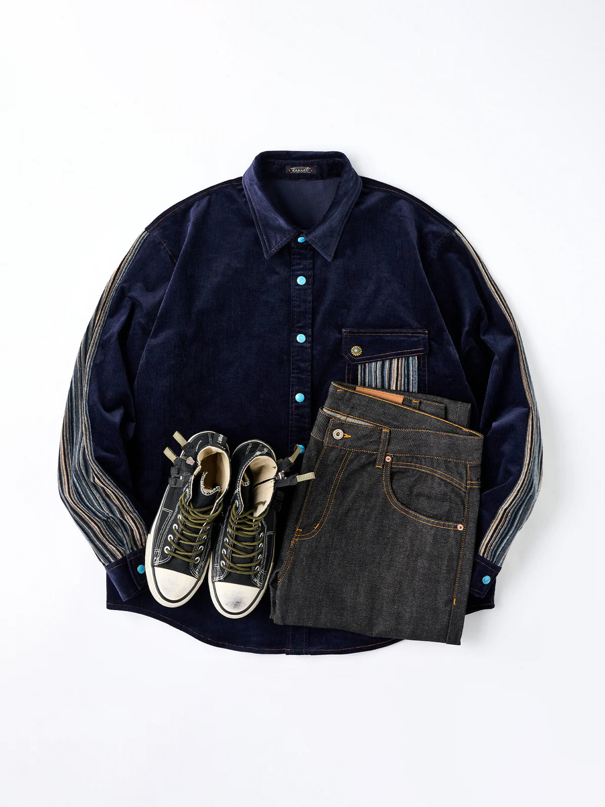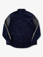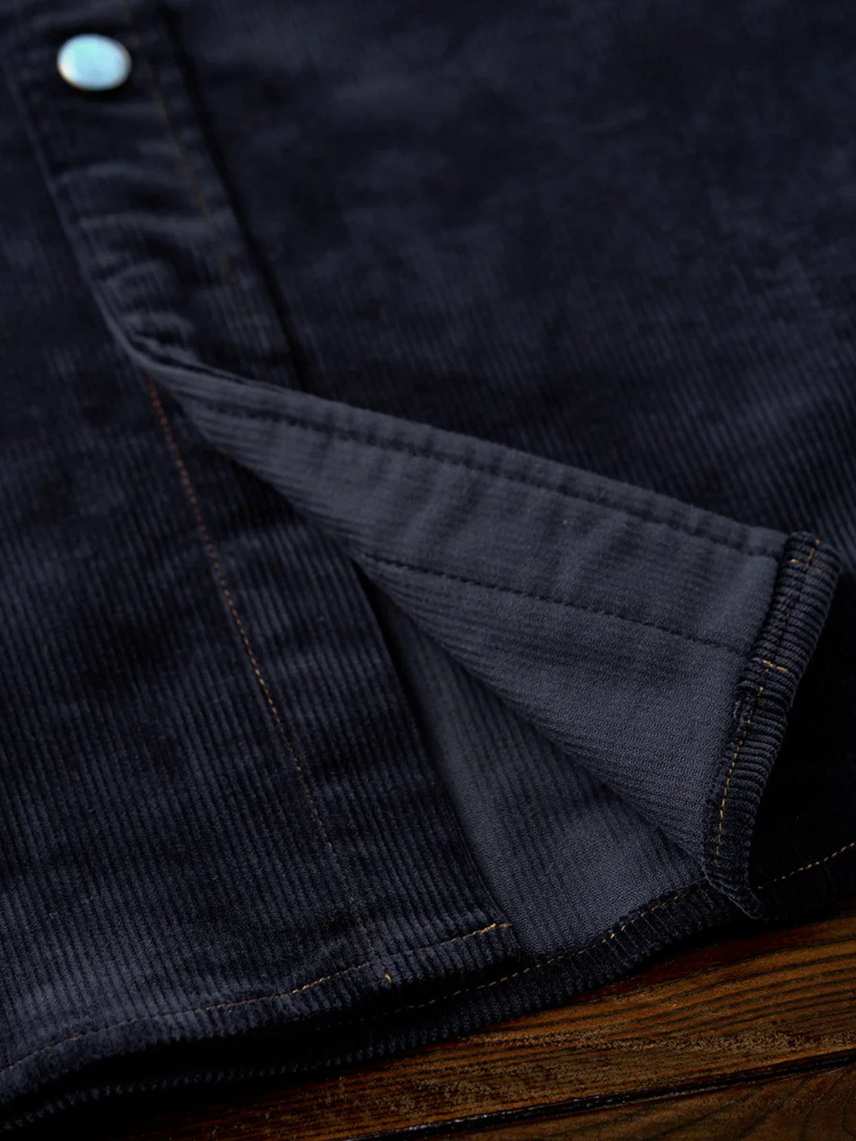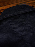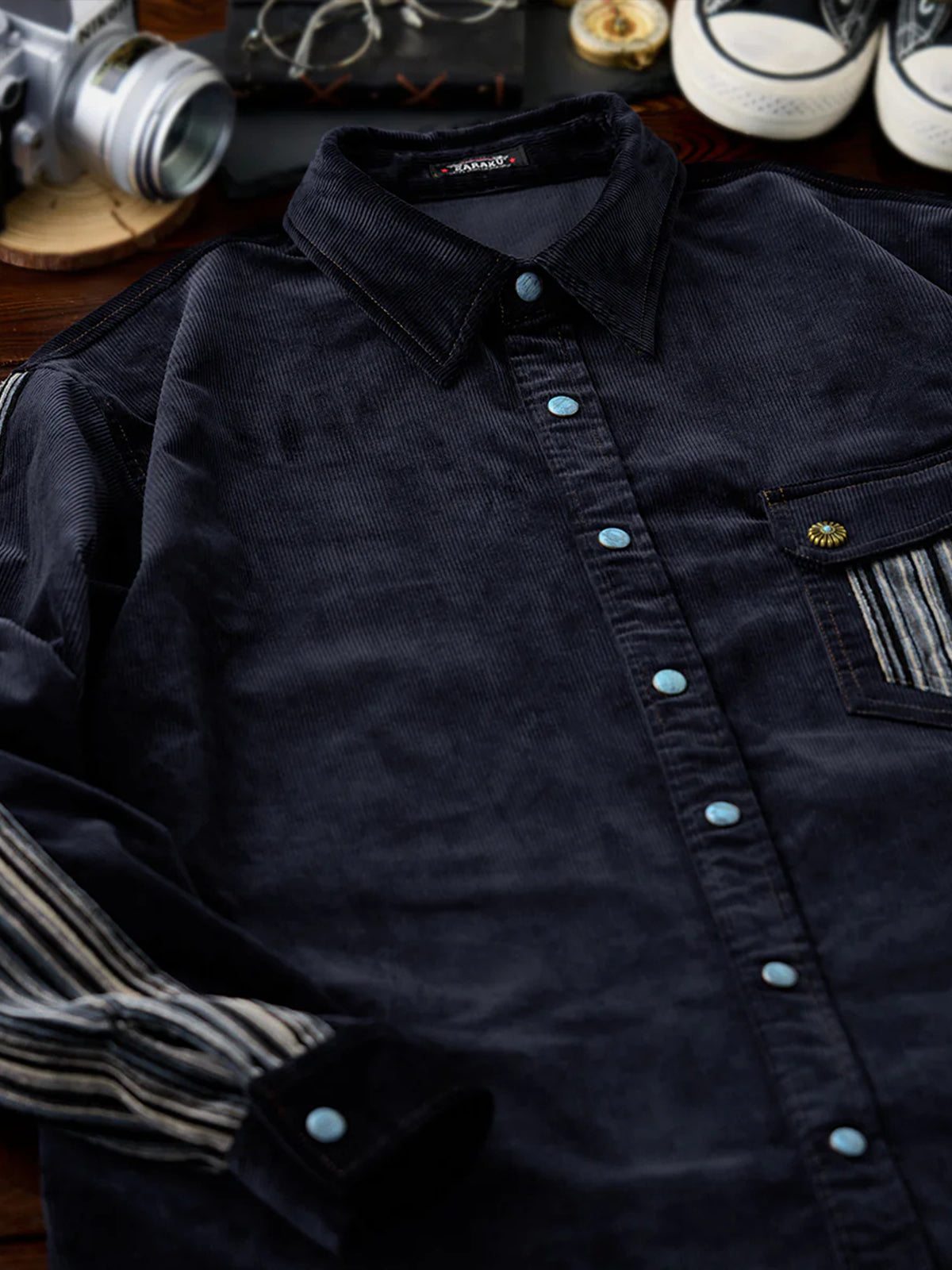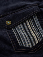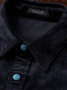 The turquoise-style buttons on the front placket, cuffs, and chest pocket stand out as the shirt’s most eye-catching detail. Their blue-green tone pairs beautifully with the deep navy corduroy, adding a playful twist to the overall design.
