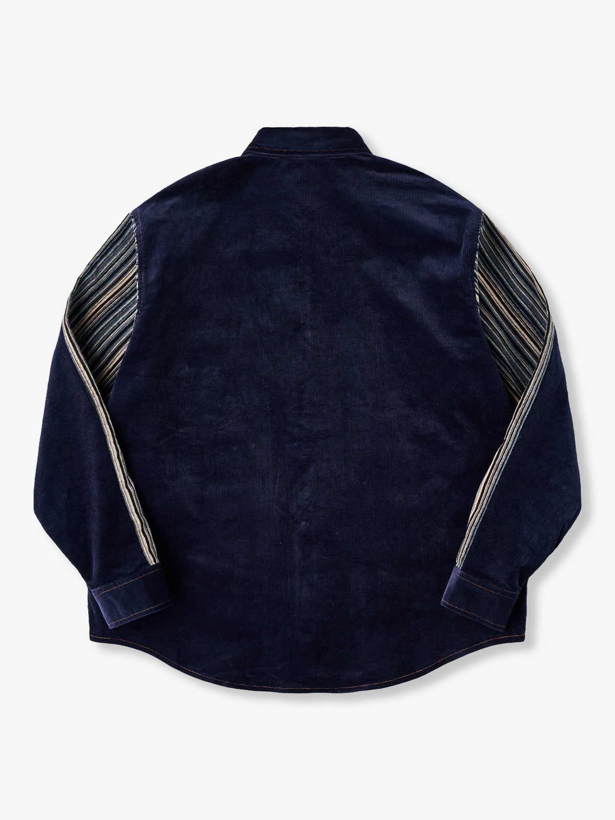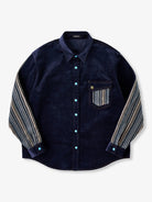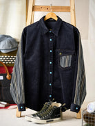 A classic corduroy shirt updated with modern elements, featuring mixed-material patchwork and refined detailing. The sleeves and chest pocket are crafted from a smooth, slightly lustrous striped fabric, with fine lines placed in a random layout to create a sense of movement.