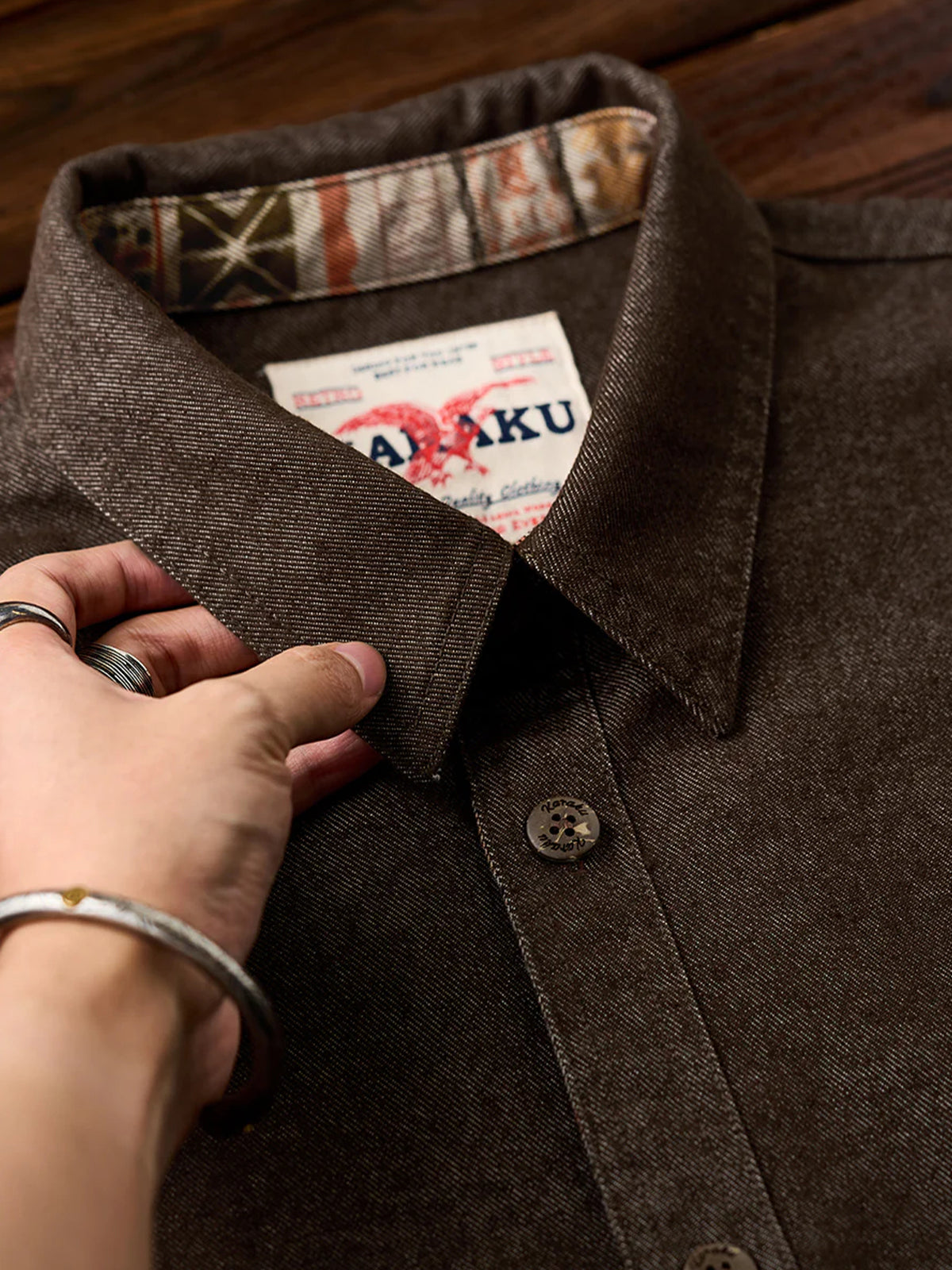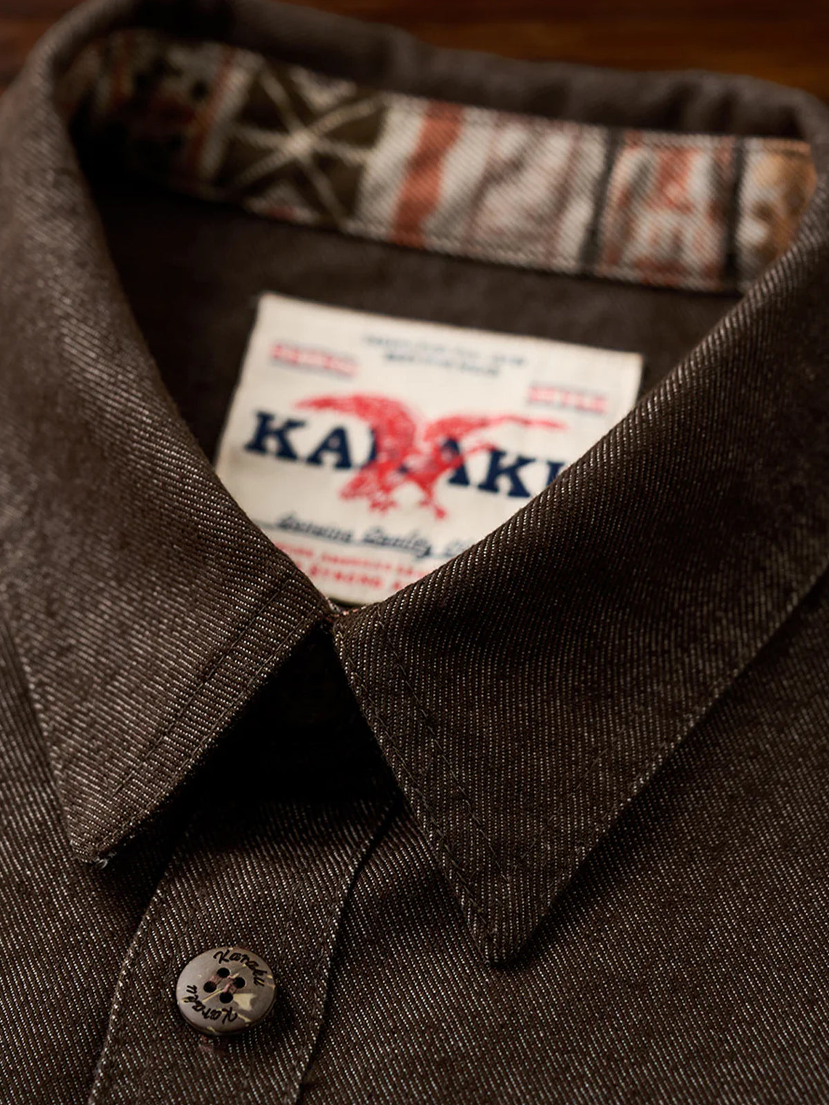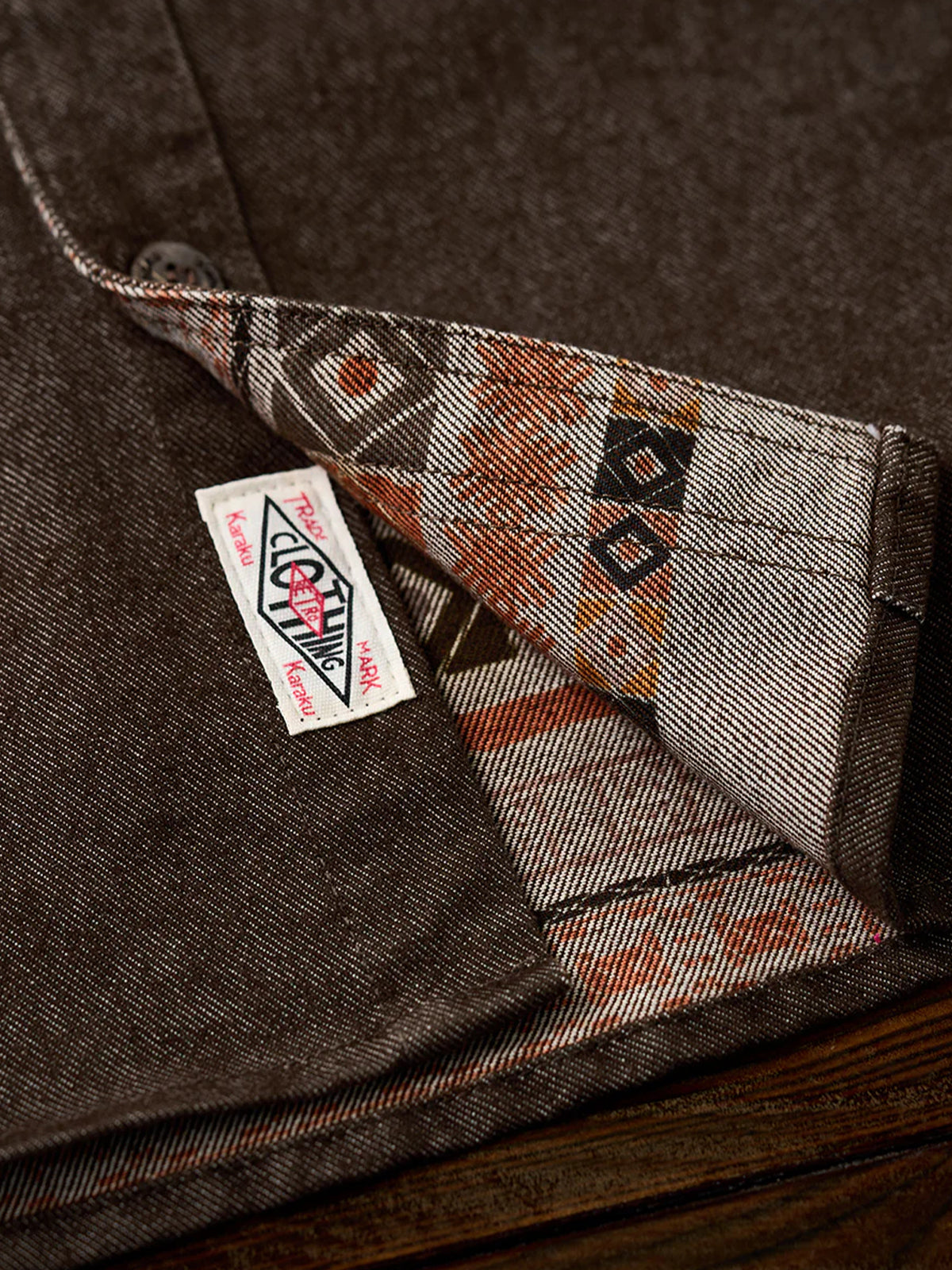 Ethnic-Pattern Lining Denim Shirt with "Karaku" Embroidered Logo& Red Cord Accent