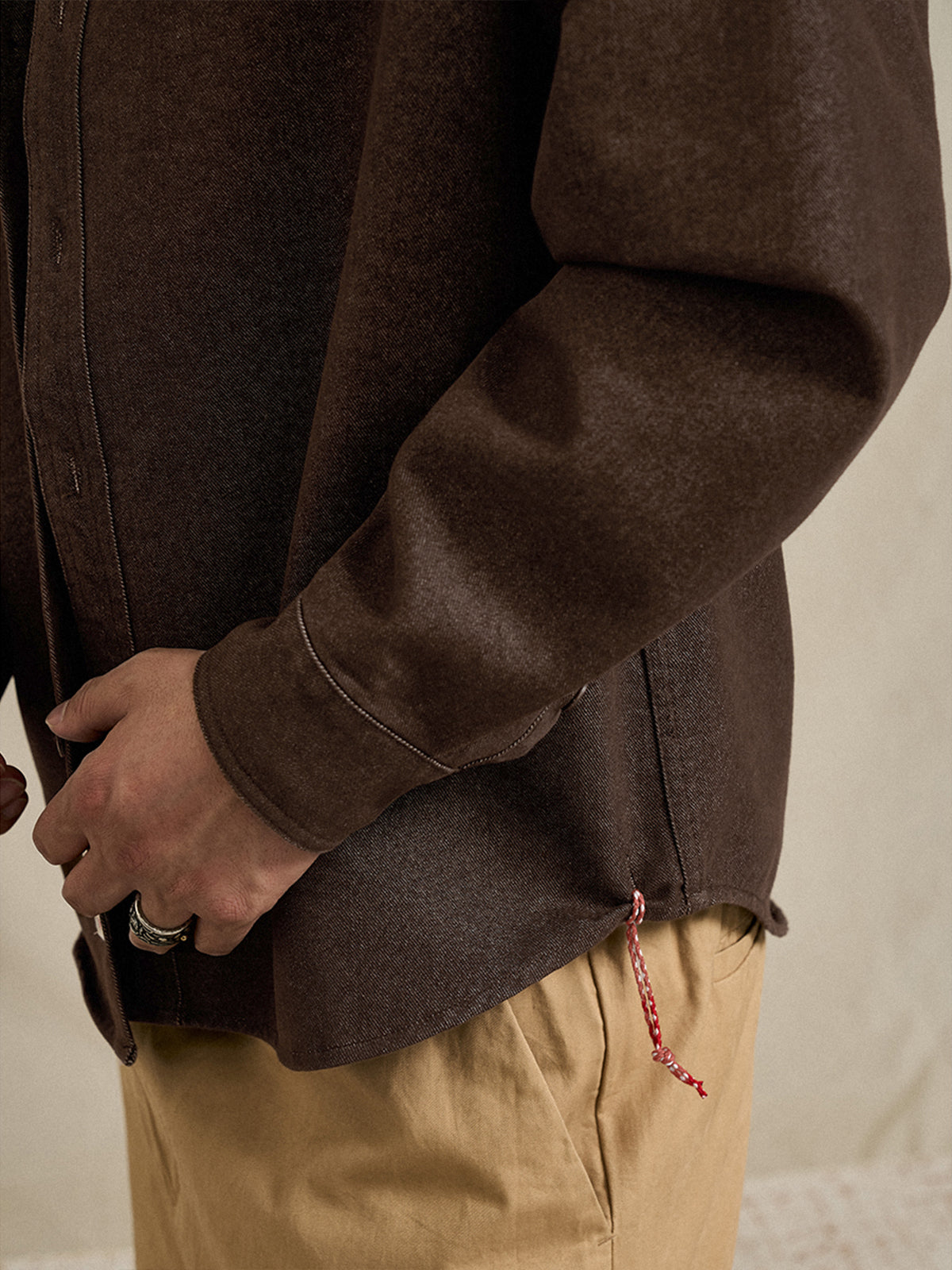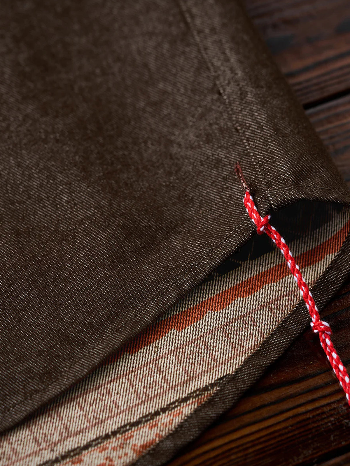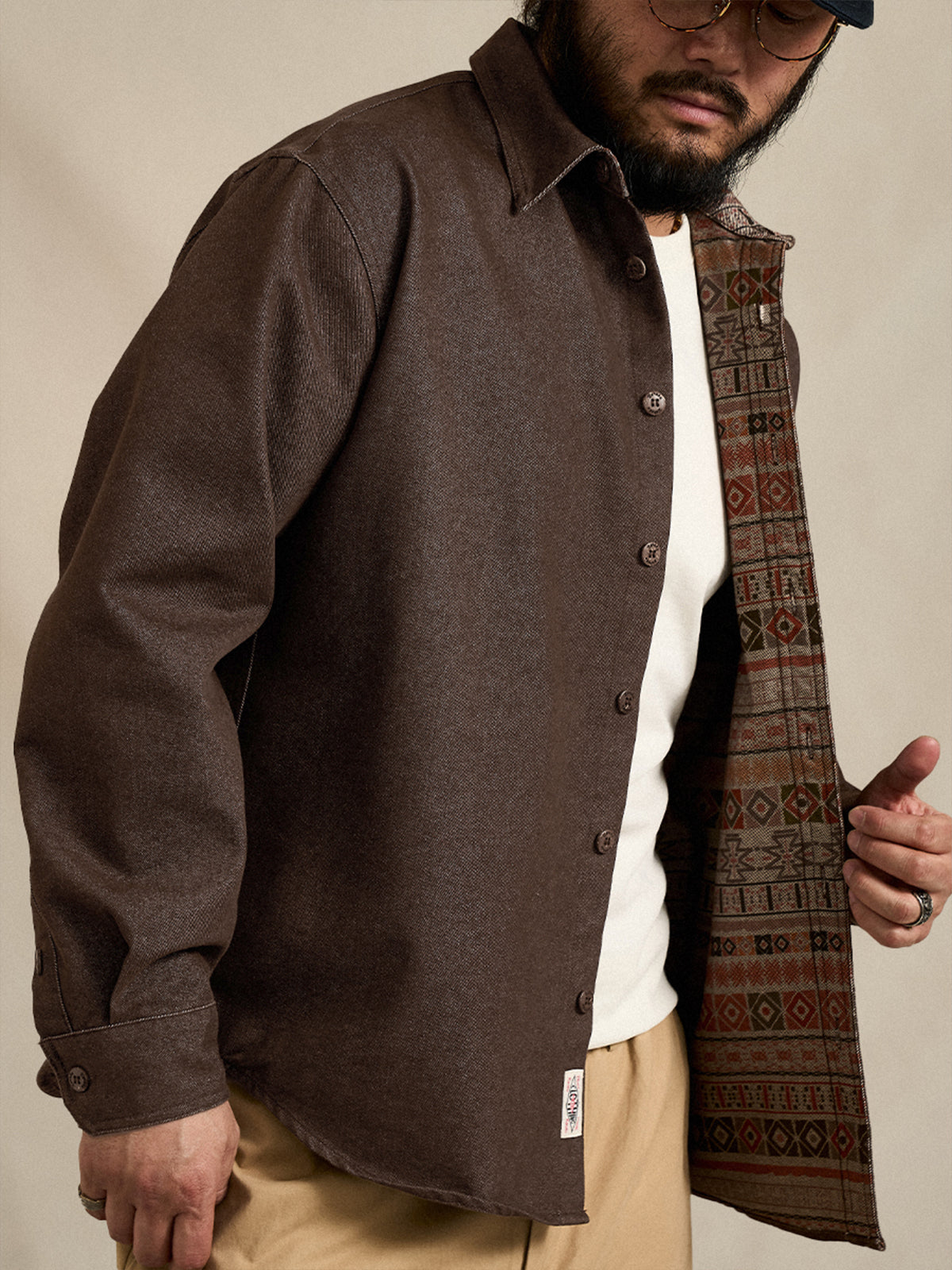 Ethnic-Pattern Lining Denim Shirt with "Karaku" Embroidered Logo& Red Cord Accent
