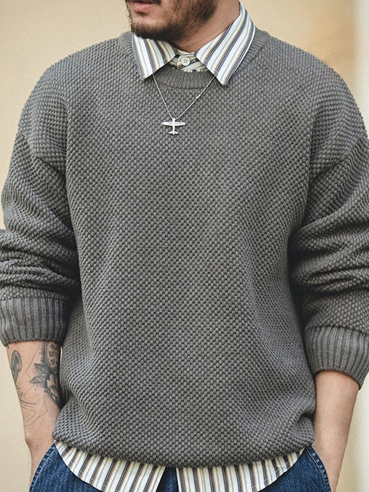 Classic Solid Color Ribbed Trim Knitted Sweater