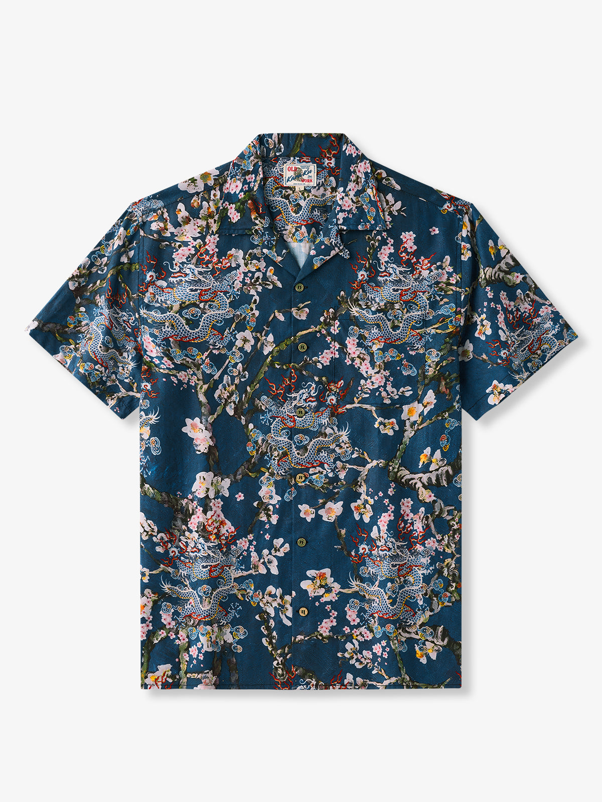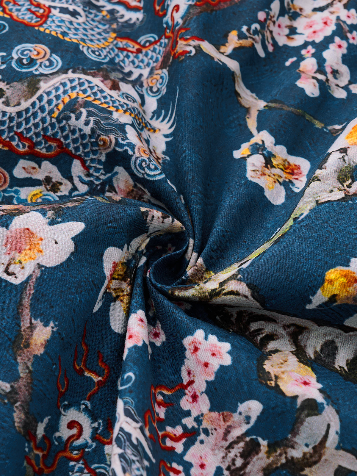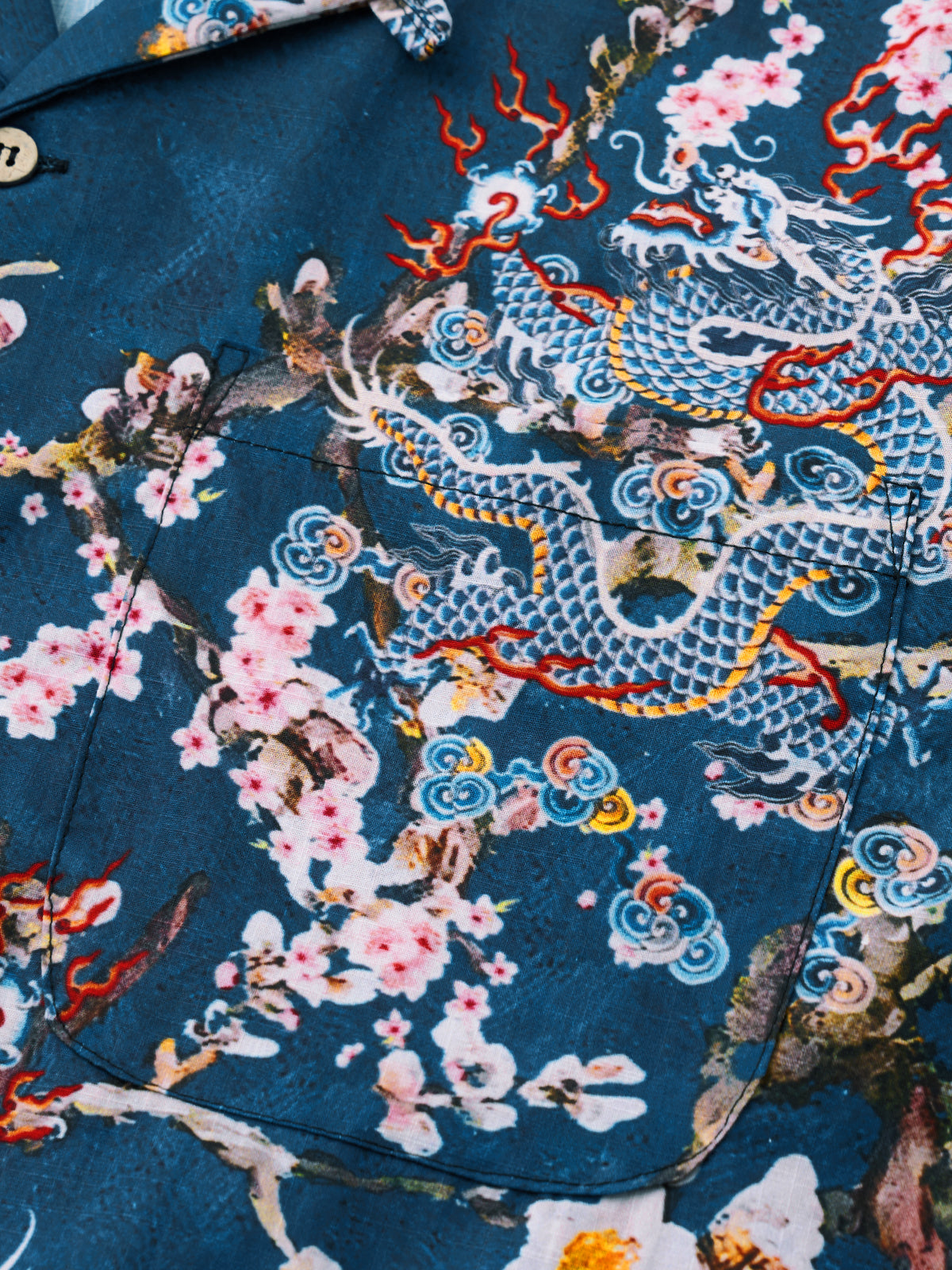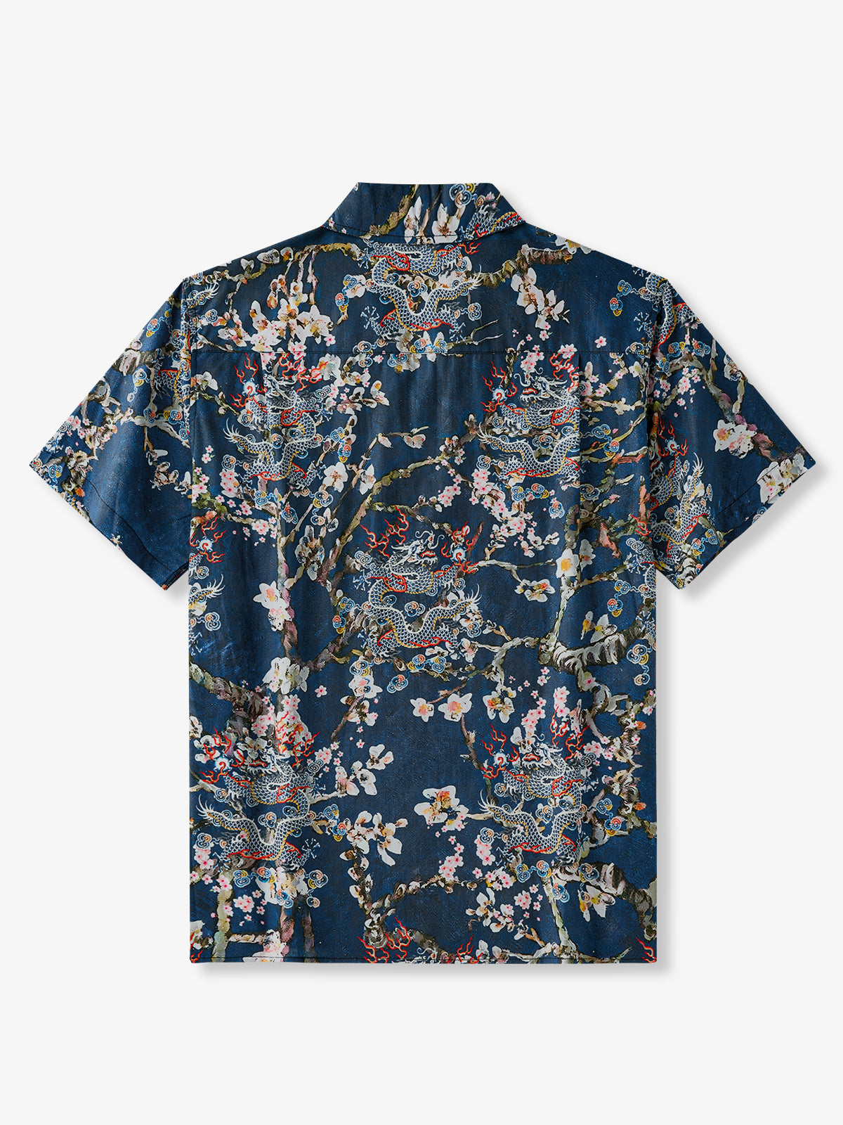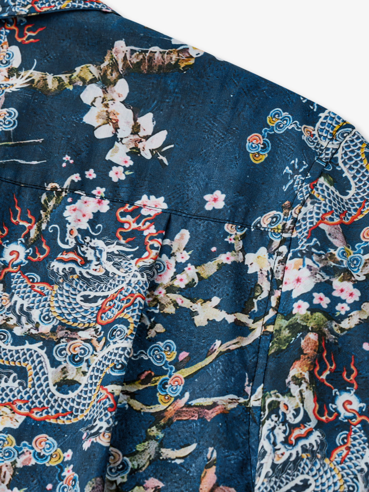 Combining Eastern mythology, this cotton shirt features a vivid dragon symbolizing strength, courage, and authority, paired with delicate cherry blossoms for beauty and renewal. The dragon exudes power, while the cherry blossoms add grace. Made from breathable, soft cotton, it offers comfort and durability. Perfect for casual wear, or cultural events, it embodies Eastern elegance and tranquility.