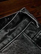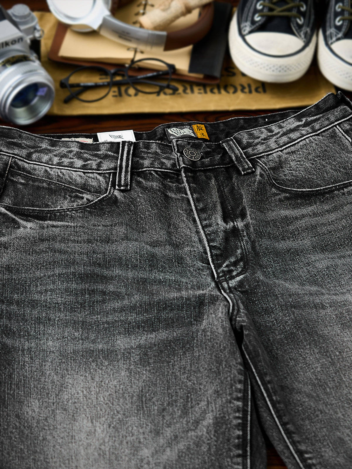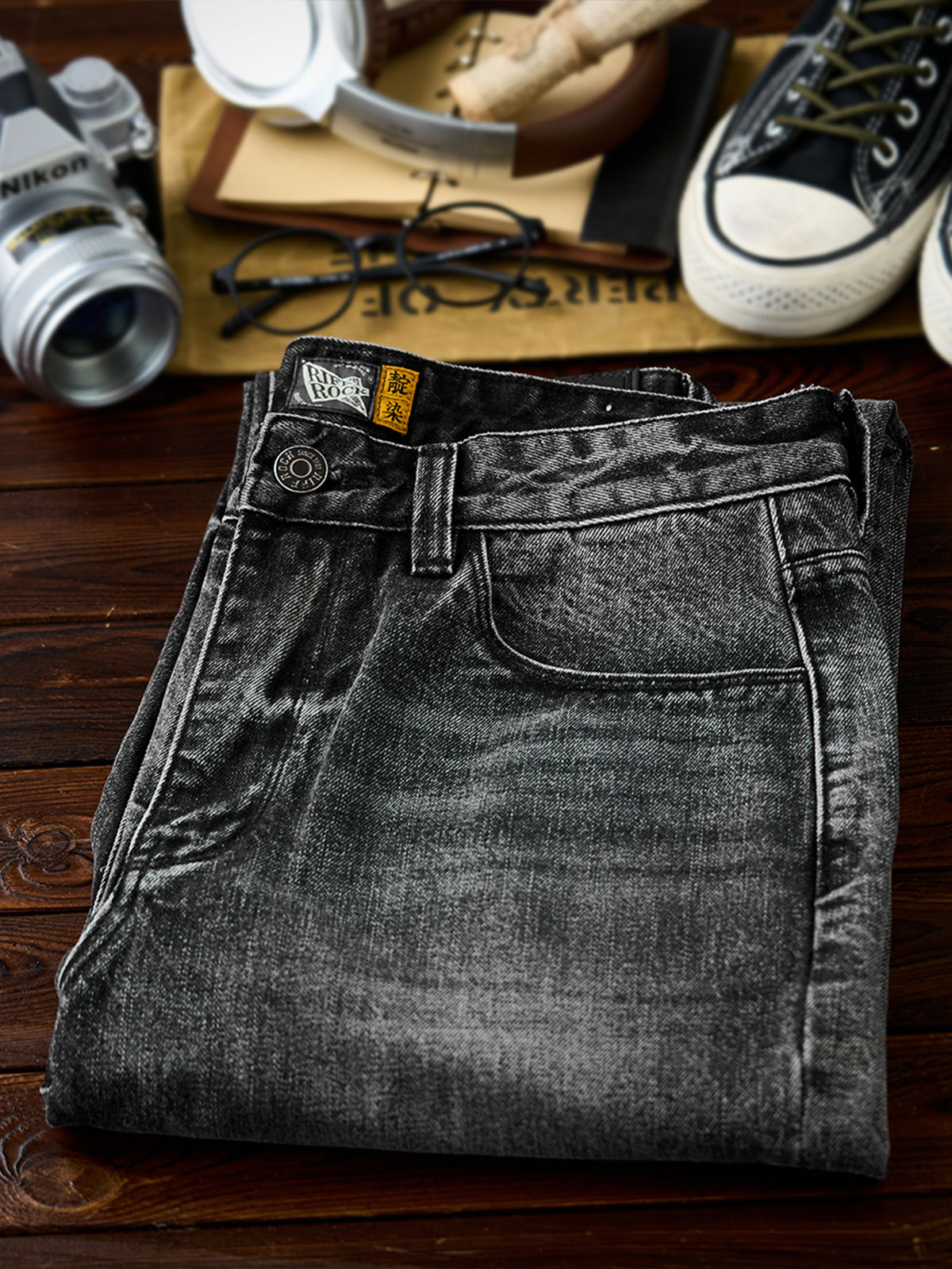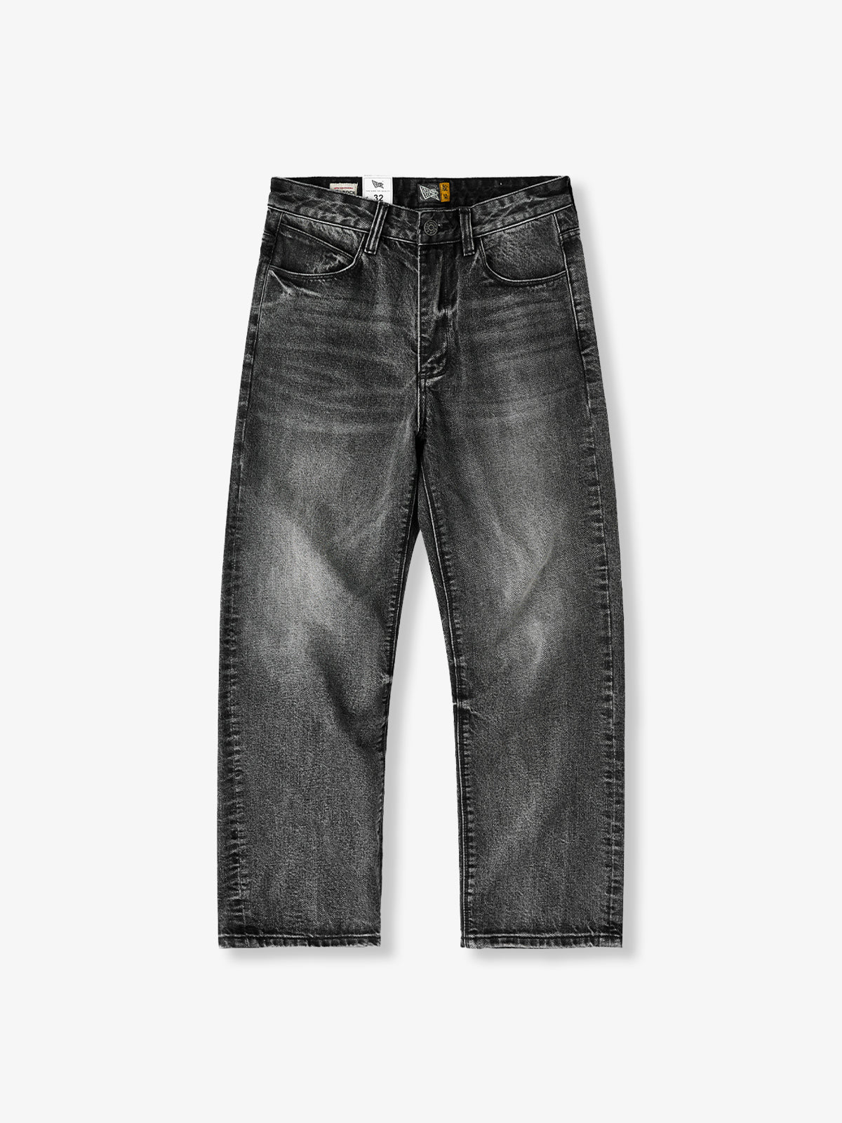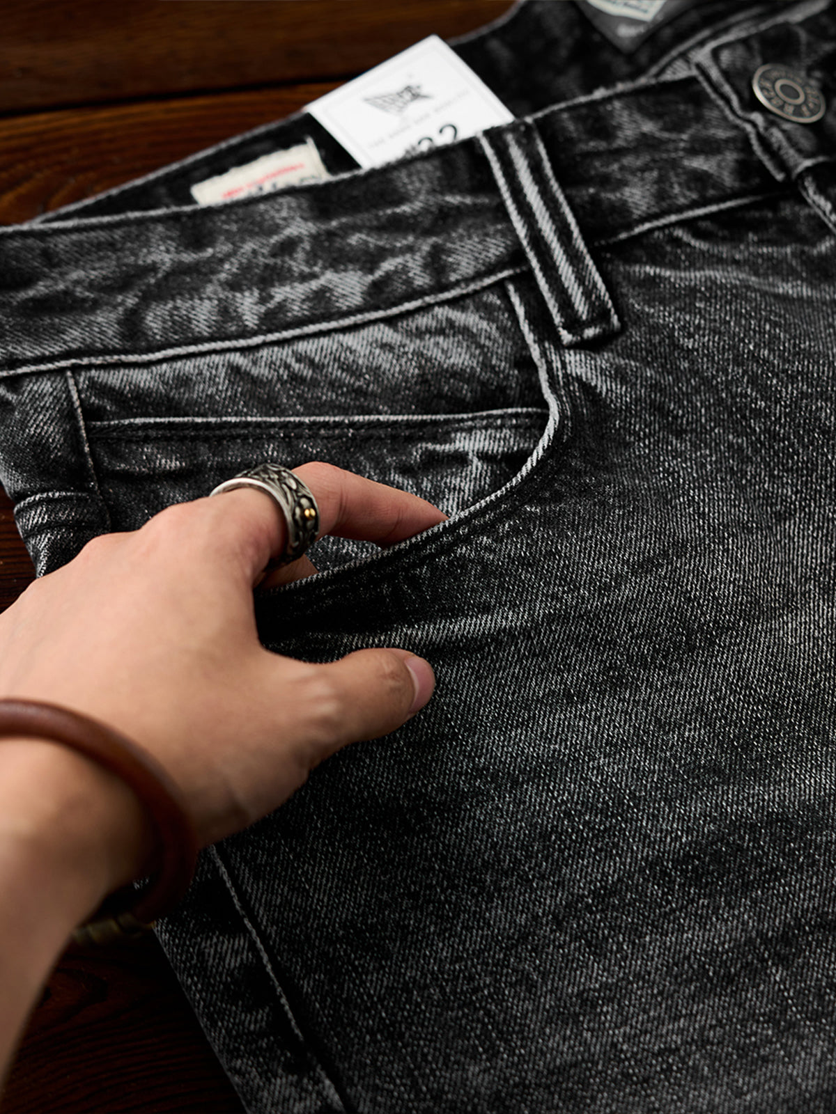 The black denim fabric features white fade processing, emphasizing a strong vintage feel. Fading on the front and thighs adds depth and movement. The straight-fit silhouette offers a relaxed feel without being as wide as the latest wide-leg trend. A leather patch with embossed details highlights both vintage appeal and high-quality craftsmanship. The hem maintains a clean, simple, and refined line.
