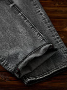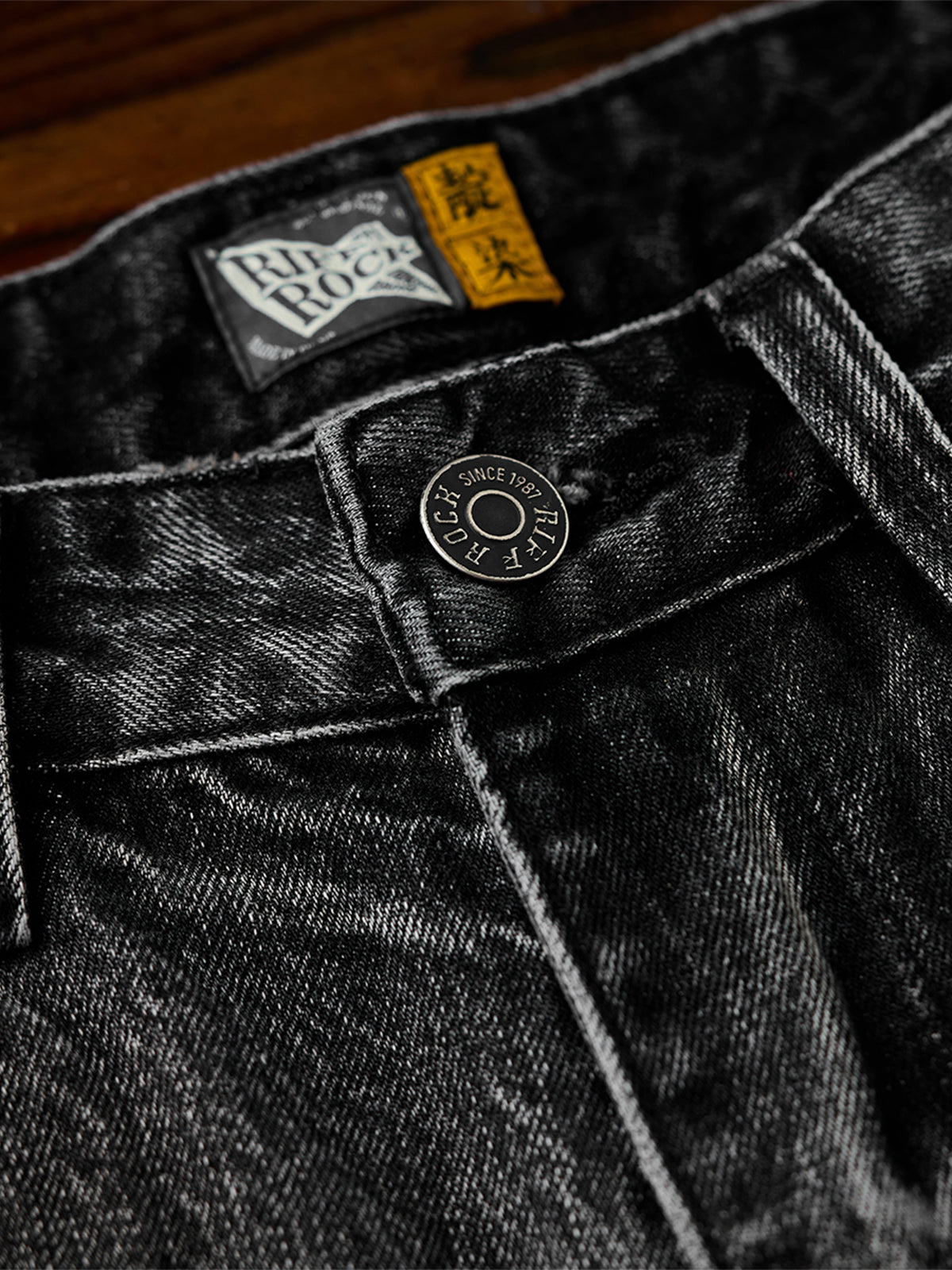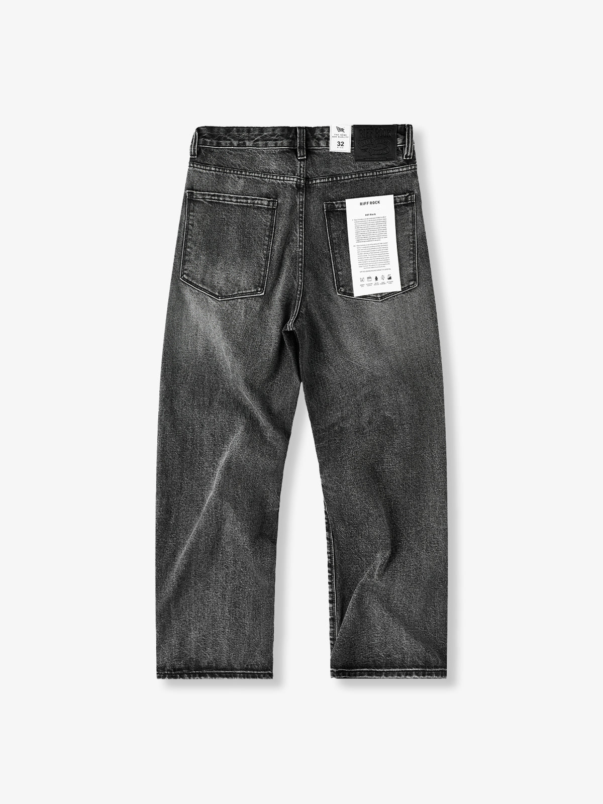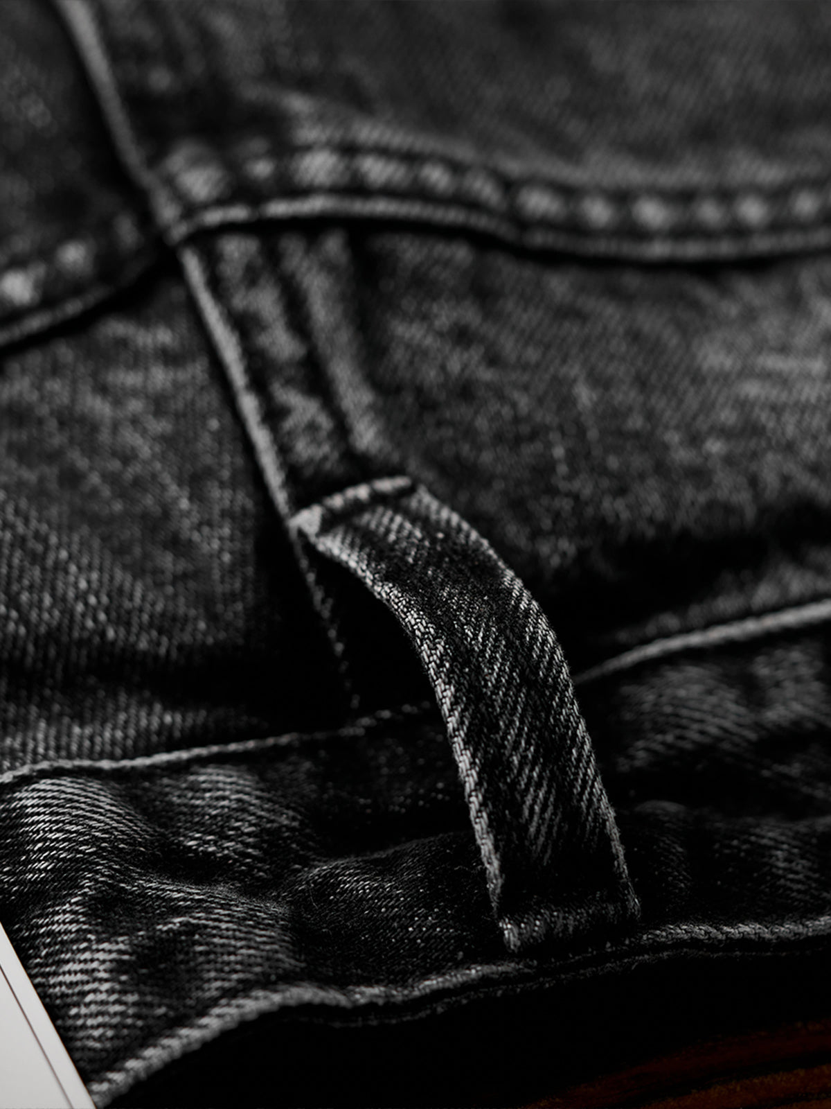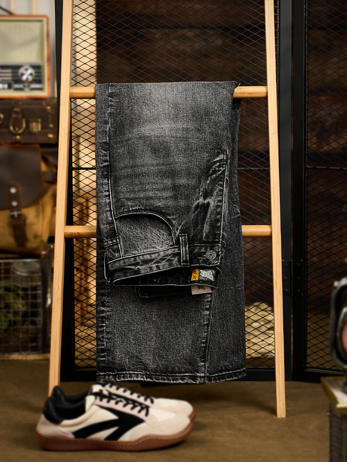 The black denim fabric features white fade processing, emphasizing a strong vintage feel. Fading on the front and thighs adds depth and movement. The straight-fit silhouette offers a relaxed feel without being as wide as the latest wide-leg trend. A leather patch with embossed details highlights both vintage appeal and high-quality craftsmanship. The hem maintains a clean, simple, and refined line.