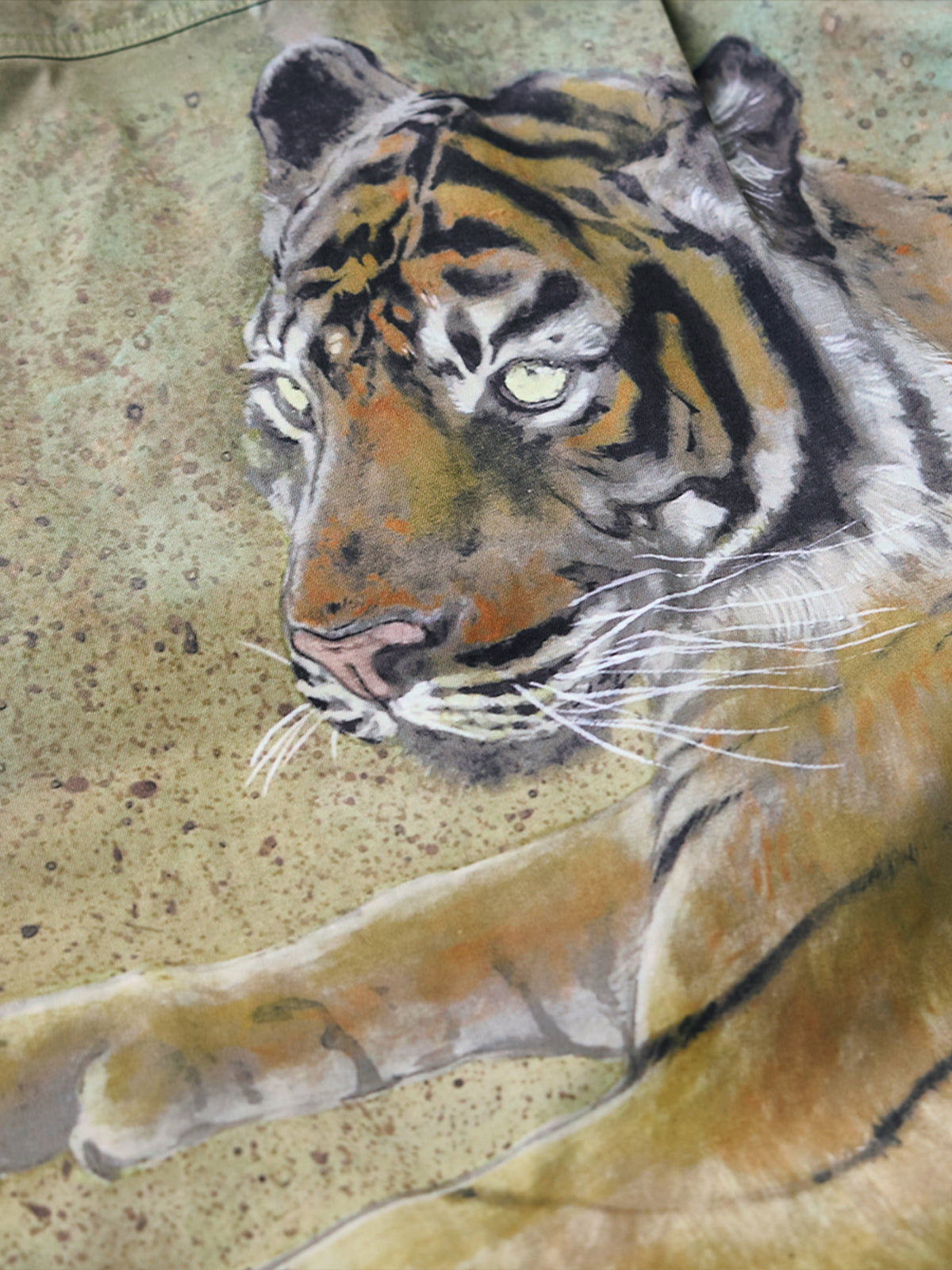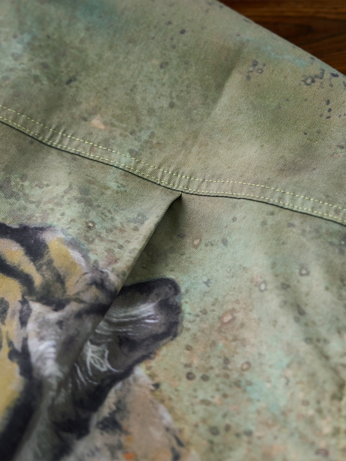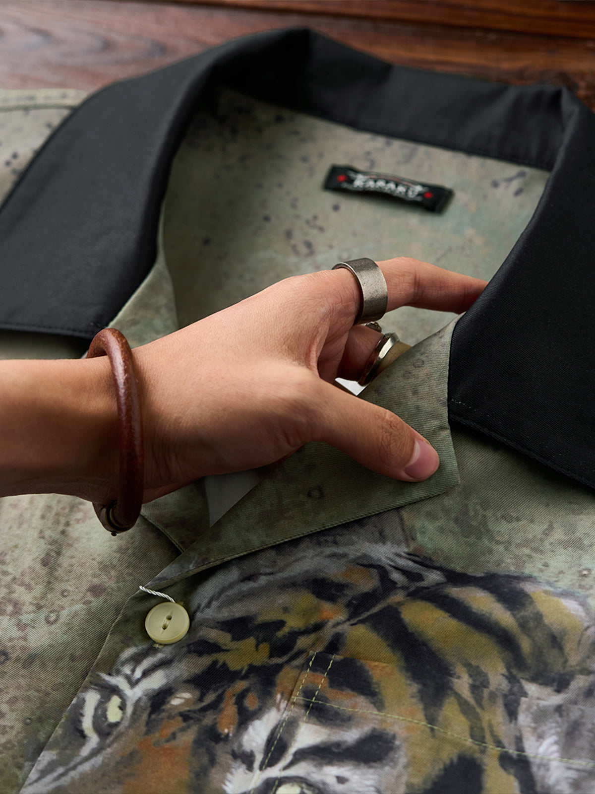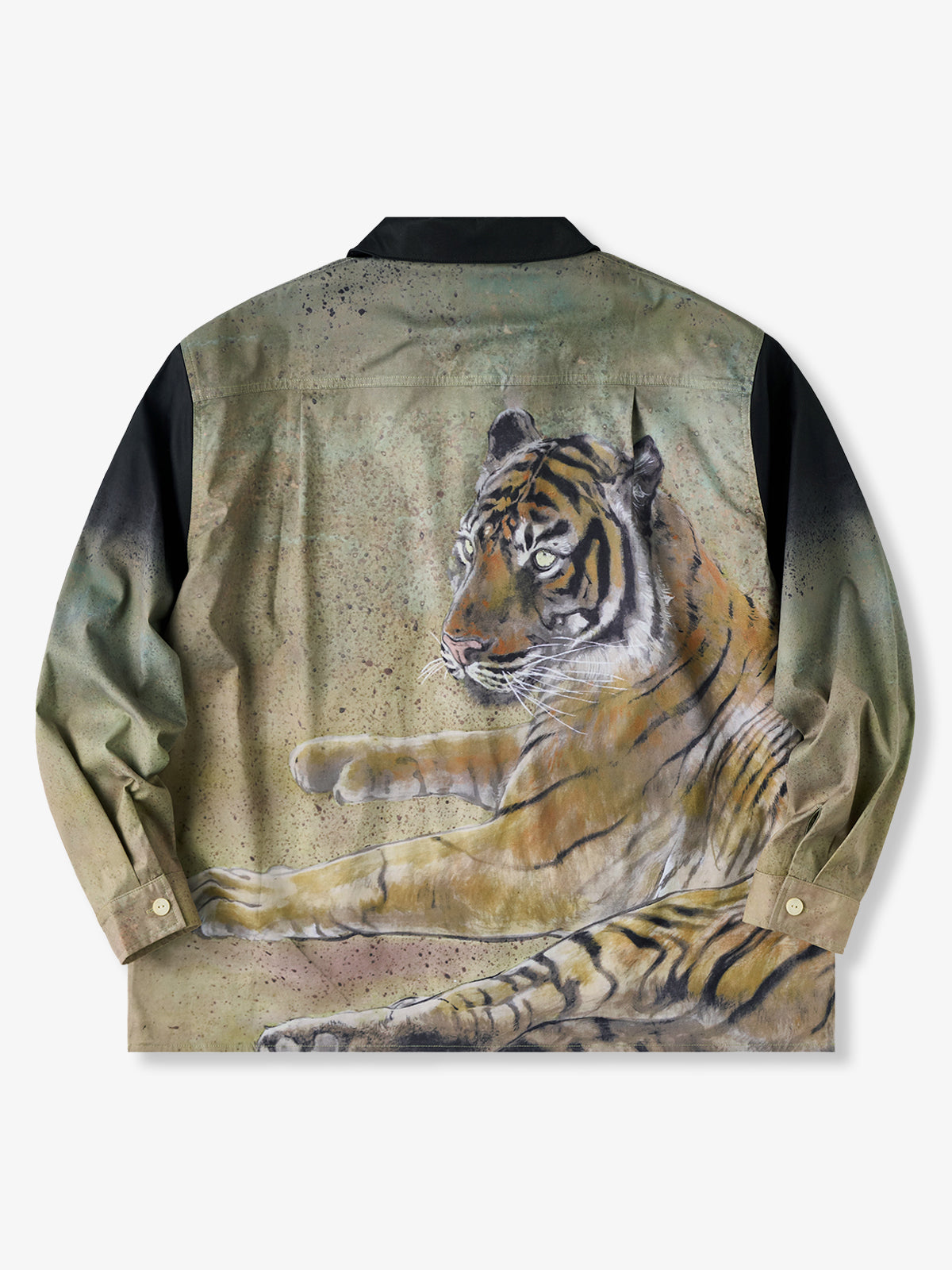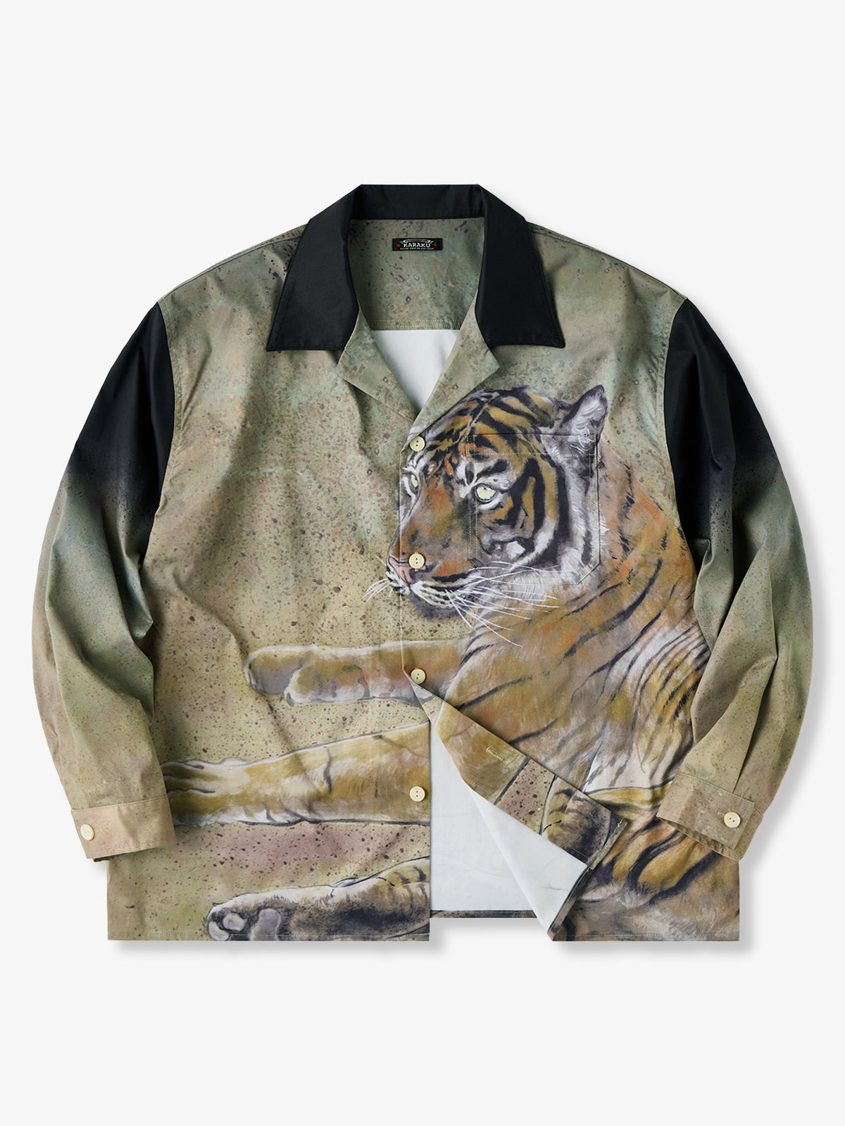 This exclusive open-collar shirt is the result of a collaboration with Japanese painter Satoshi Kawamata. Featuring his renowned work “Tiger Illustration”, the piece vividly depicts a tiger crouching low yet radiating a piercing gaze. The bold and lifelike brushstrokes bring a dynamic sense of movement, as if the animal might spring to life at any moment. A sharp black collar and gradient black sleeves add a modern and sophisticated edge, fusing art with fashion in a shirt that easily becomes the centerpiece of any look.