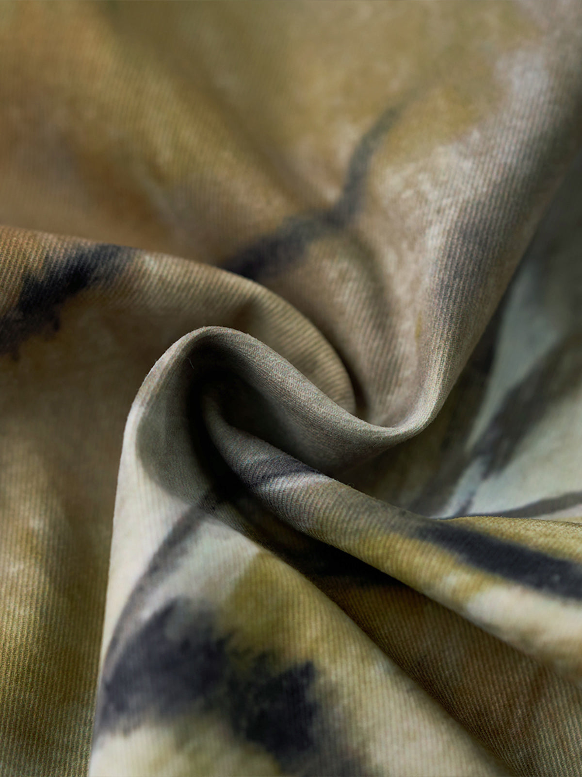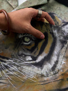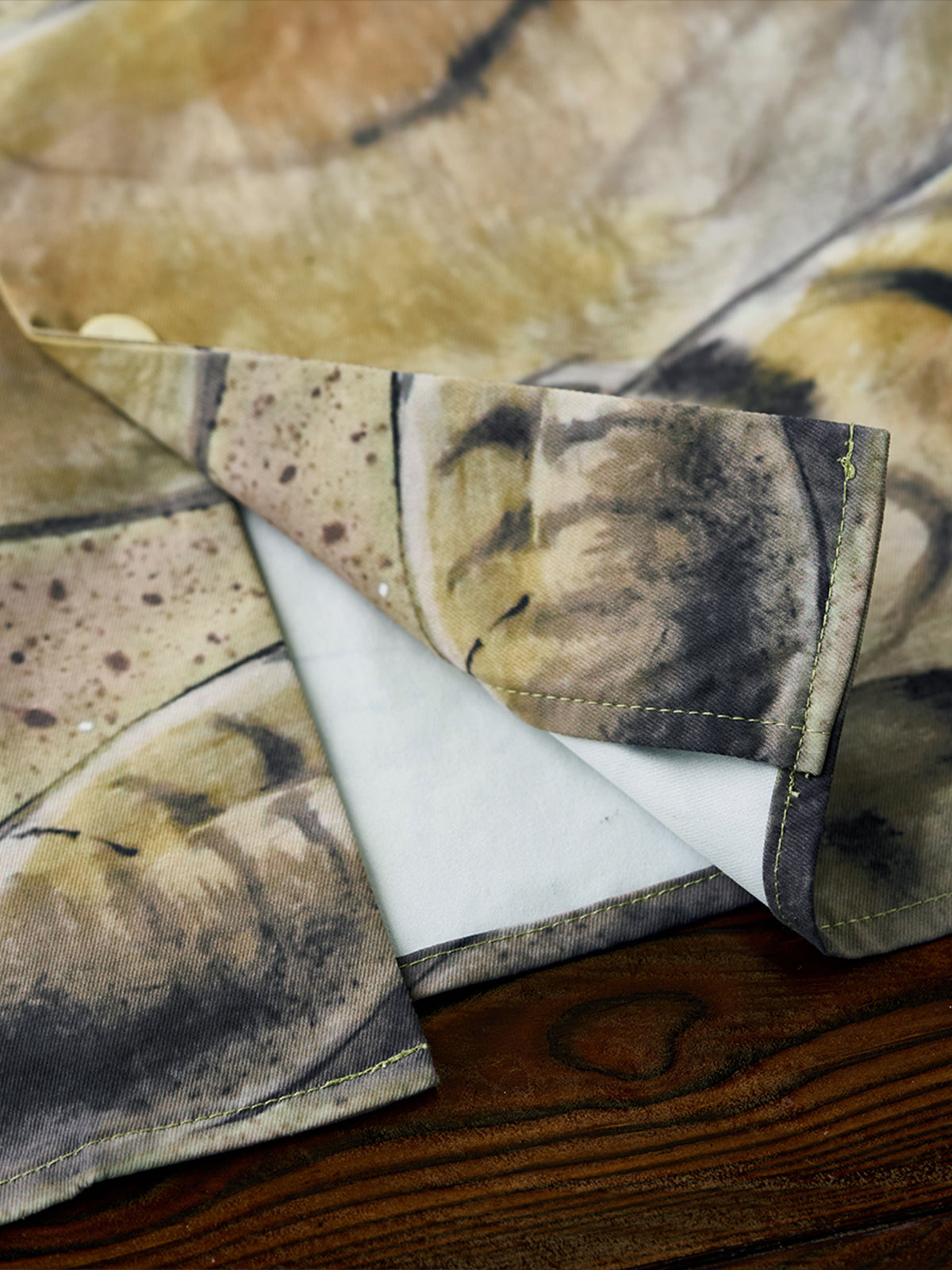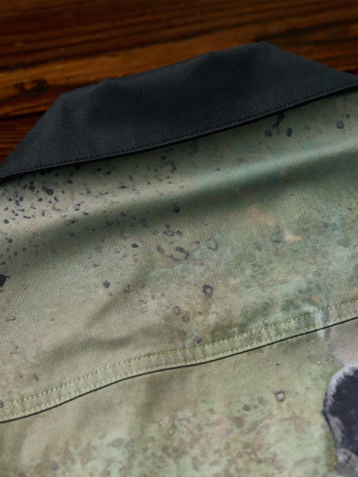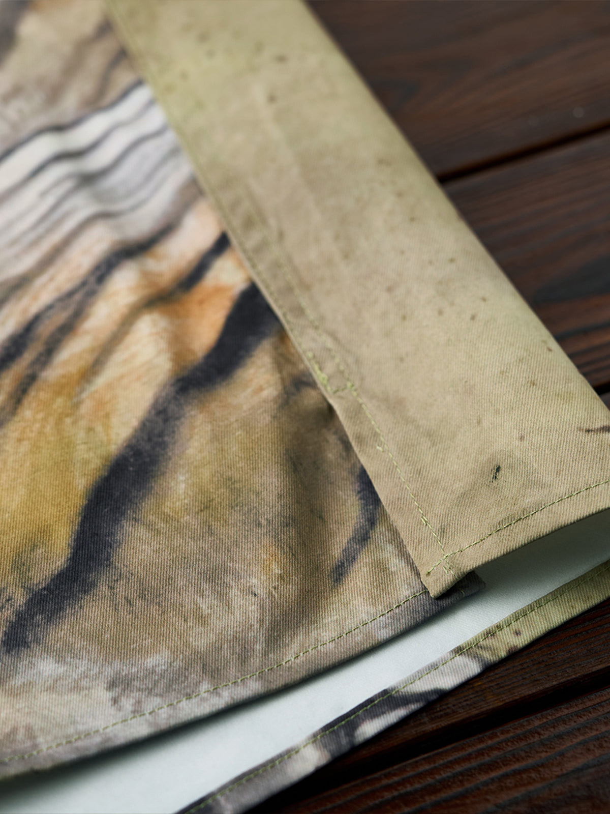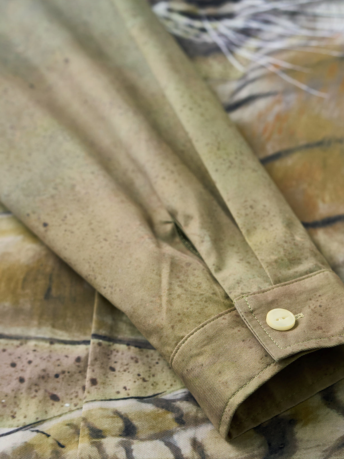 This exclusive open-collar shirt is the result of a collaboration with Japanese painter Satoshi Kawamata. Featuring his renowned work “Tiger Illustration”, the piece vividly depicts a tiger crouching low yet radiating a piercing gaze. The bold and lifelike brushstrokes bring a dynamic sense of movement, as if the animal might spring to life at any moment. A sharp black collar and gradient black sleeves add a modern and sophisticated edge, fusing art with fashion in a shirt that easily becomes the centerpiece of any look.