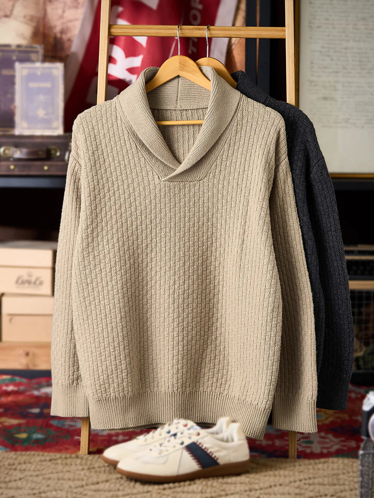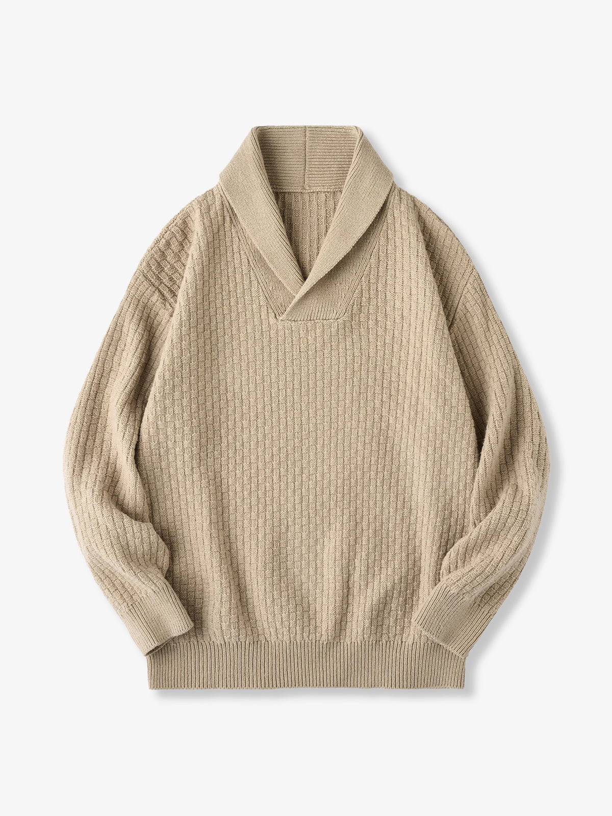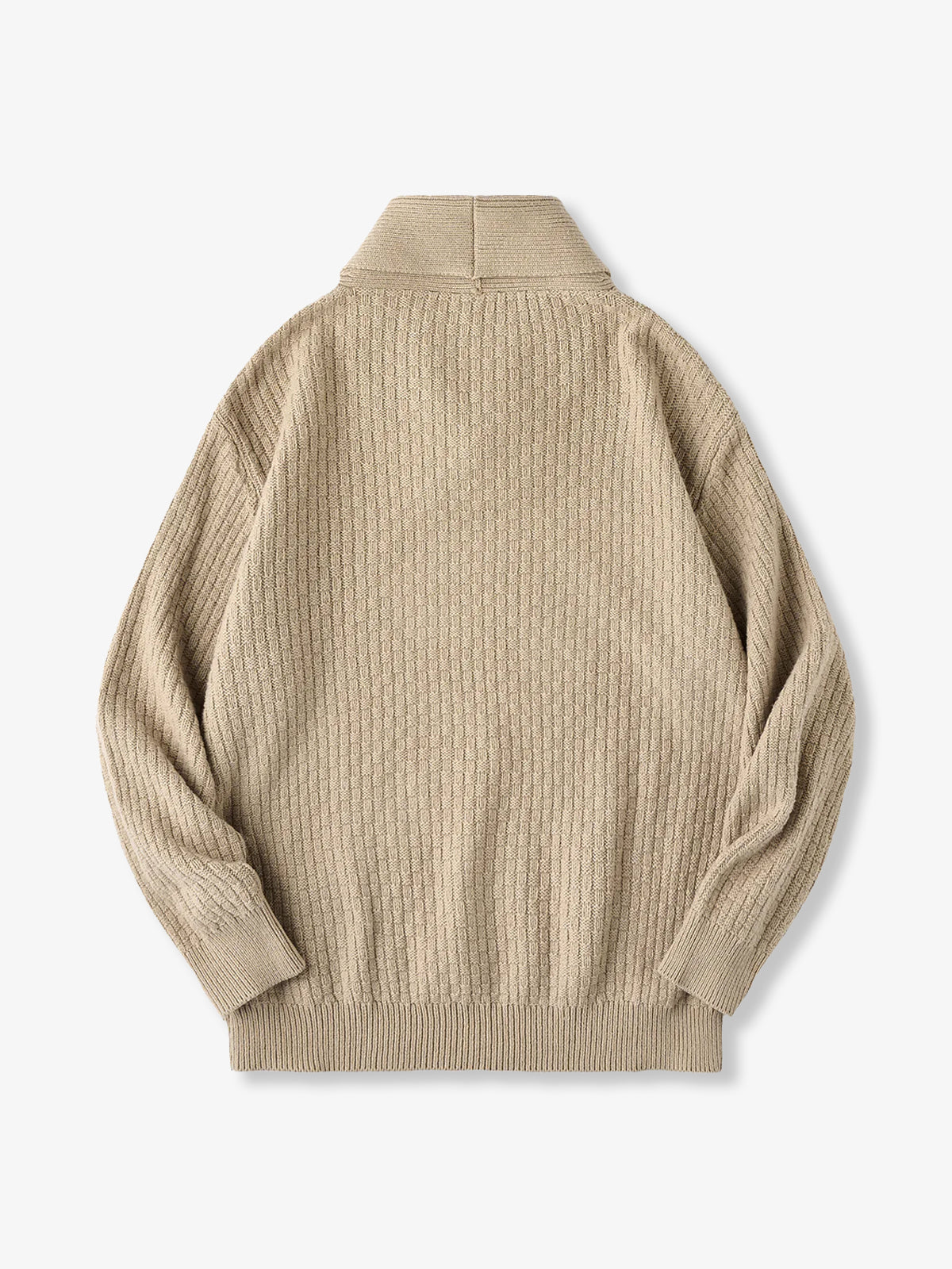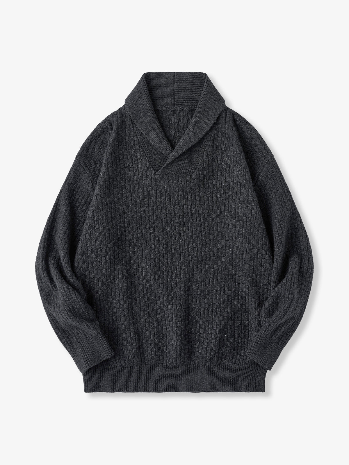 Wool-Blend Check Jacquard Shawl-Collar Knit Sweater