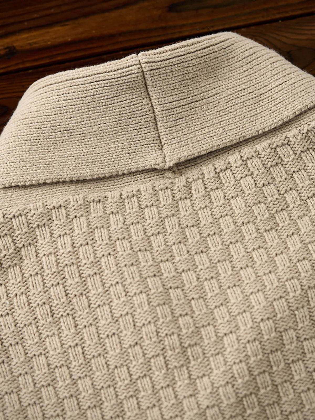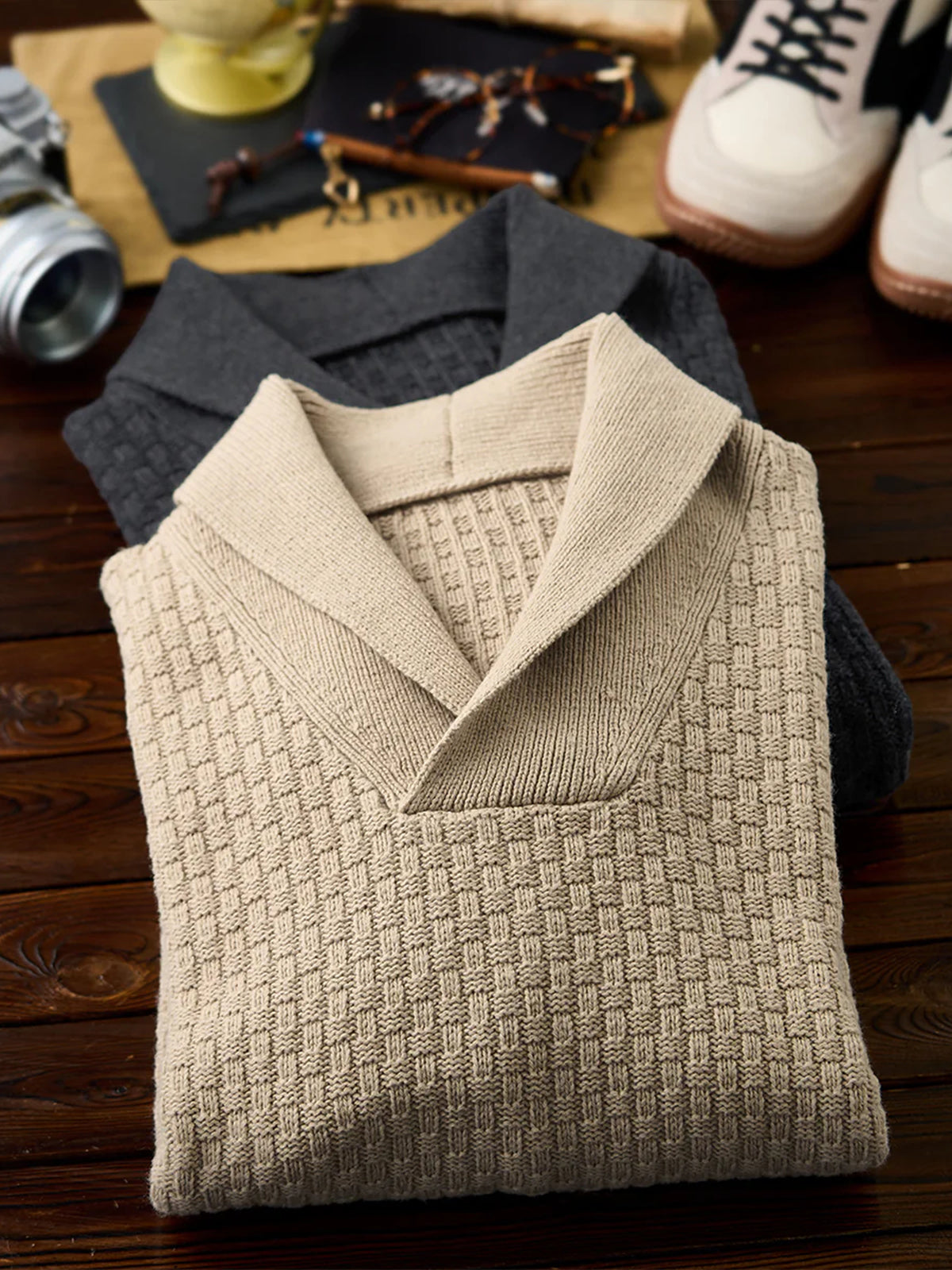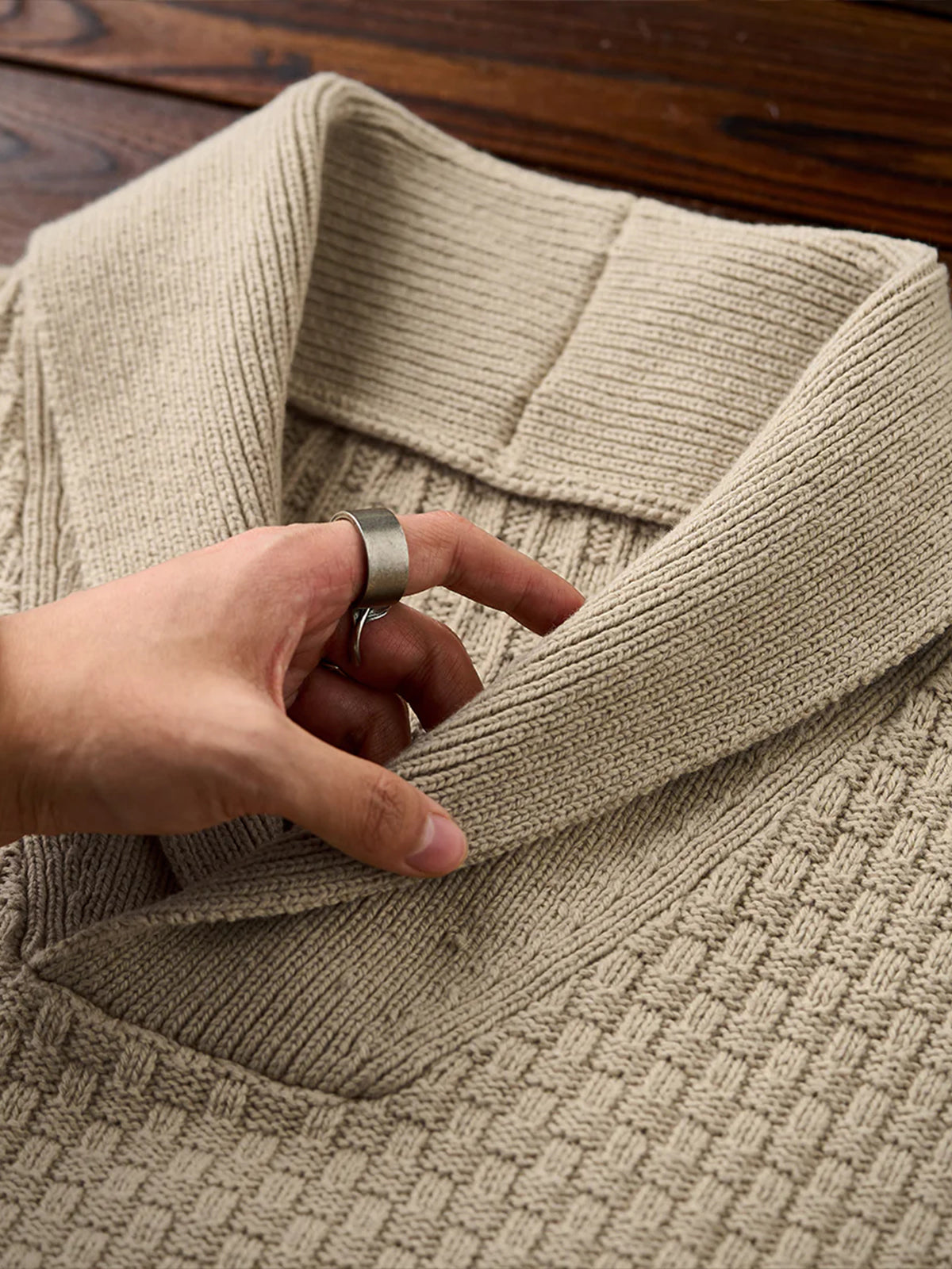 Wool-Blend Check Jacquard Shawl-Collar Knit Sweater