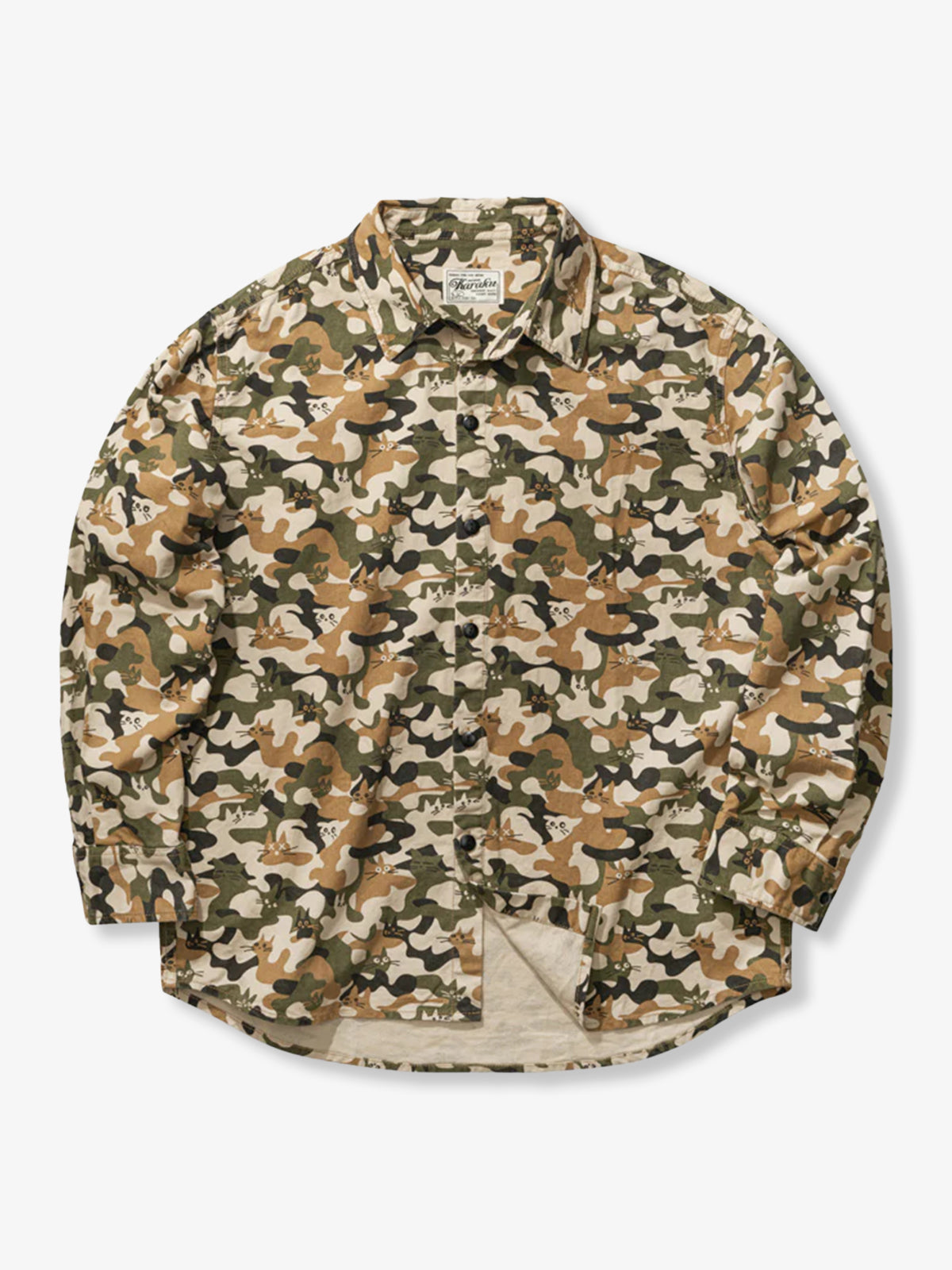 This military-style work shirt features a unique camouflage design, seamlessly integrating cat patterns to mimic their natural fur tones, including browns, greens, and blacks. Made from breathable cotton, it offers excellent moisture-wicking and quick-drying properties, ensuring comfort. Perfect for town outings or outdoor adventures, this stylish shirt adds a trendy touch to any wardrobe.