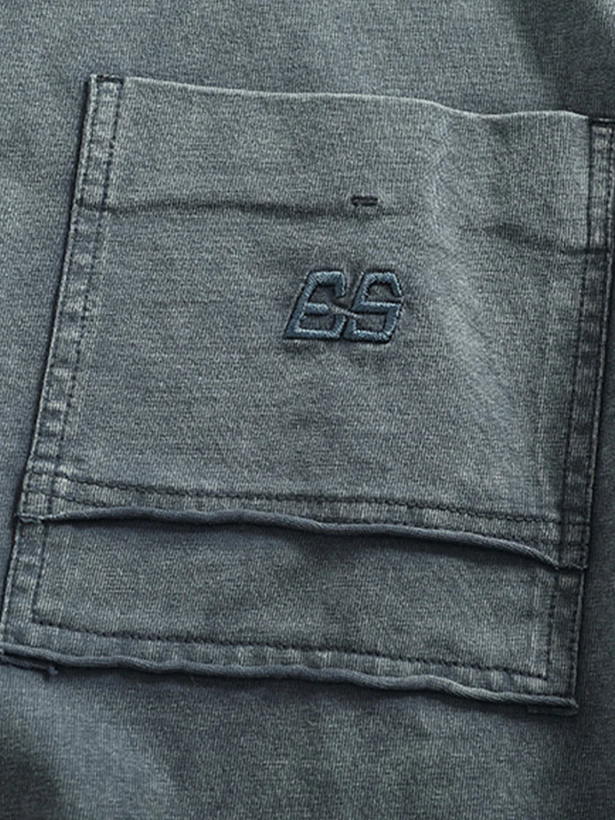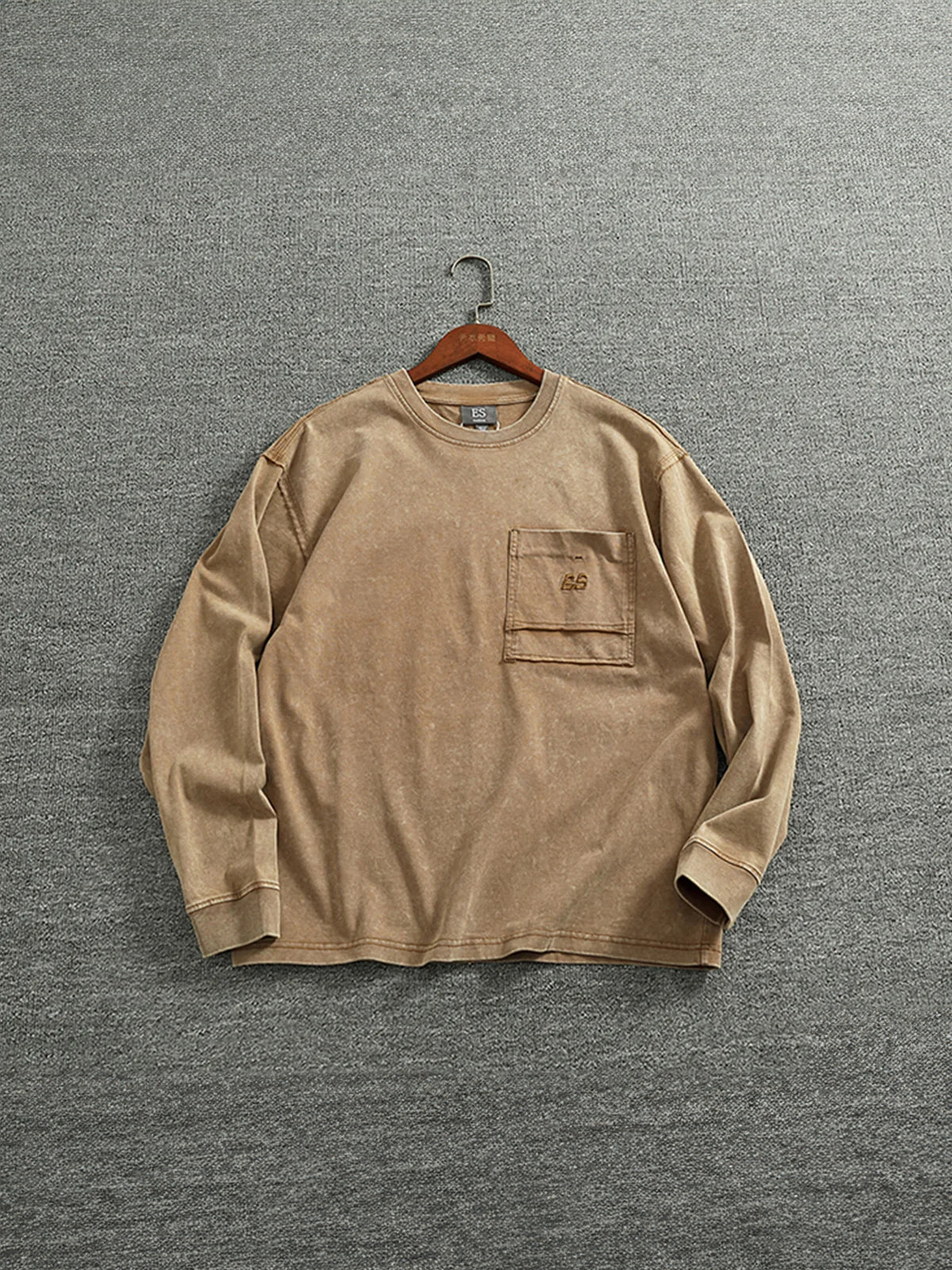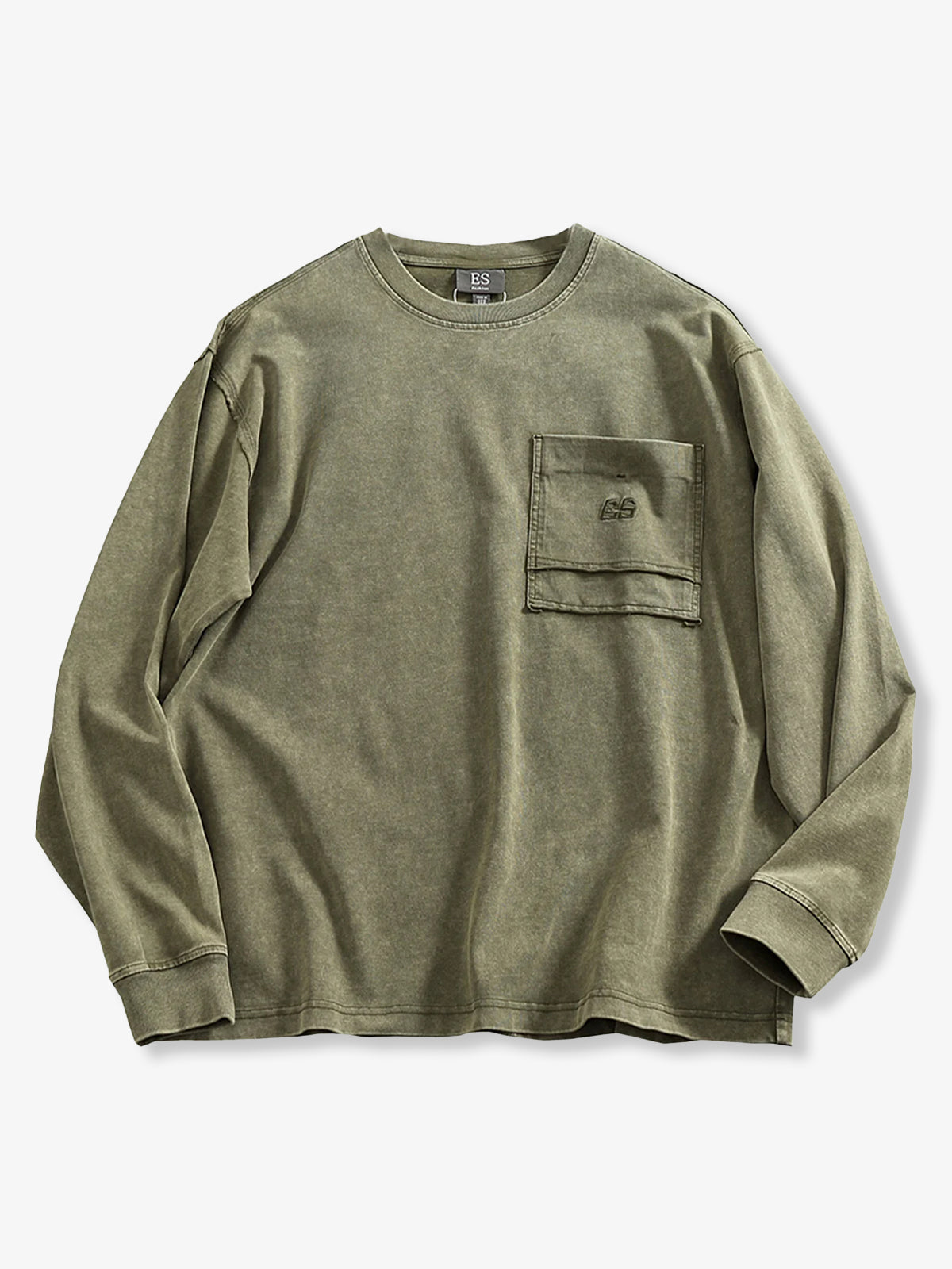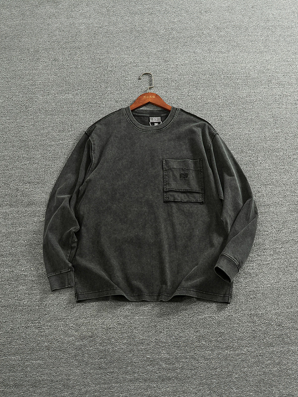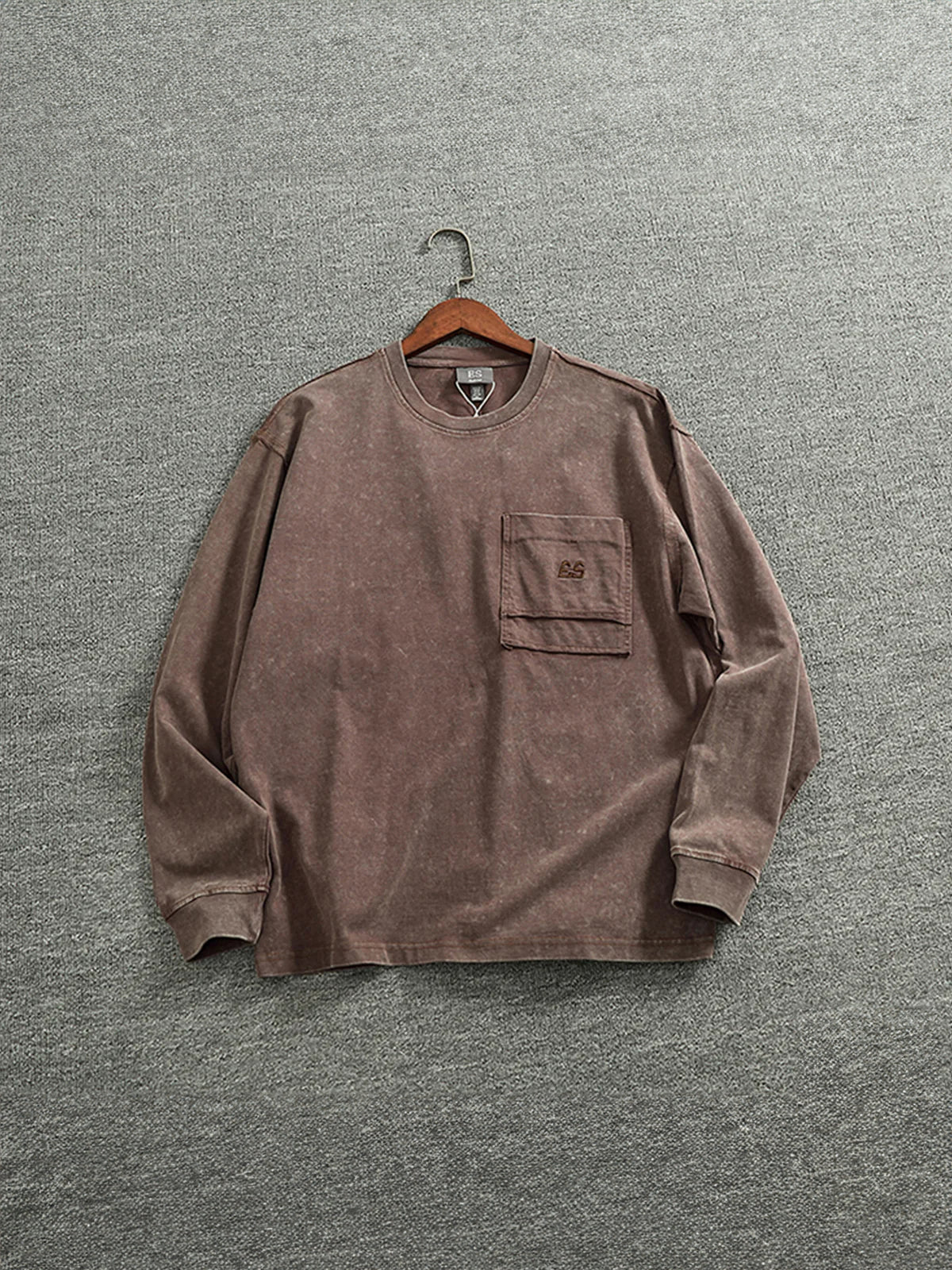 Washed Finish Mini Embroidery & Color-Variation Pocket Long Sleeve Tee