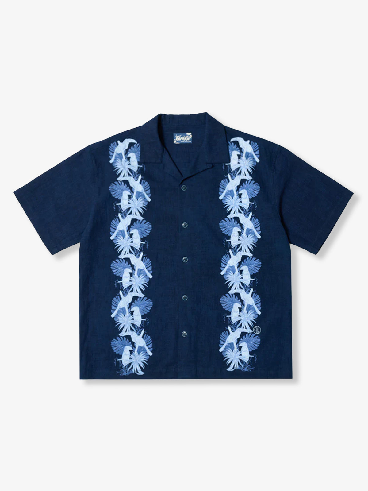 "Indigo-Dyed Series" Cotton-Linen Aloha Shirt with Toucan & Monstera Print