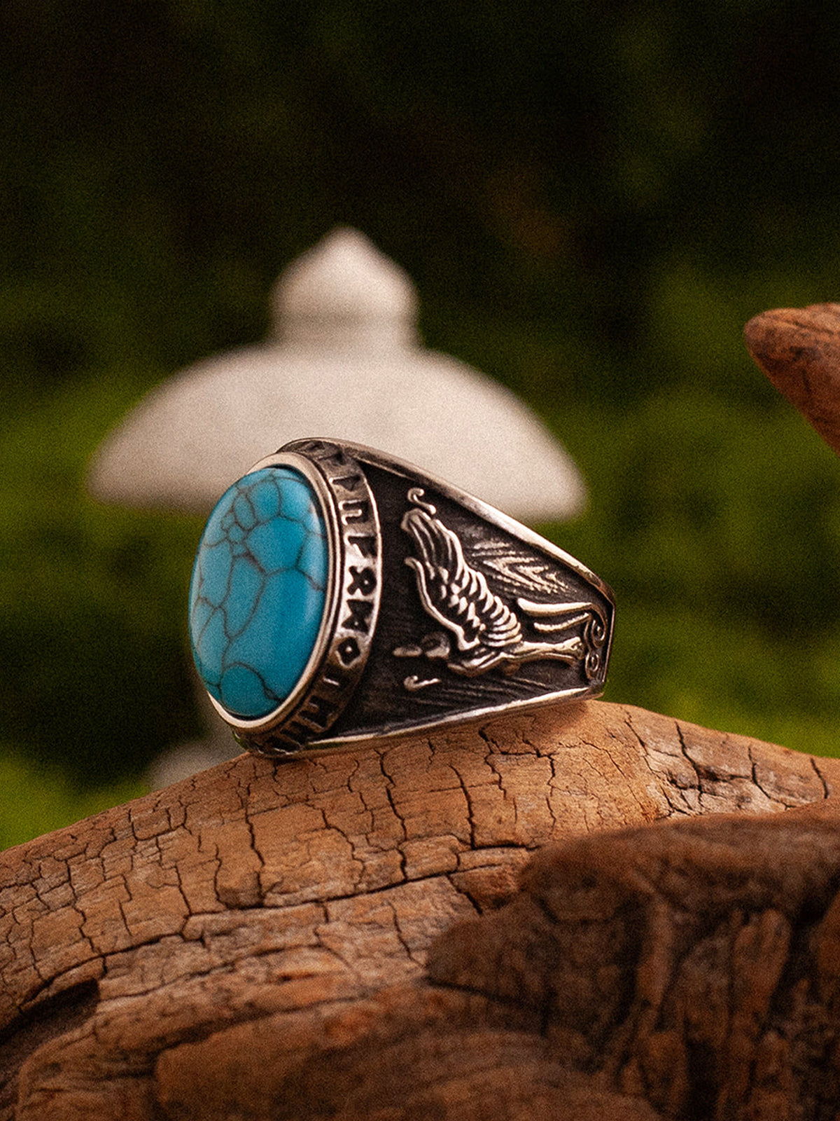 Rune & Beast Engraved Titanium Steel Ring with Turquoise