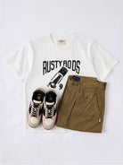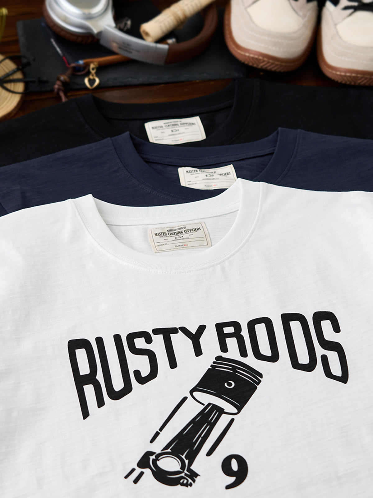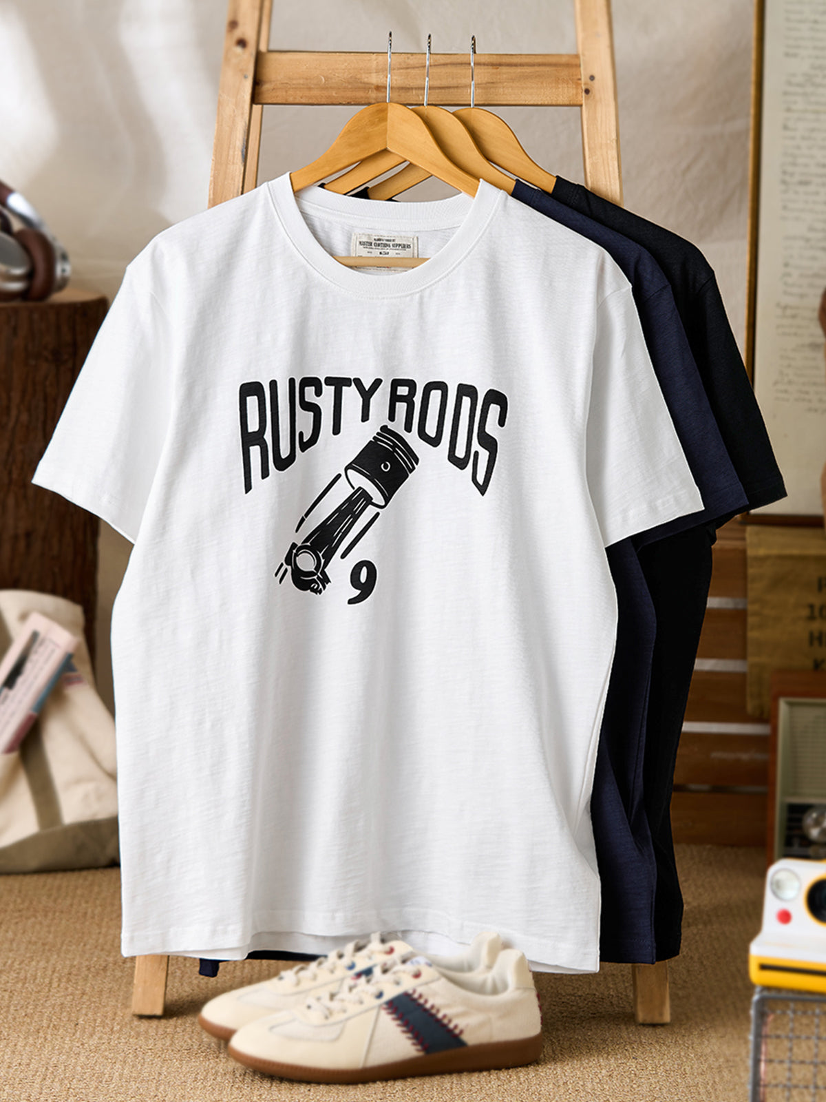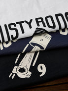 A graphic T-shirt inspired by West Coast American custom car culture, centered around the concept of “Rusty Rods” — a term referring to old, weathered yet highly personalized modified cars. It represents freedom, mechanical aesthetics, and raw vintage attitude. Combined with piston and engine-inspired graphics, the design pays tribute to classic garage culture and American hot-rod spirit.