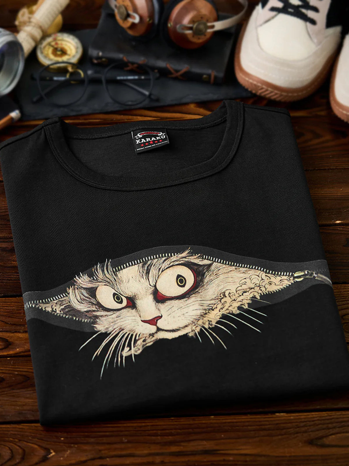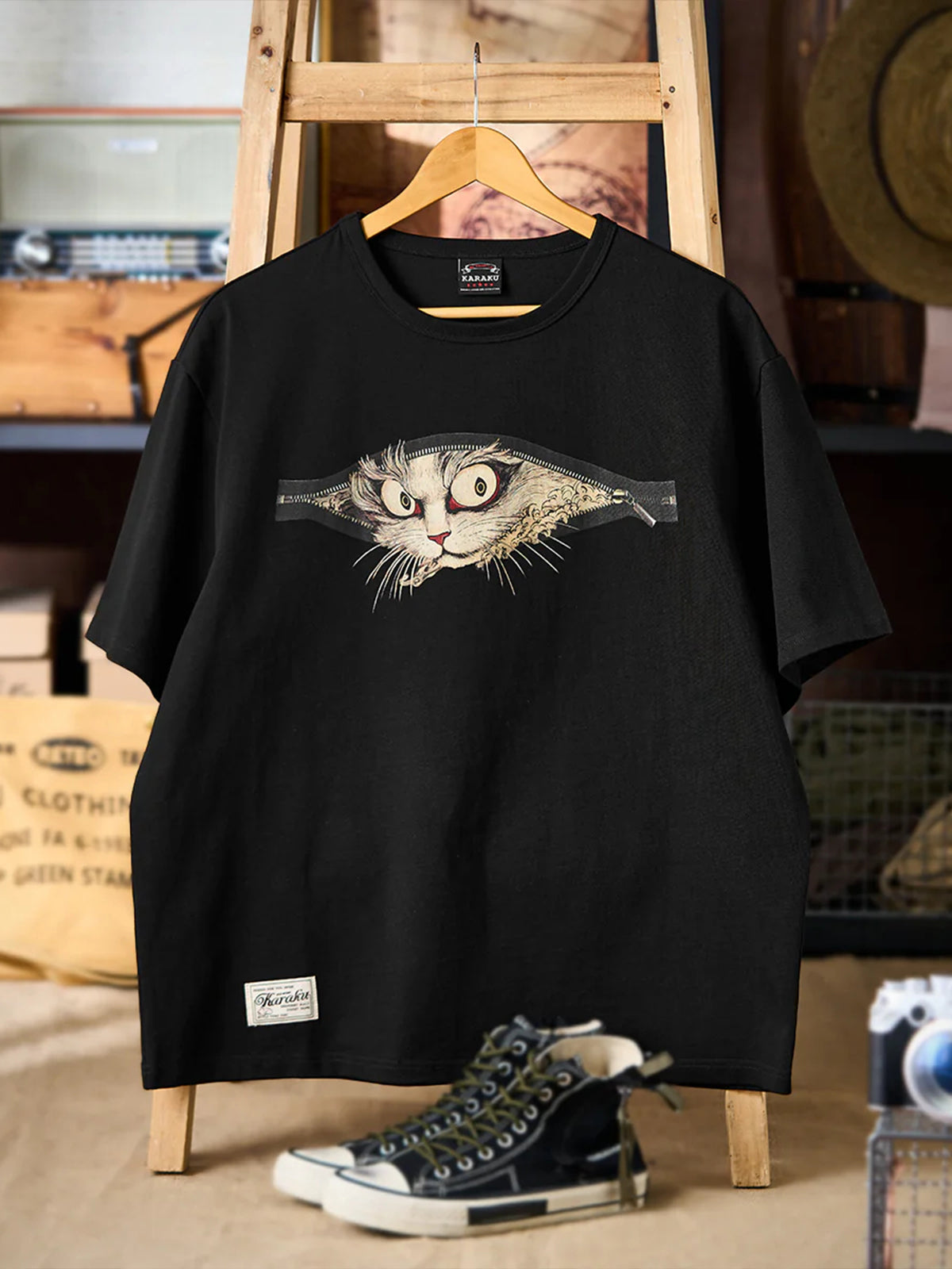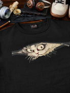 [Pre-Order] “Bakeneko Peering Through a Cross Zip” Ukiyo-e Style Print T-Shirt