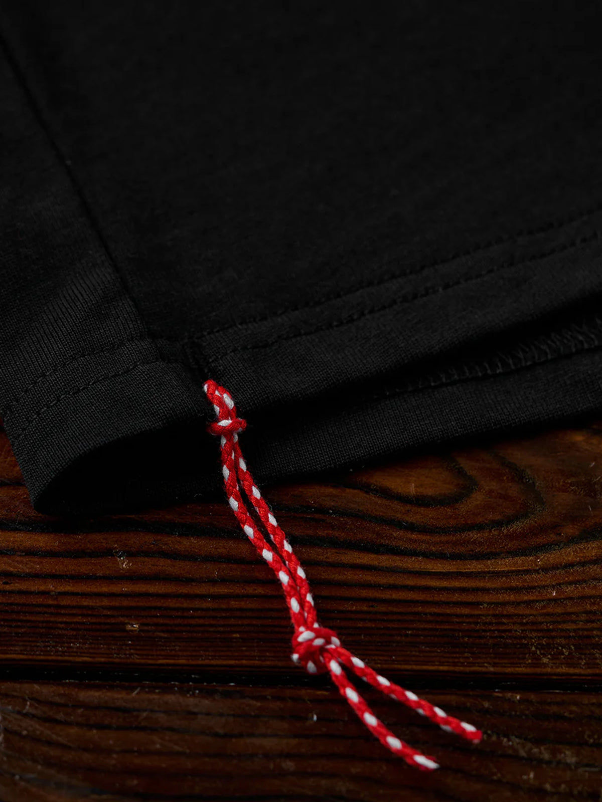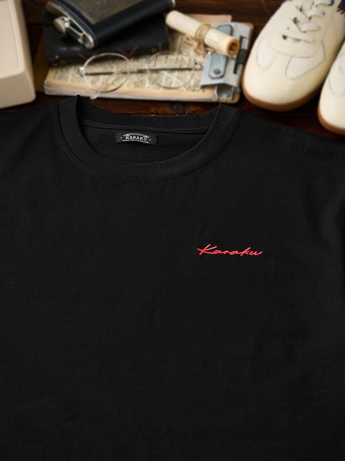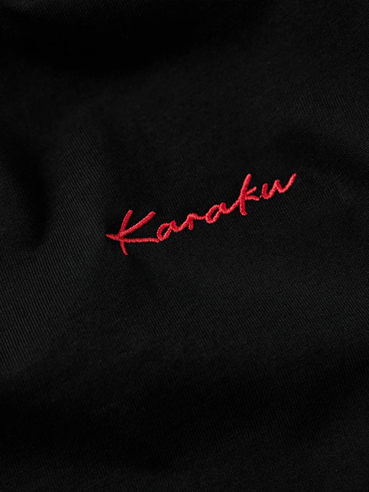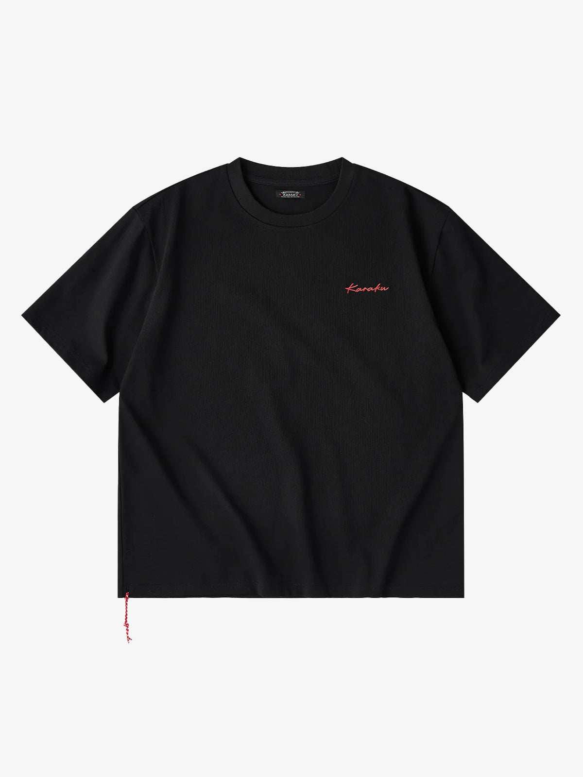 [Pre-Order] Black Cotton Tee with “KaraKu” Logo Embroidery and Red & White Drawstrings