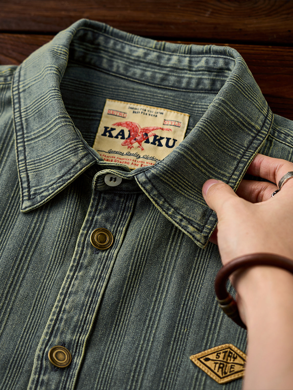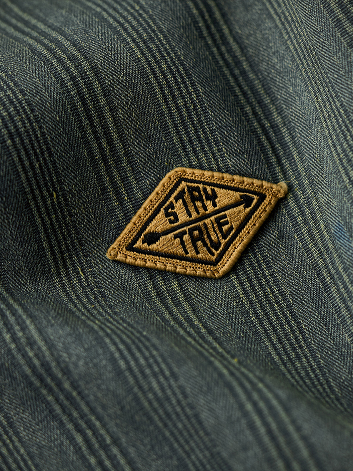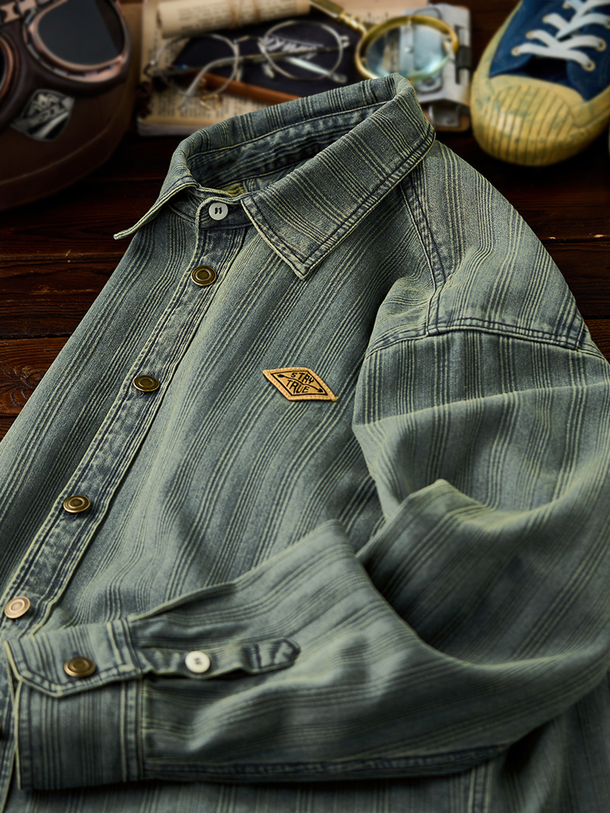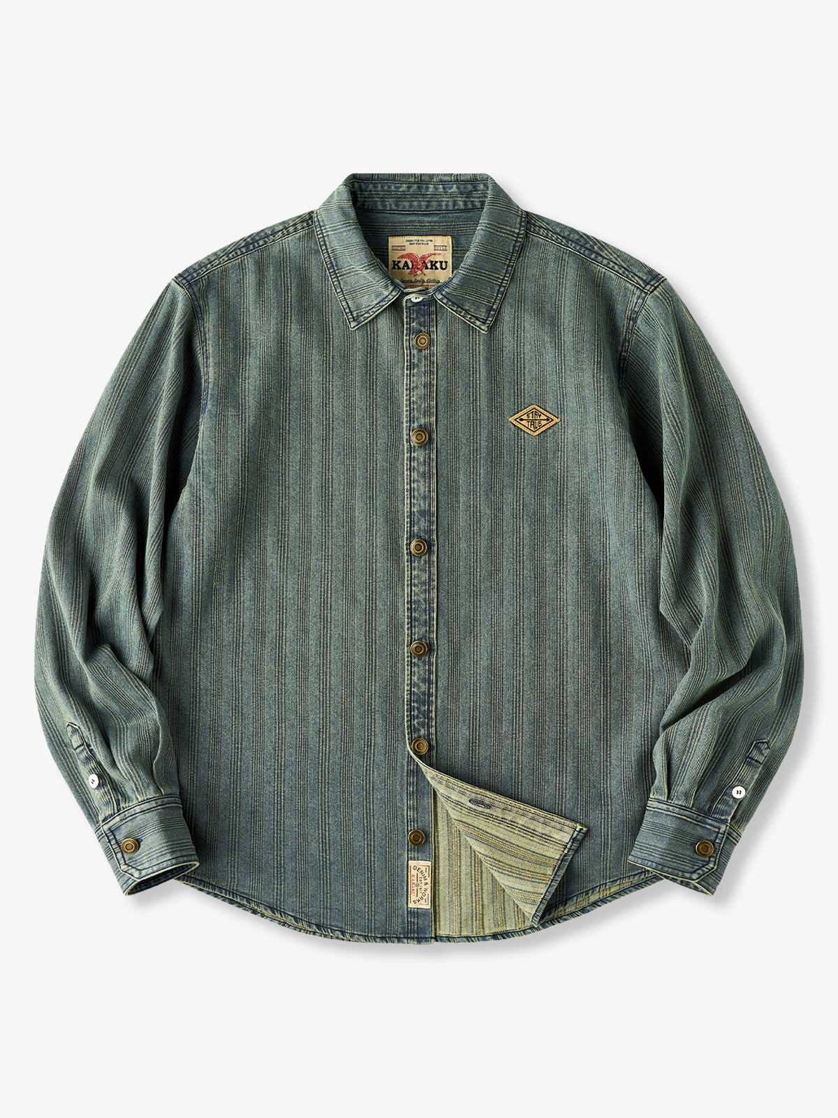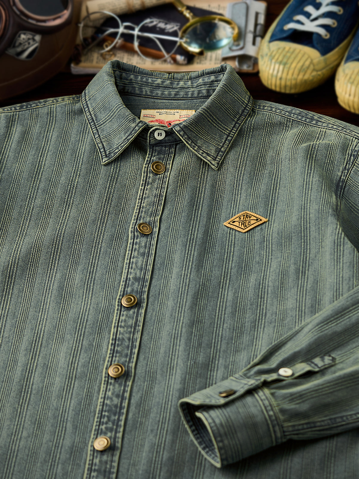 The left chest features a "STAY TRUE" embroidered patch, adding a unique, retro accent. A branded tag is stitched at the hem, highlighting fine craftsmanship. The relaxed fit ensures ease of movement and all-day comfort, while multi-button cuffs allow adjustable fit. The denim fabric offers durability and a vintage-inspired texture. Woven stripe details create visual depth and a sense of premium quality.