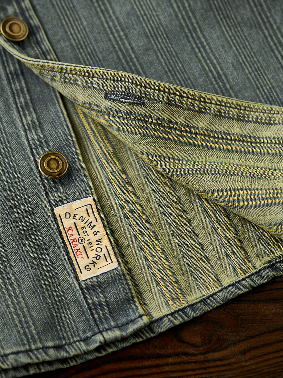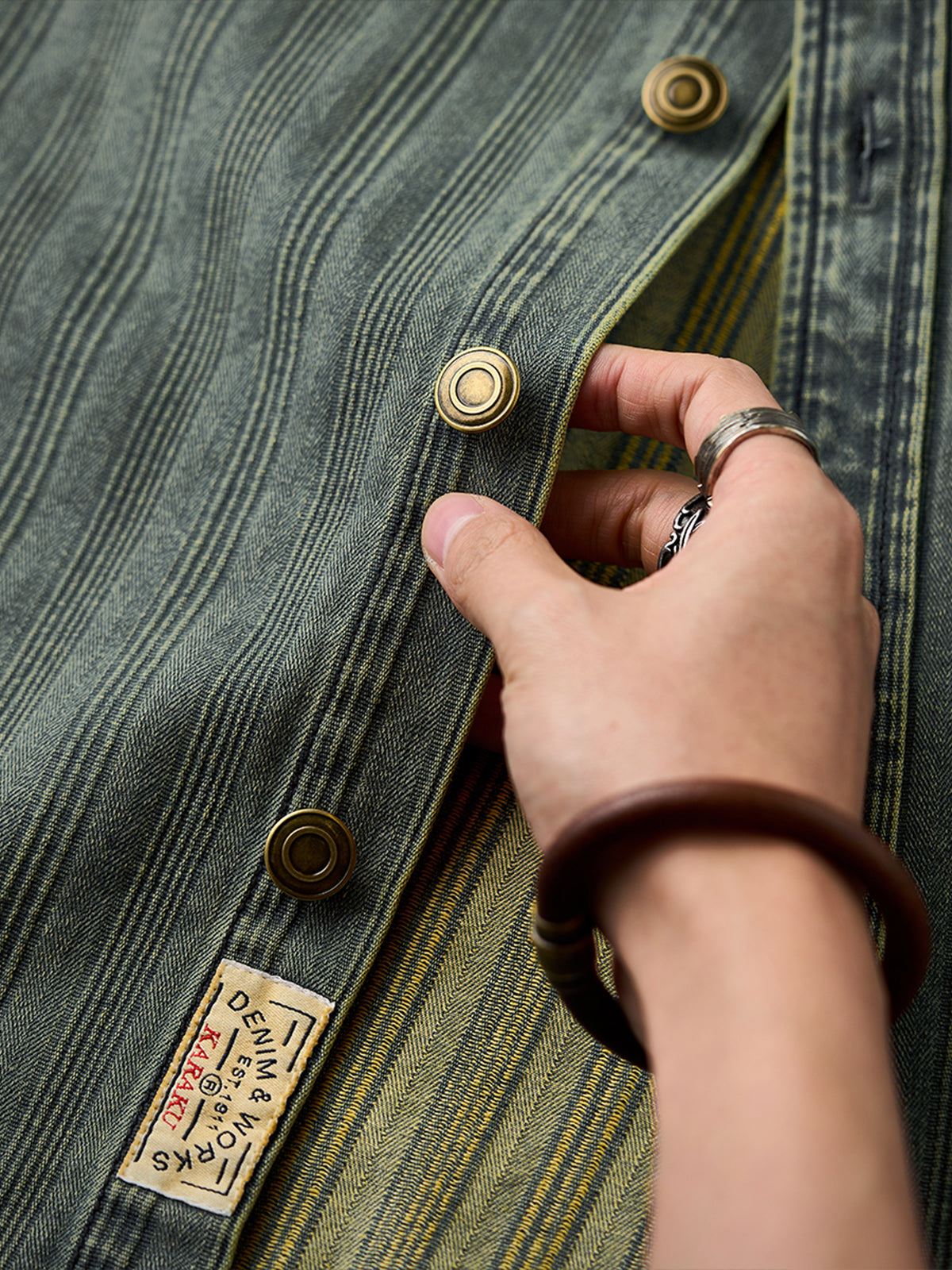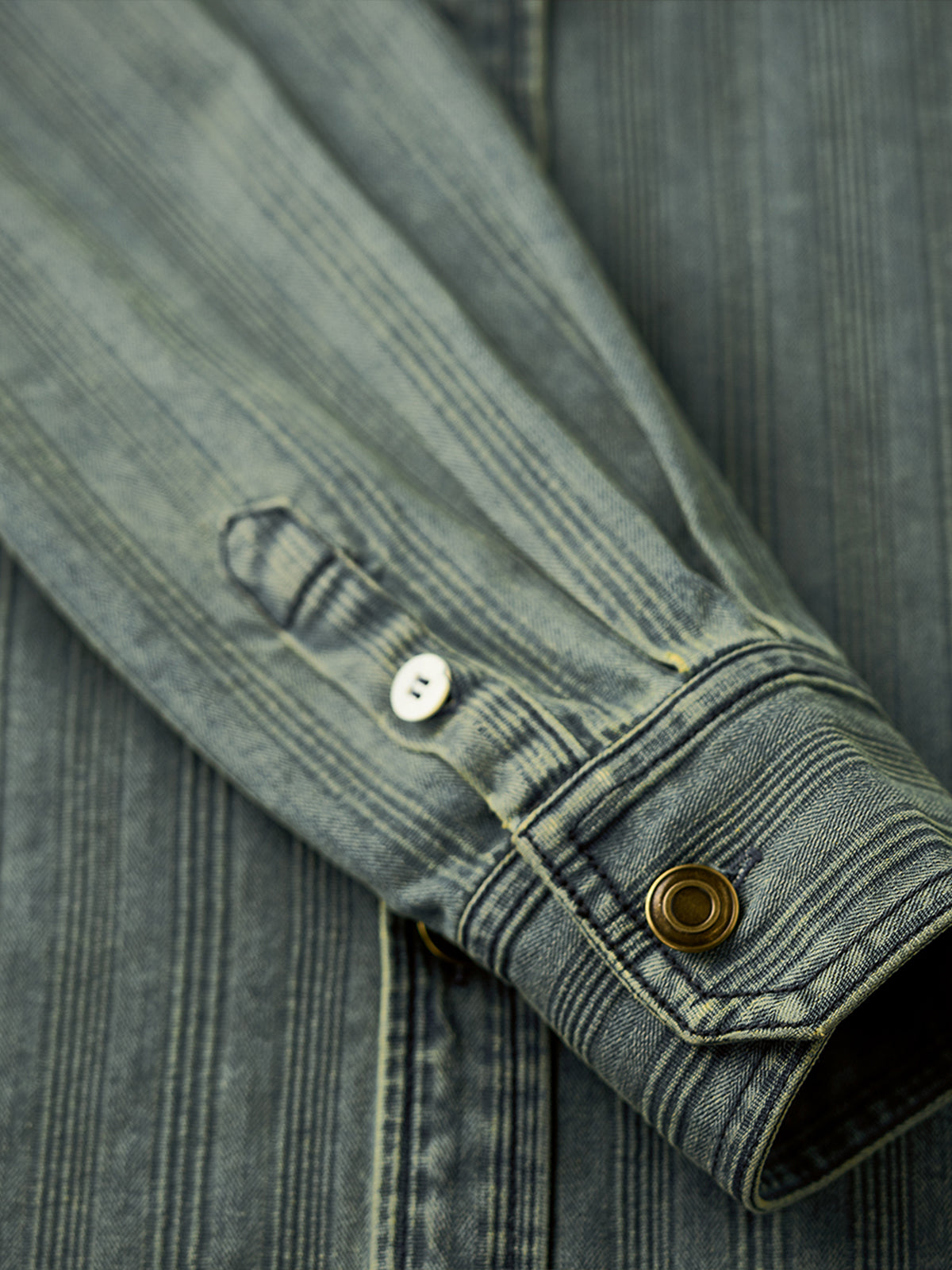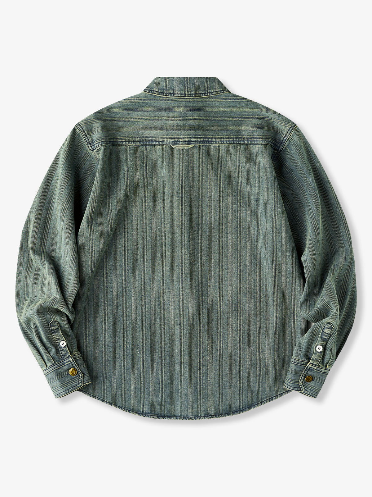 The left chest features a "STAY TRUE" embroidered patch, adding a unique, retro accent. A branded tag is stitched at the hem, highlighting fine craftsmanship. The relaxed fit ensures ease of movement and all-day comfort, while multi-button cuffs allow adjustable fit. The denim fabric offers durability and a vintage-inspired texture. Woven stripe details create visual depth and a sense of premium quality.