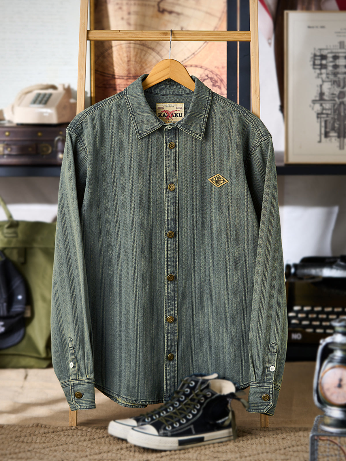 [Pre-order] "STAY TRUE" Embroidered Patch Stripe Texture Long-Sleeve Denim Shirt