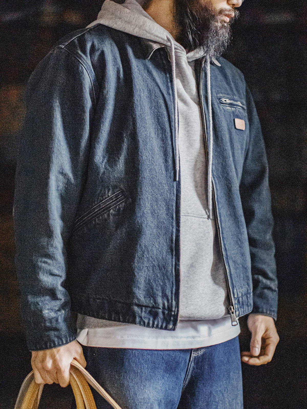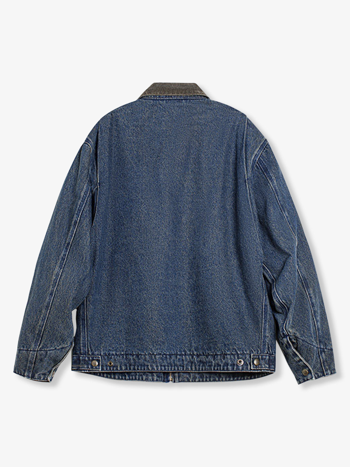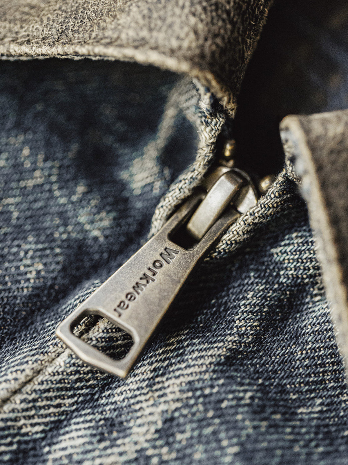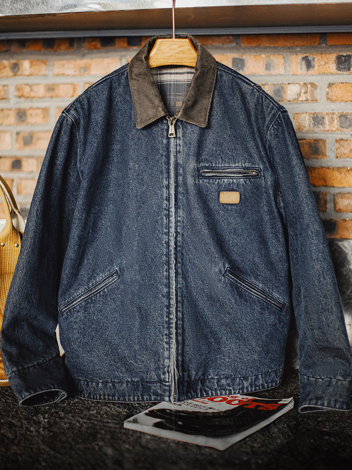 Building on the classic denim jacket, this upgraded version incorporates signature Detroit jacket elements for double the vintage appeal. The short, straight-cut silhouette and back accordion pleats preserve the clean structure of a Detroit jacket, while washed and distressed denim adds a lived-in, nostalgic character that develops unique folds and color with wear. A suede-like contrast collar enhances texture and detail, while a custom metal zipper ensures smooth, durable closure. Sturdy yet lightweight, this jacket blends retro style with modern comfort, making it a versatile piece for everyday wear.
