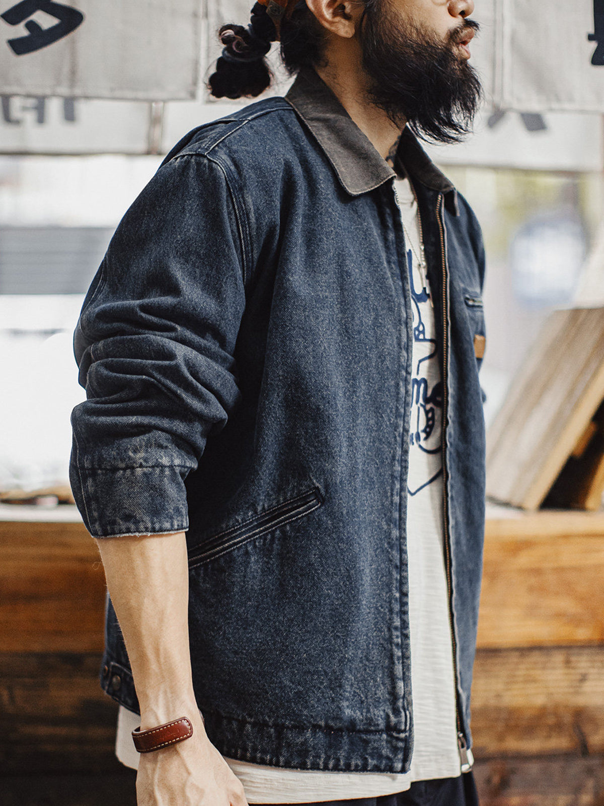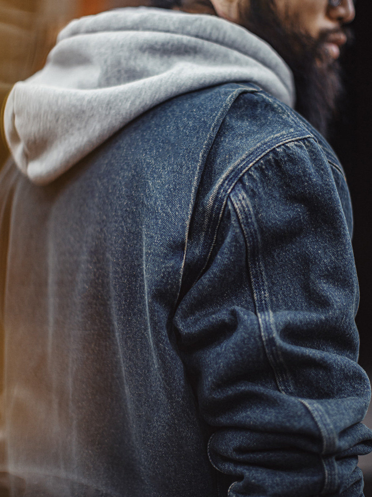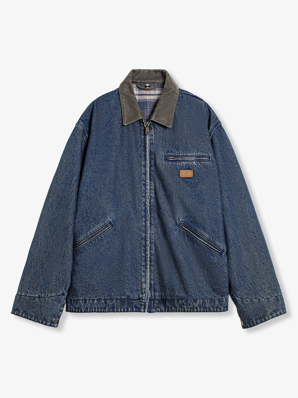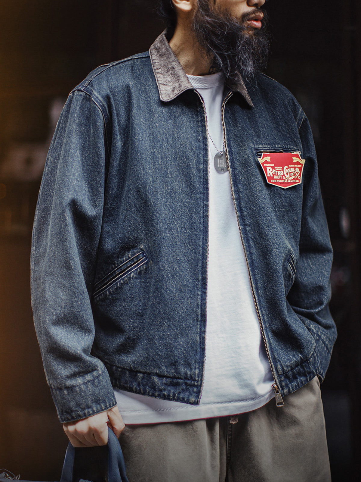 Building on the classic denim jacket, this upgraded version incorporates signature Detroit jacket elements for double the vintage appeal. The short, straight-cut silhouette and back accordion pleats preserve the clean structure of a Detroit jacket, while washed and distressed denim adds a lived-in, nostalgic character that develops unique folds and color with wear. A suede-like contrast collar enhances texture and detail, while a custom metal zipper ensures smooth, durable closure. Sturdy yet lightweight, this jacket blends retro style with modern comfort, making it a versatile piece for everyday wear.