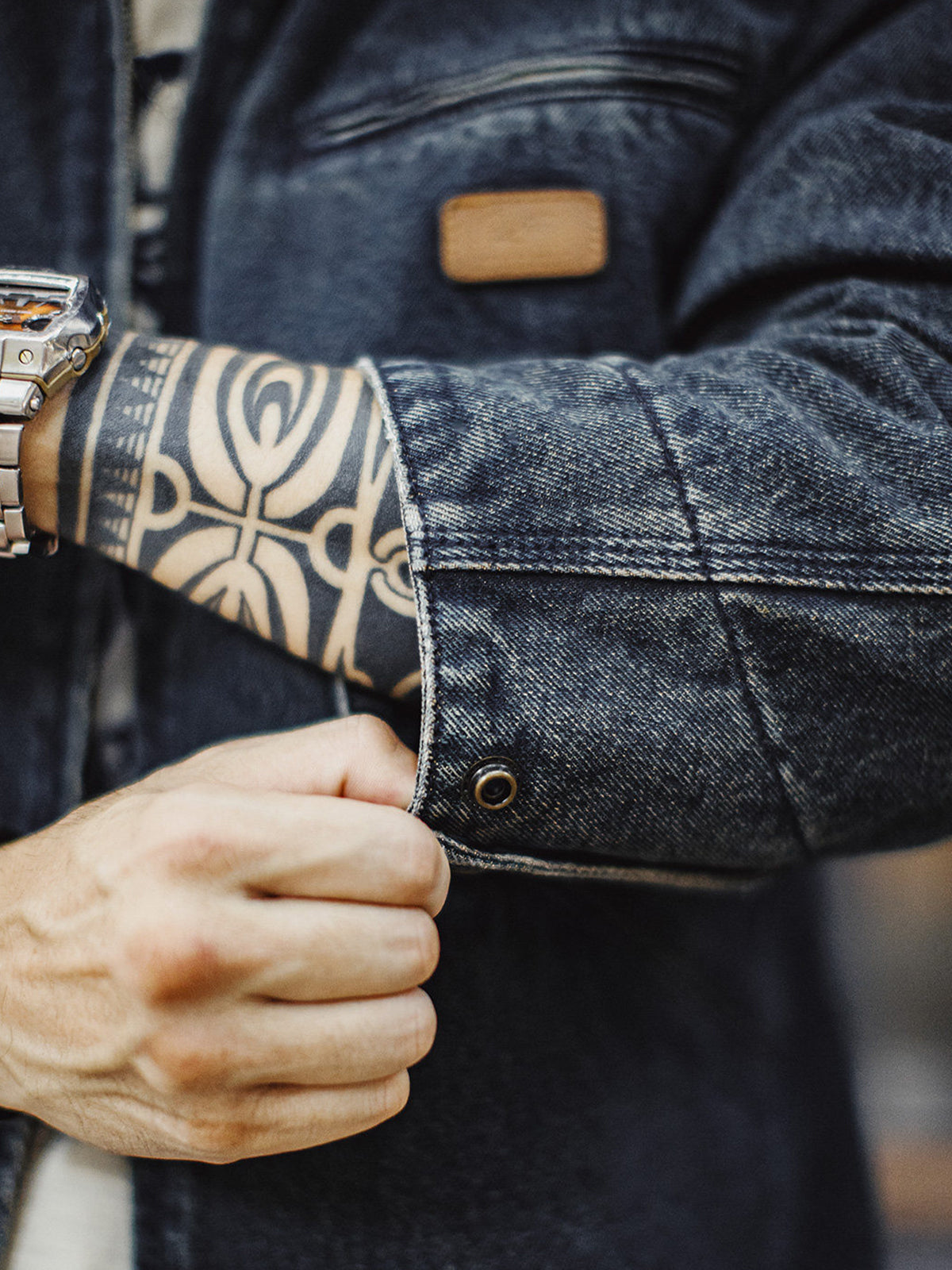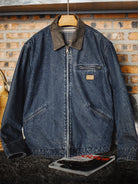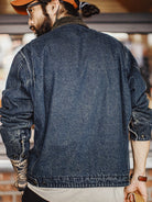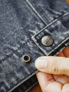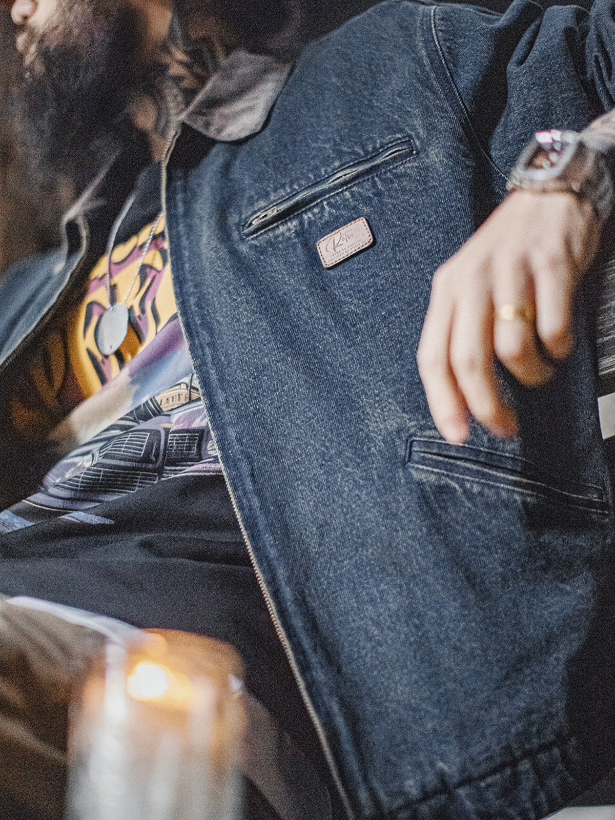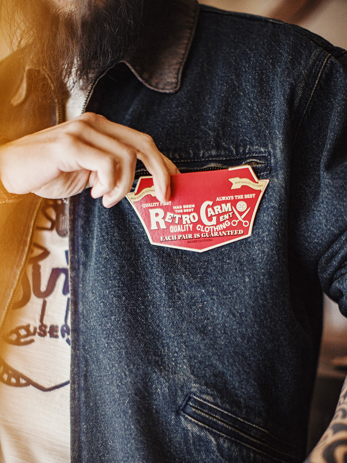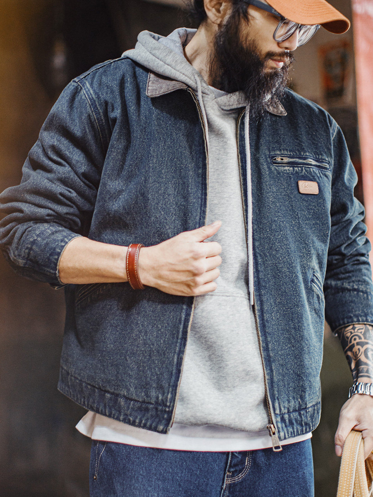 Building on the classic denim jacket, this upgraded version incorporates signature Detroit jacket elements for double the vintage appeal. The short, straight-cut silhouette and back accordion pleats preserve the clean structure of a Detroit jacket, while washed and distressed denim adds a lived-in, nostalgic character that develops unique folds and color with wear. A suede-like contrast collar enhances texture and detail, while a custom metal zipper ensures smooth, durable closure. Sturdy yet lightweight, this jacket blends retro style with modern comfort, making it a versatile piece for everyday wear.