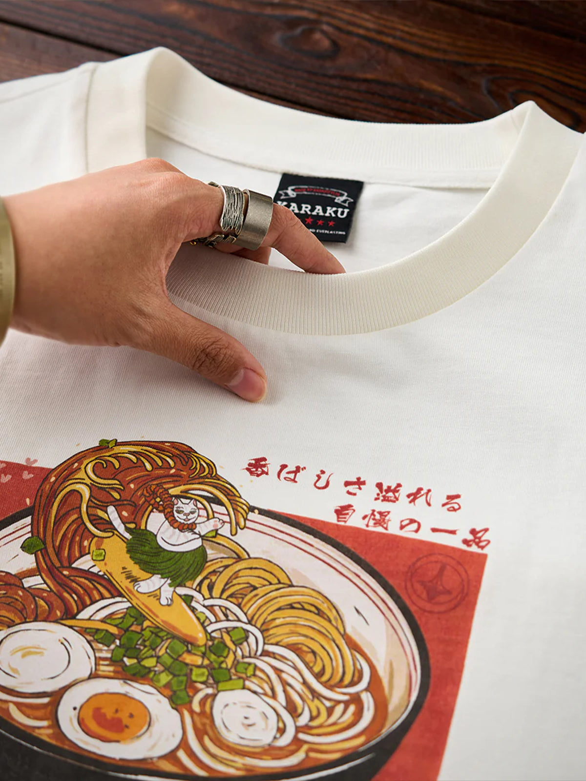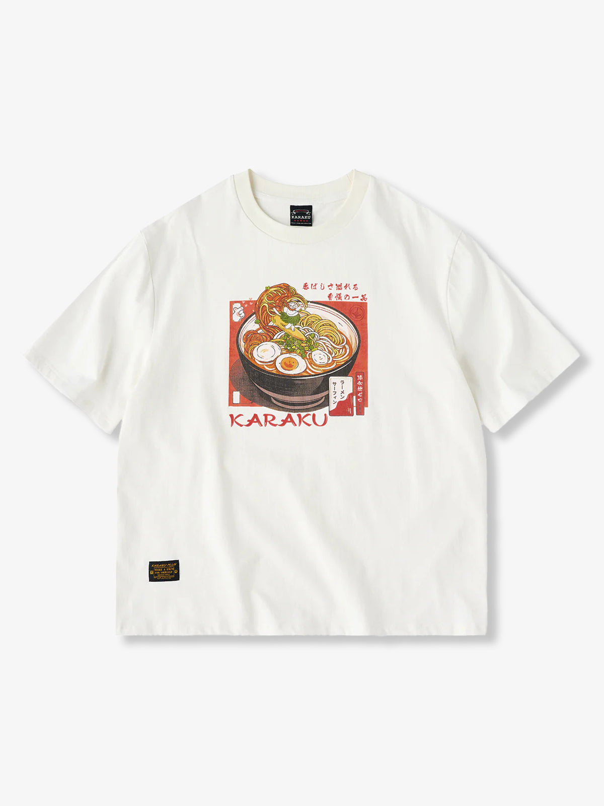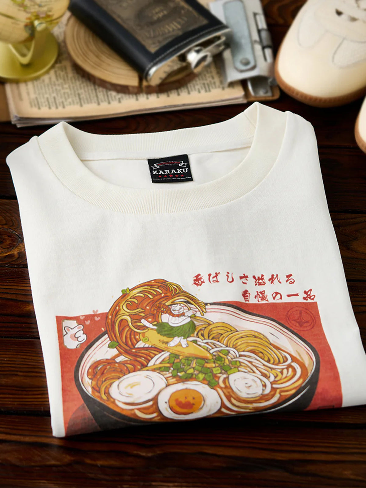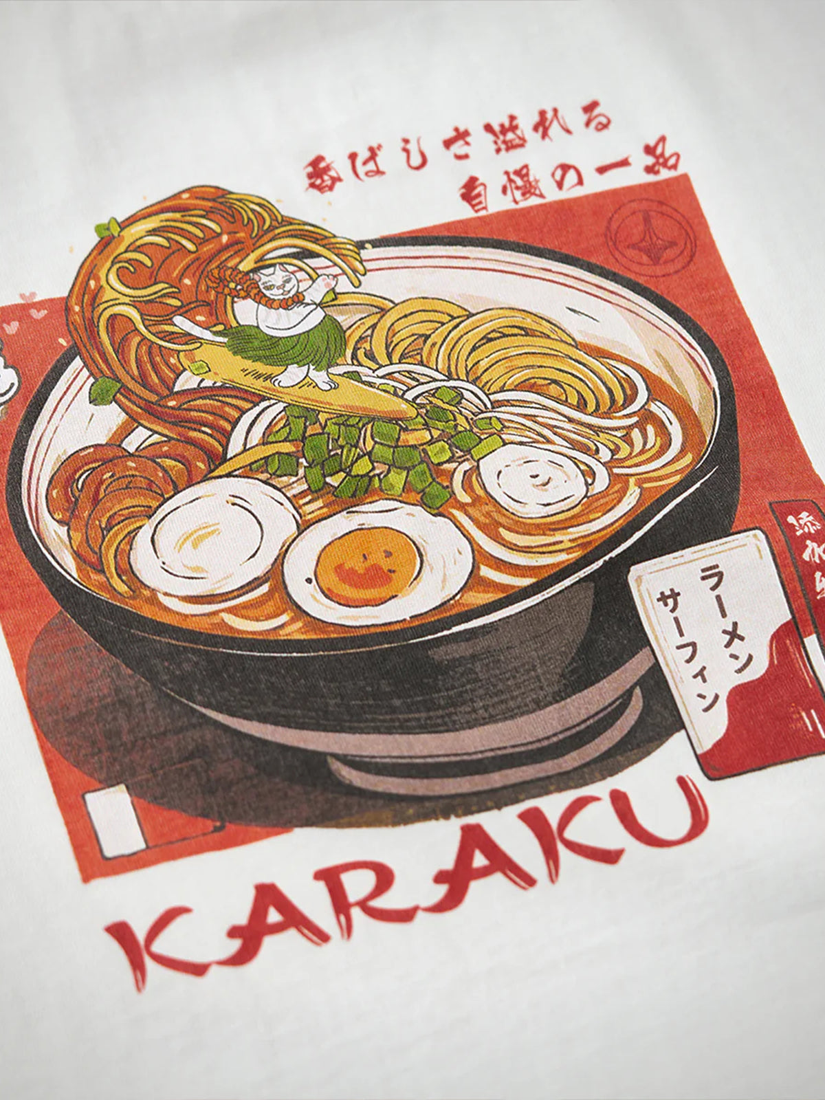 “Ramen Wave Surfing & Hula Dancing Cat” Print Cotton T-Shirt