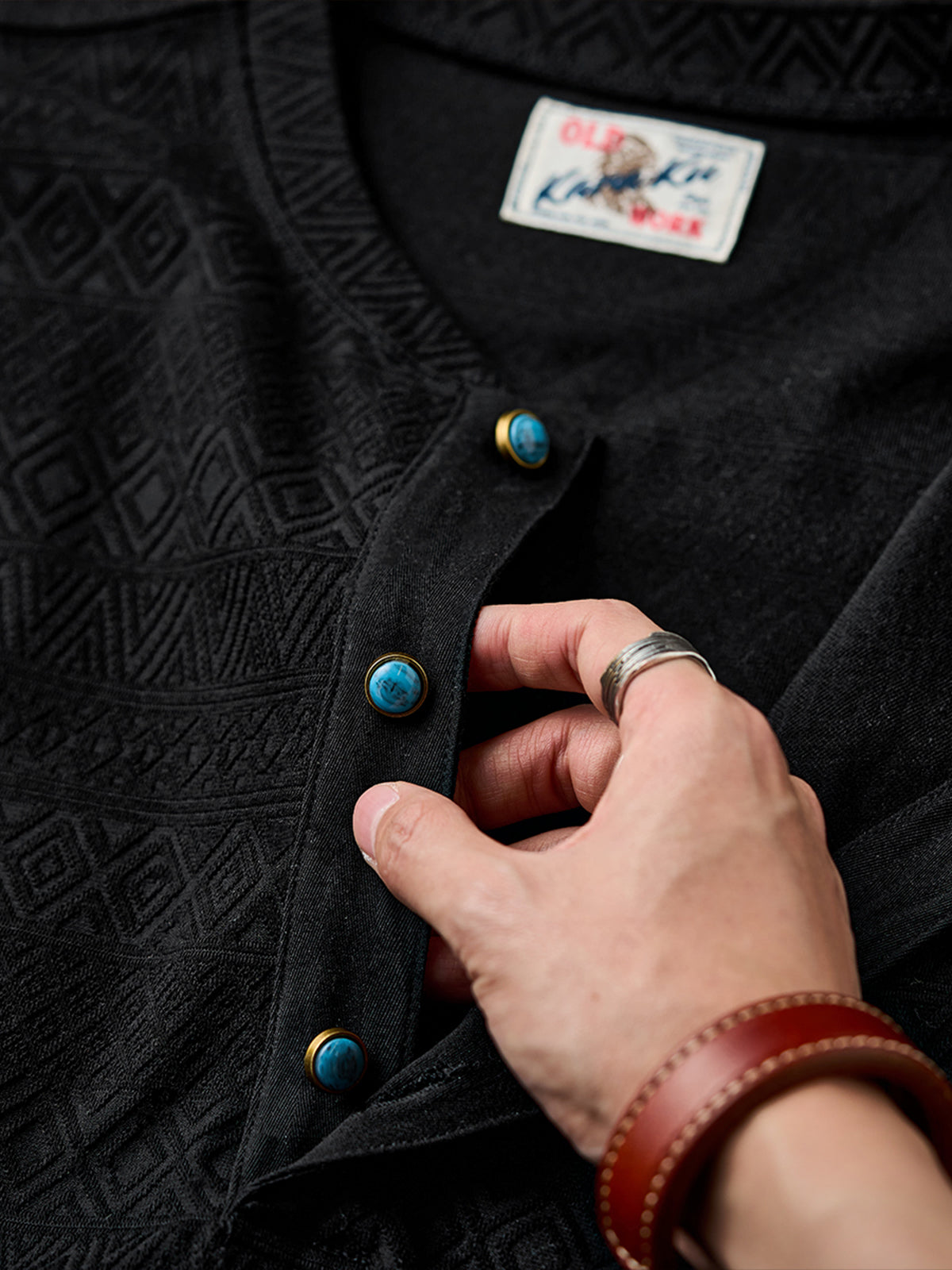 [Pre-order] Ethnic Jacquard Knit Henley Tee with Turquoise-Style Buttons