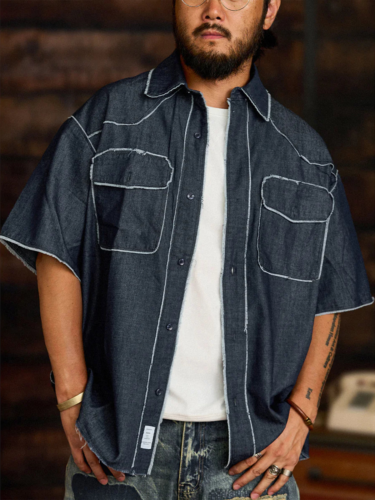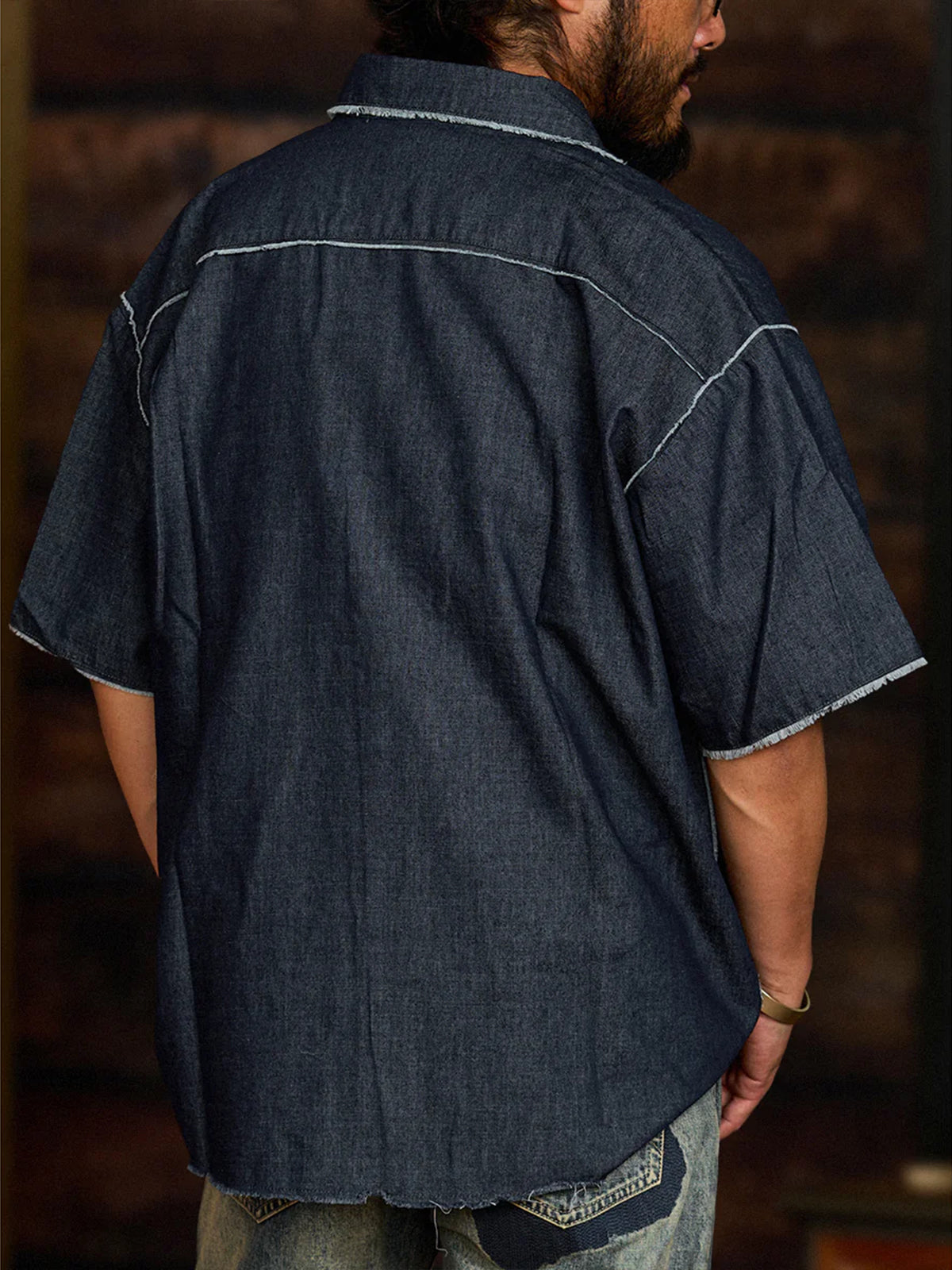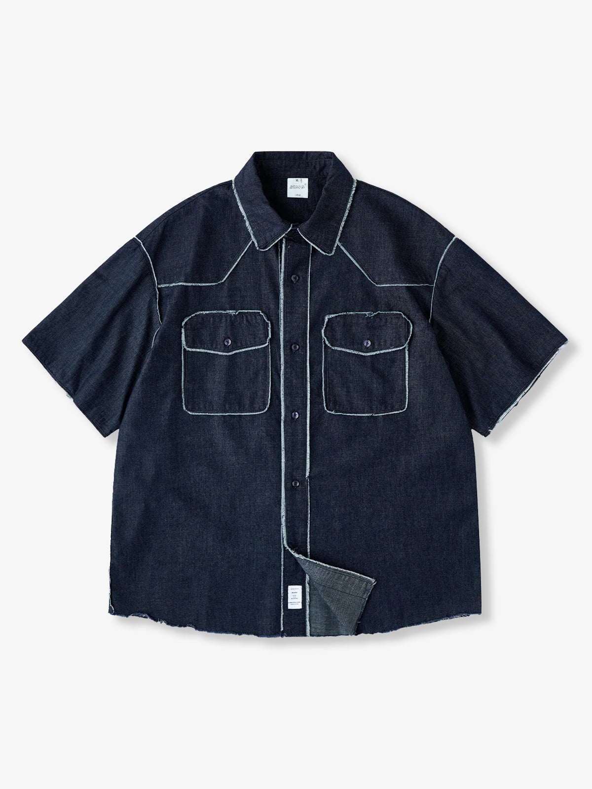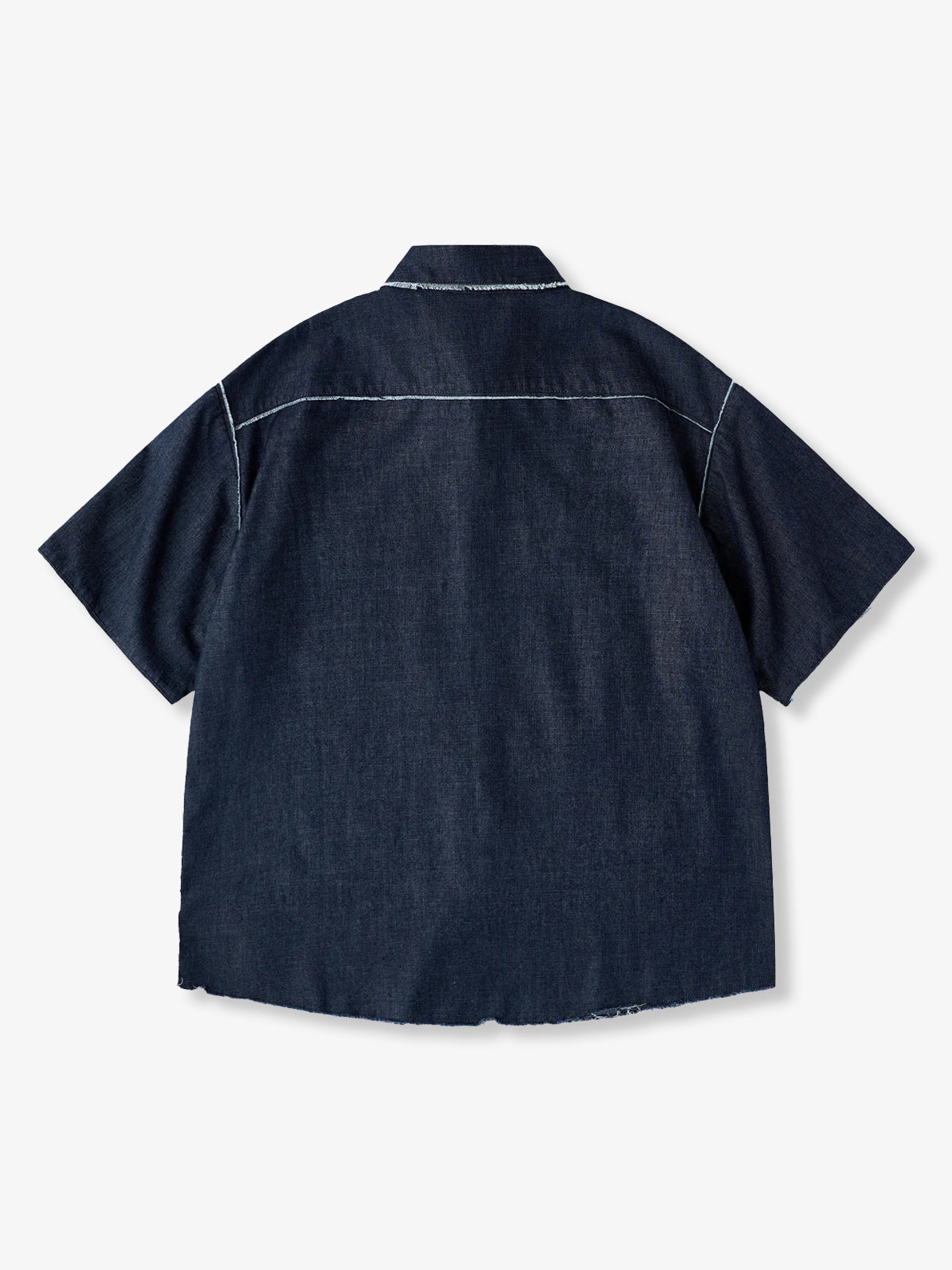 White Stitching Fringed Denim Short-Sleeve Shirt