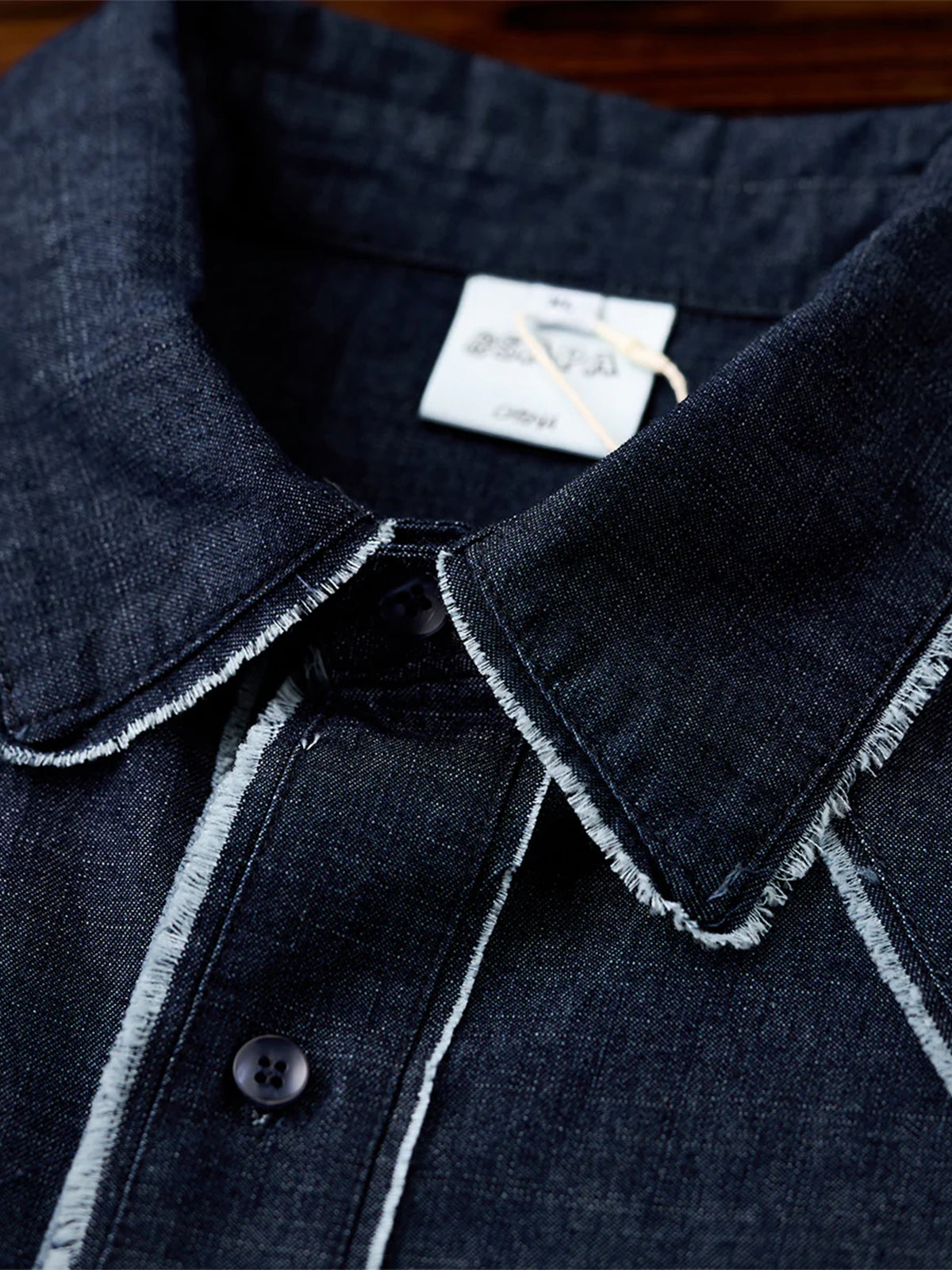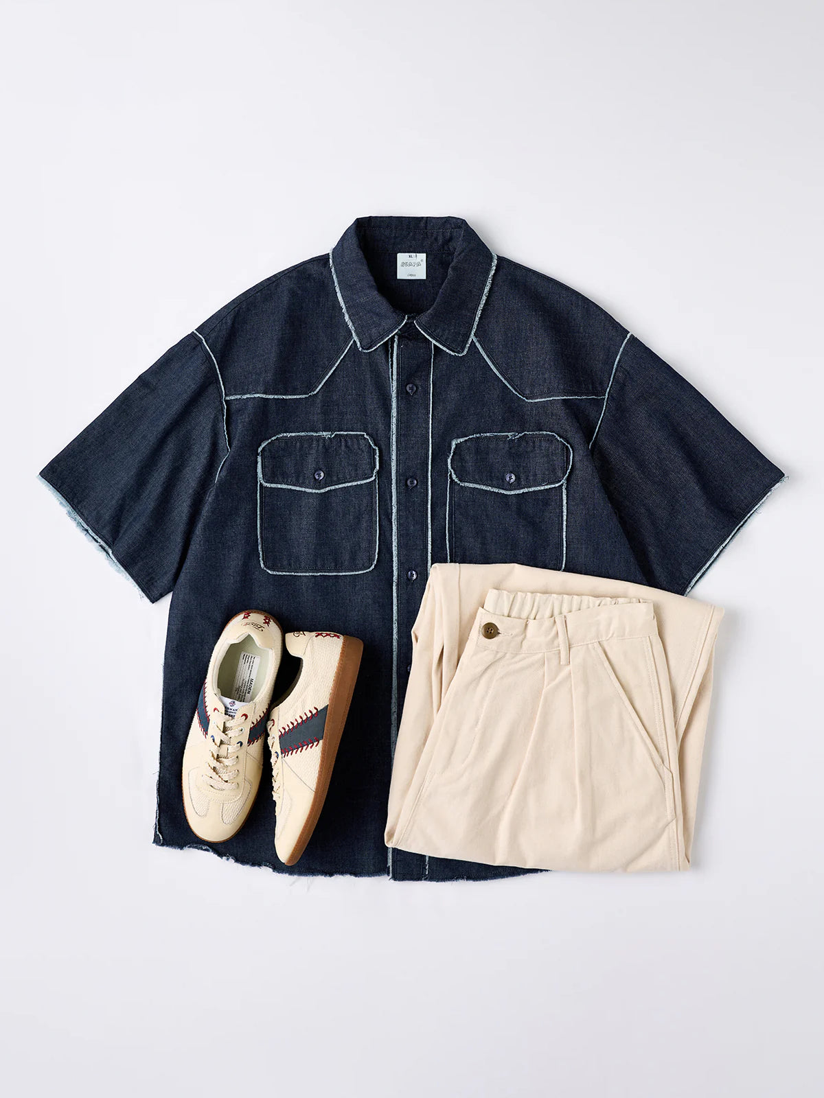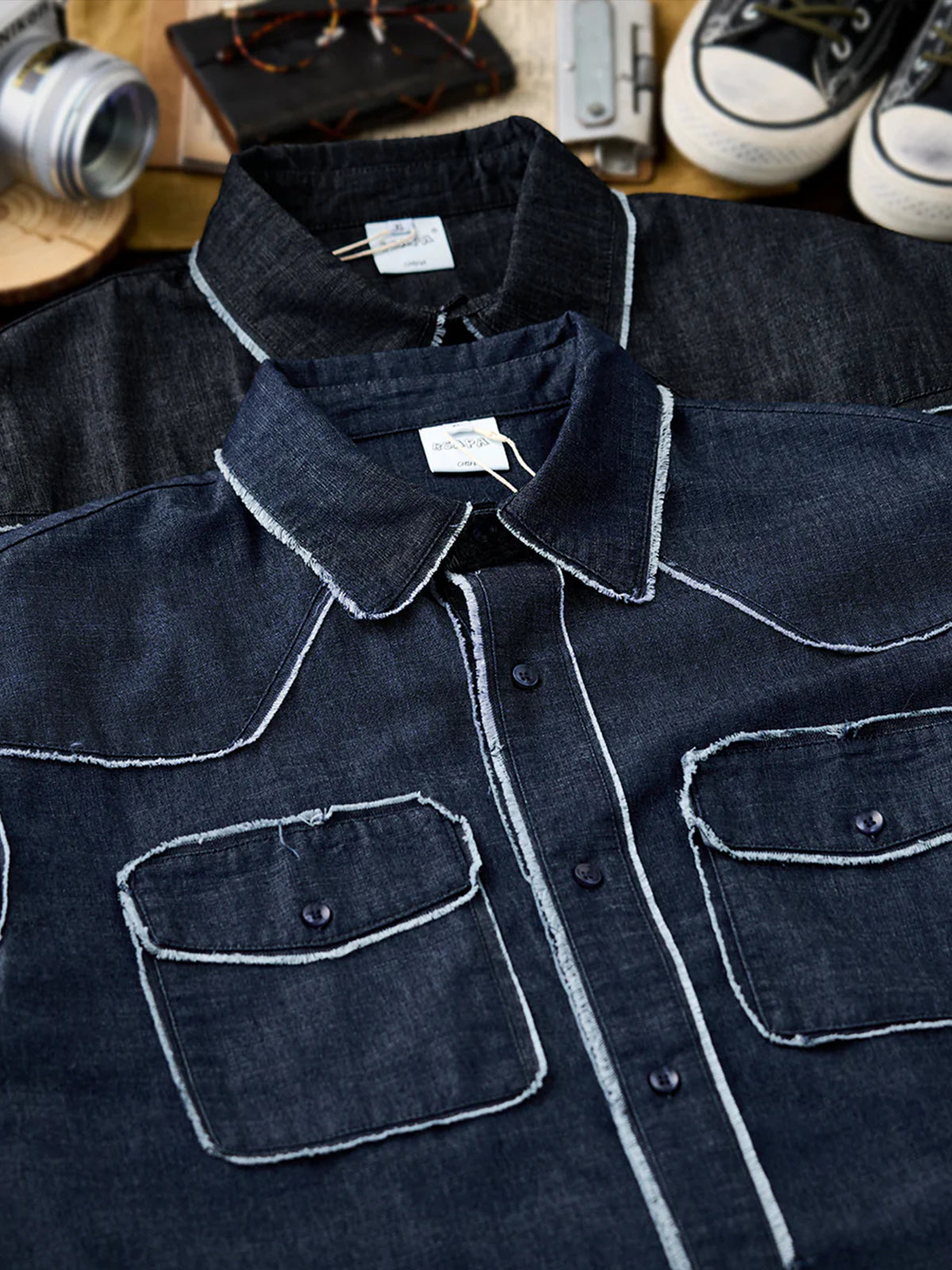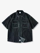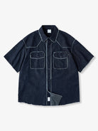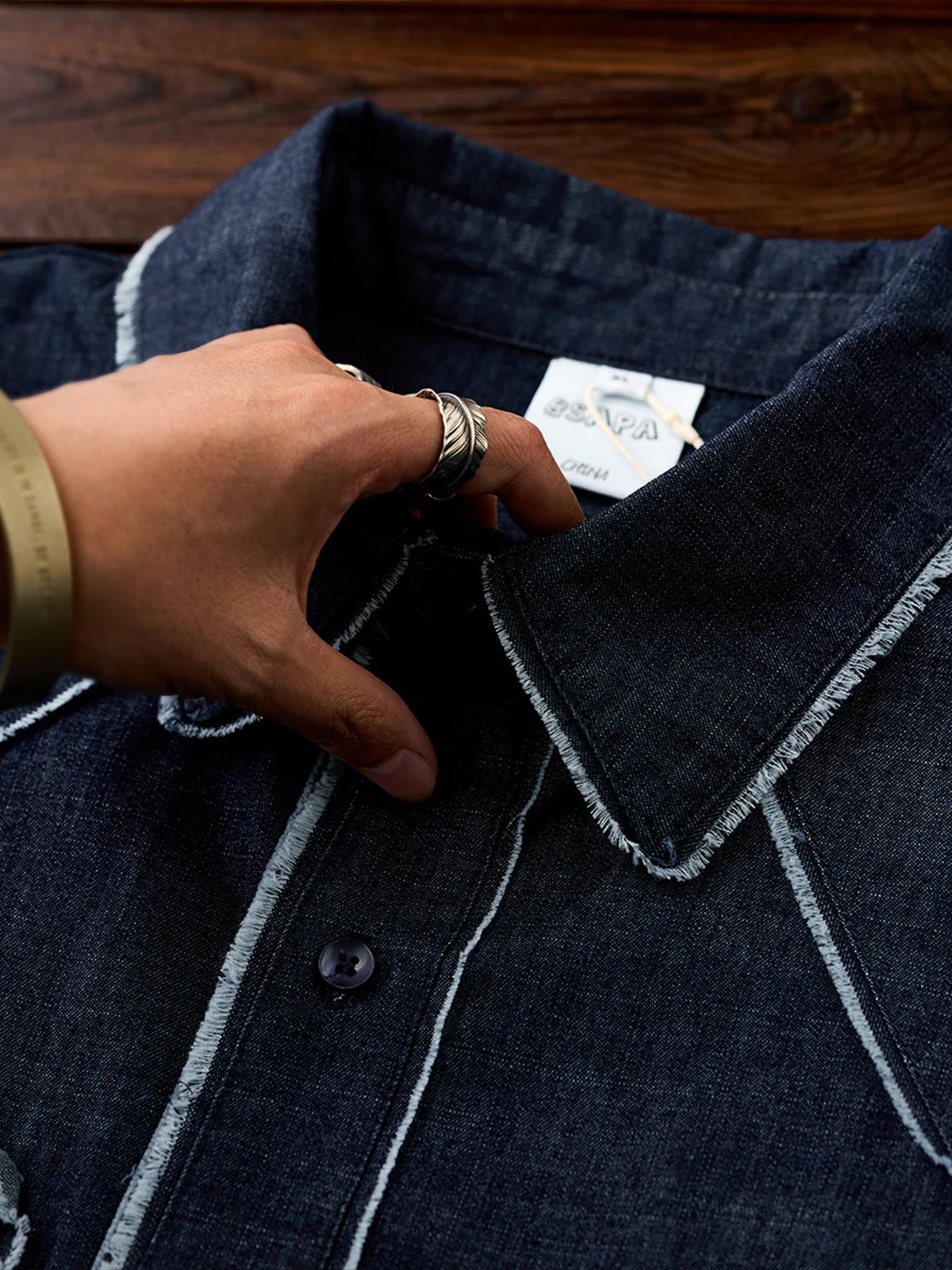White Stitching Fringed Denim Short-Sleeve Shirt