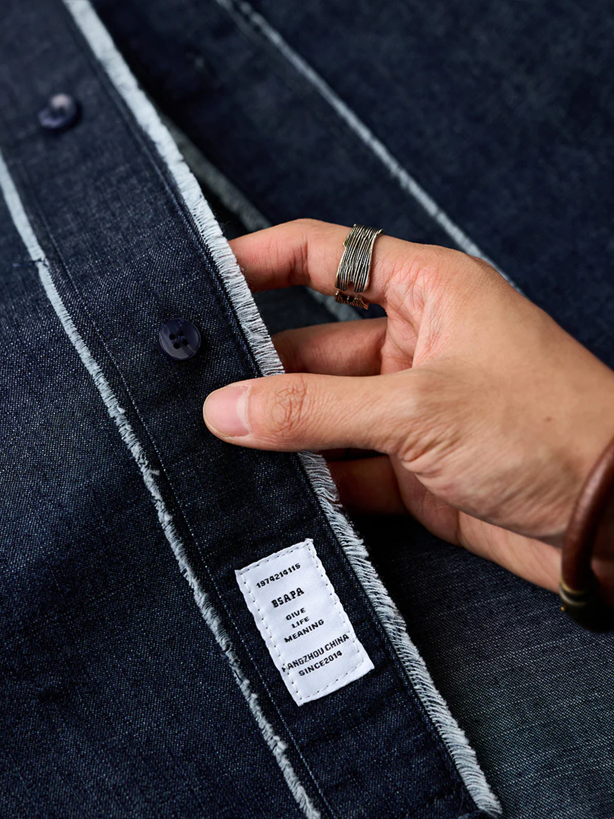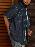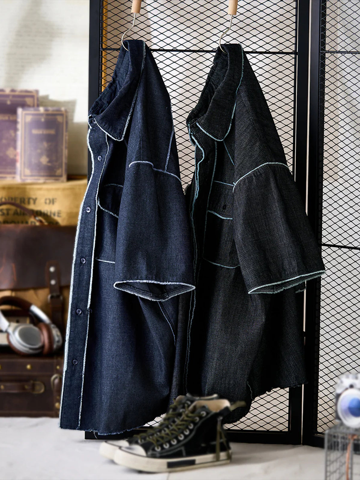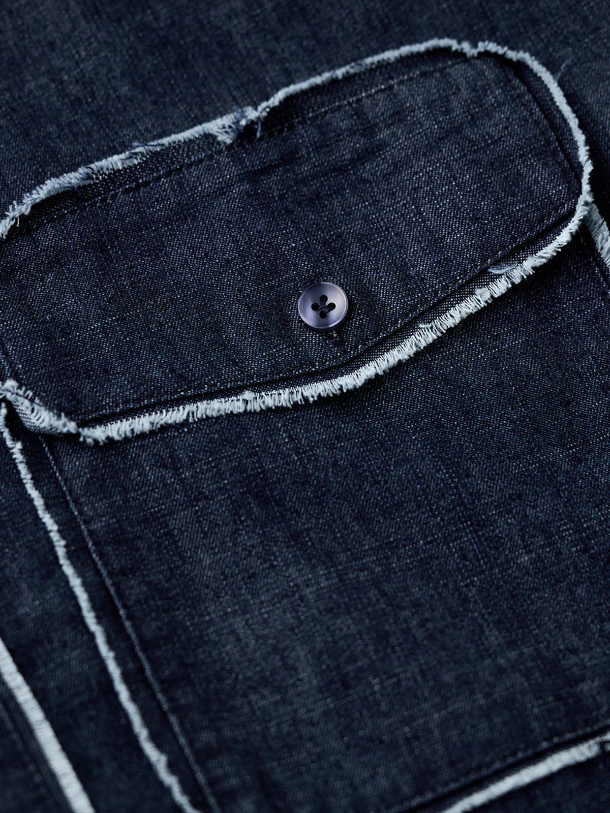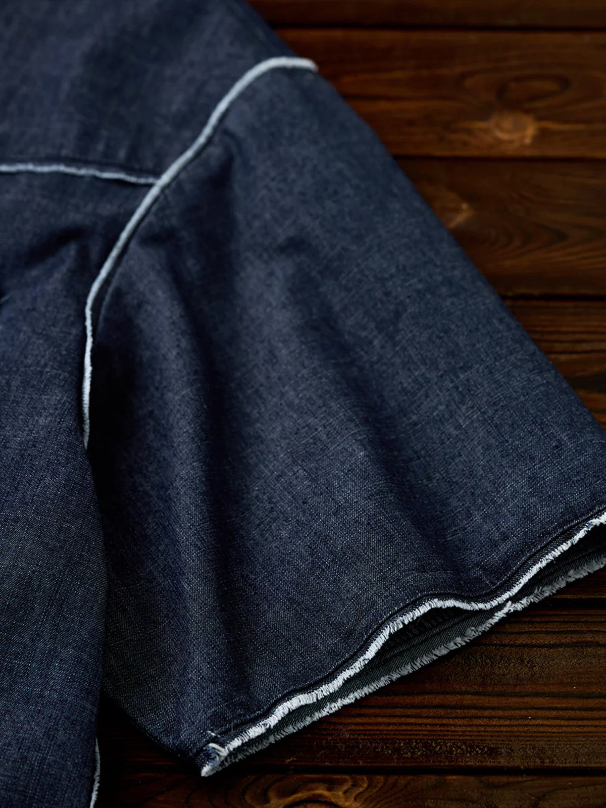 White Stitching Fringed Denim Short-Sleeve Shirt