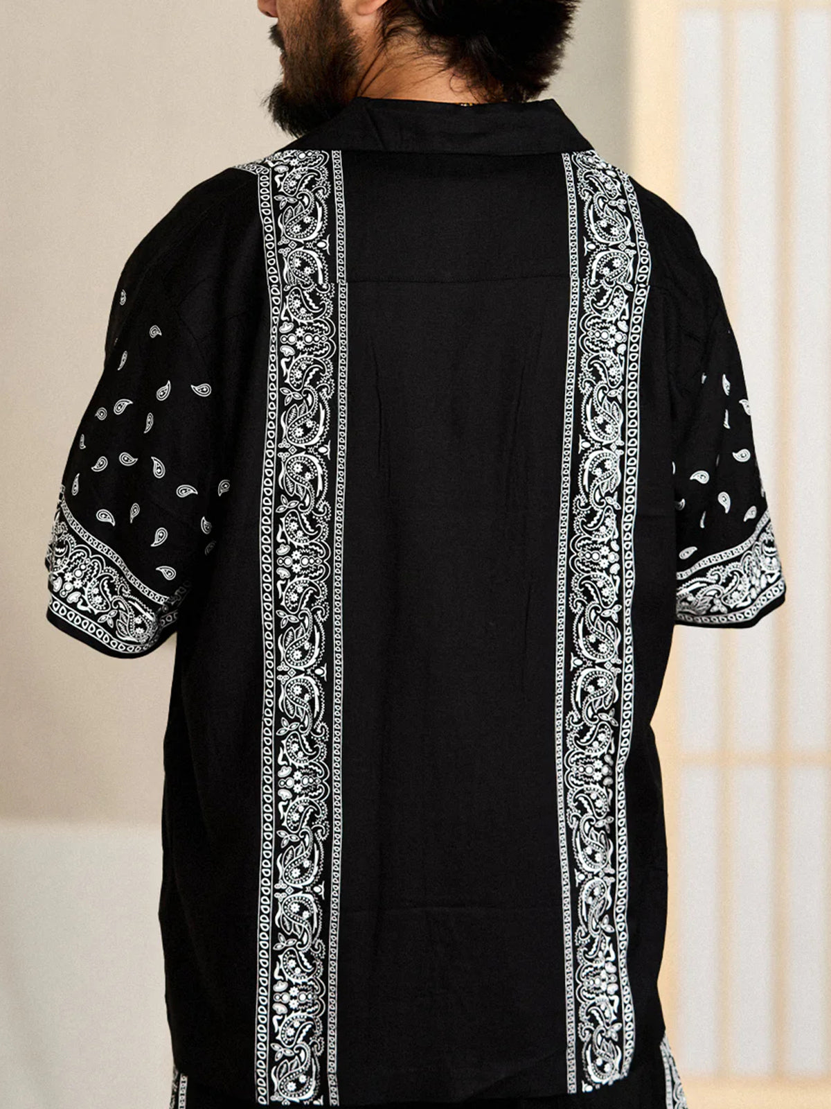 A stylish two-piece set featuring an all-over paisley print with botanical motifs like petals and foliage. The relaxed fit and soft drape create an effortlessly modern silhouette. The Cuban collar on the shirt adds structure, while open-cut sleeve cuffs improve mobility. Functional details include a flap chest pocket on the shirt and a hip pocket on the shorts. The adjustable waistband ensures a comfortable, flexible fit for all body types.