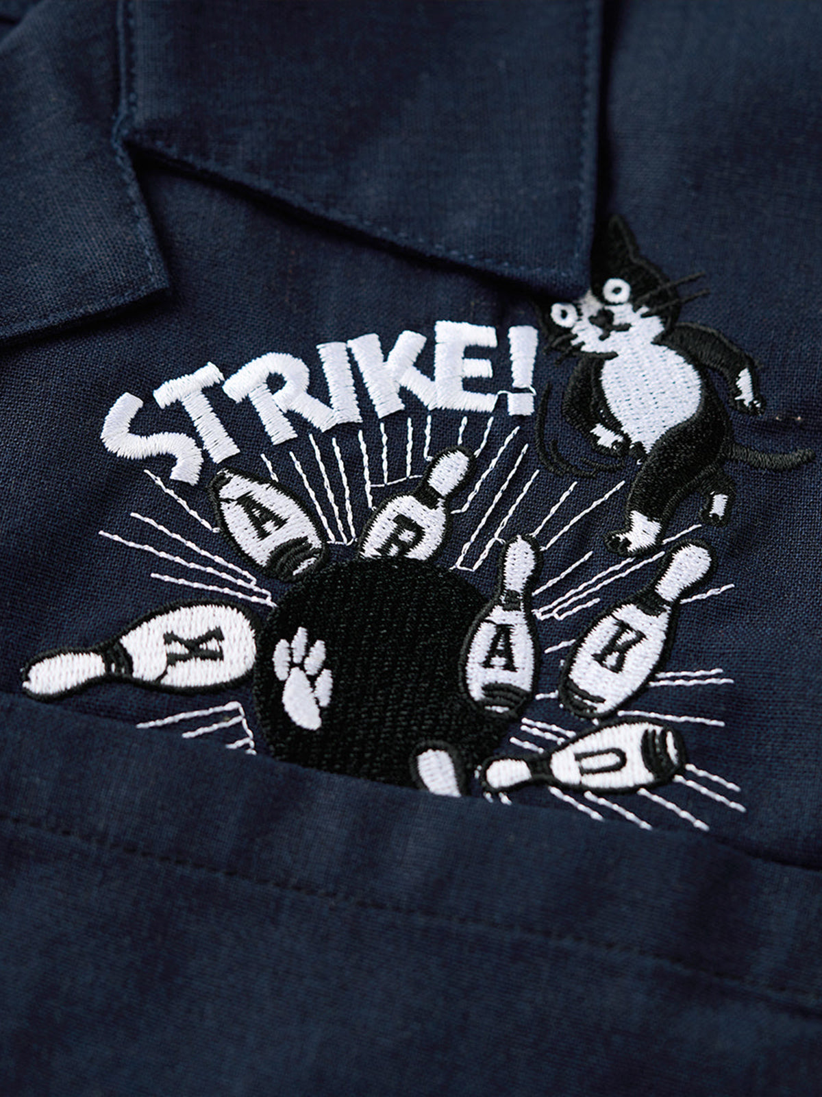 "Cat Bowling a Strike" Embroidered Open Collar Shirt