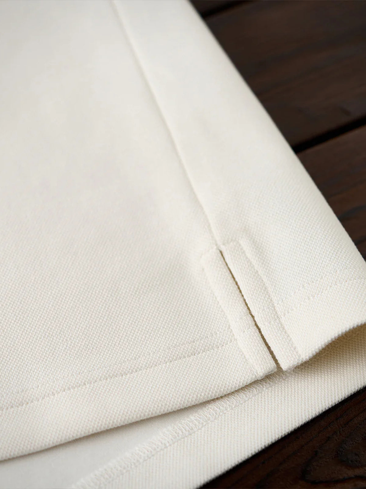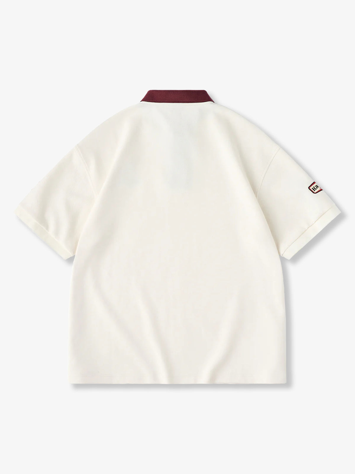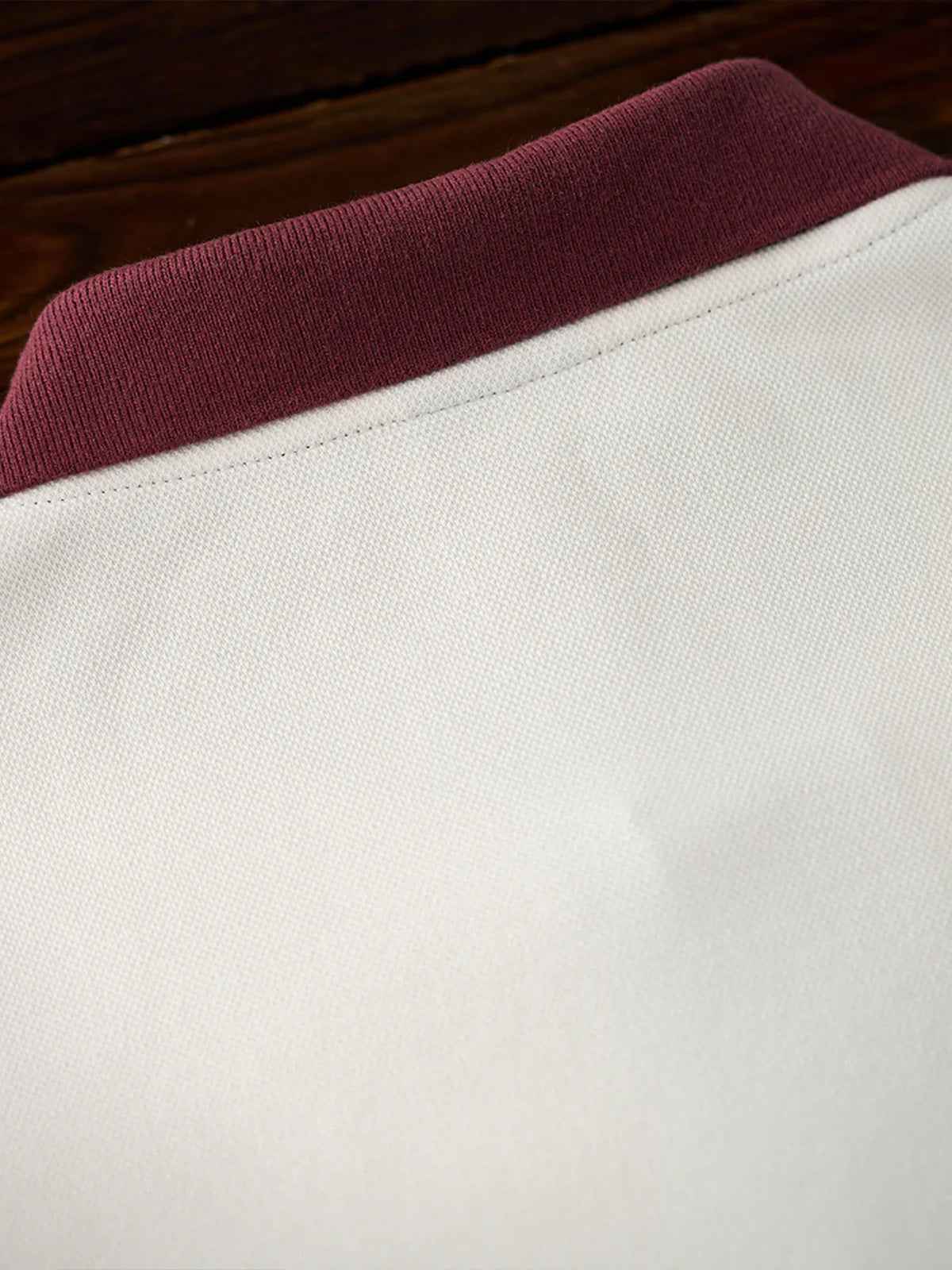 This polo shirt features a classic collar and button placket that gives a casual yet slightly formal impression. The wine-red collar adds a stylish accent to the overall look.