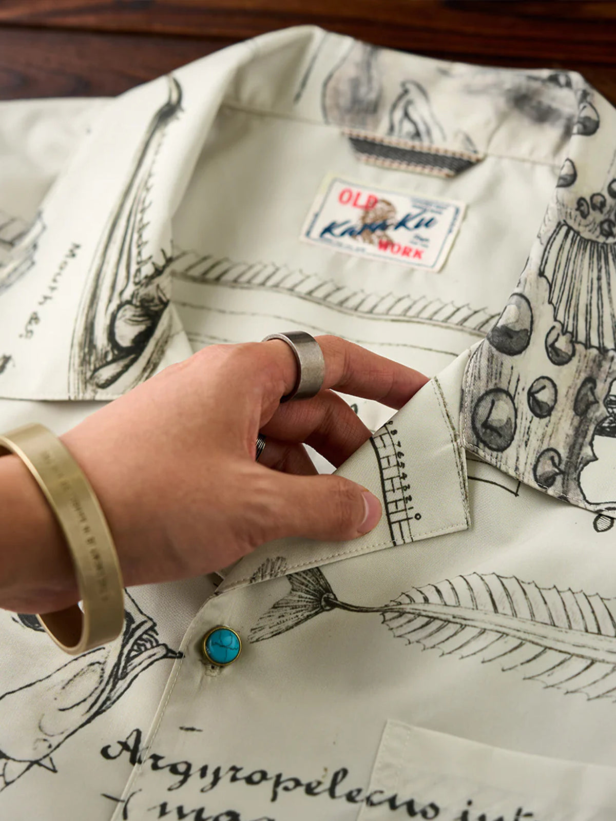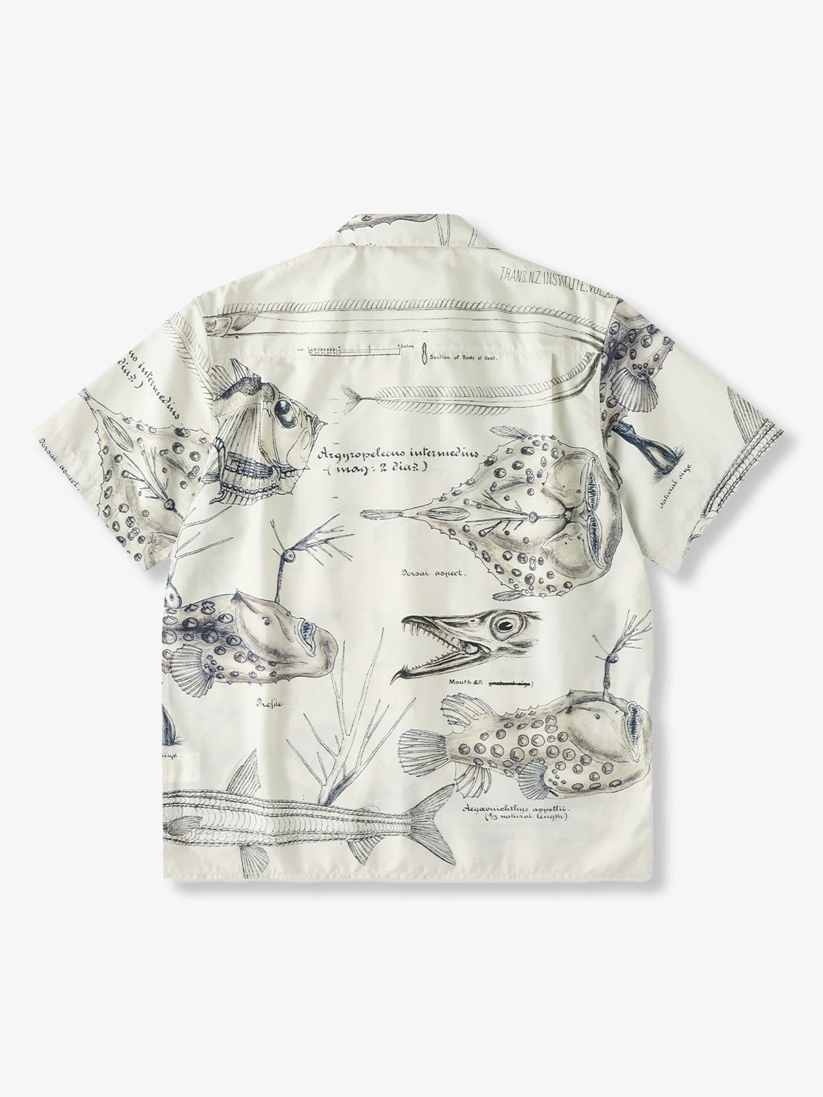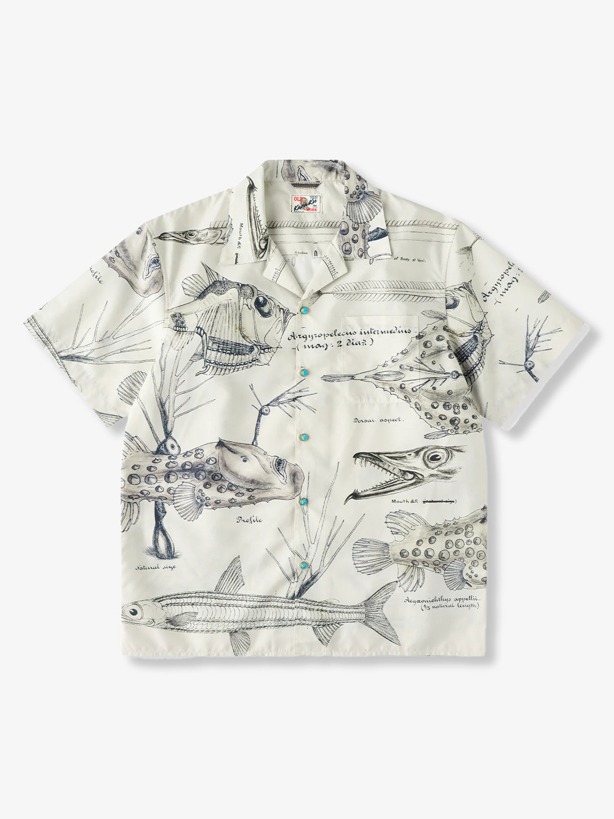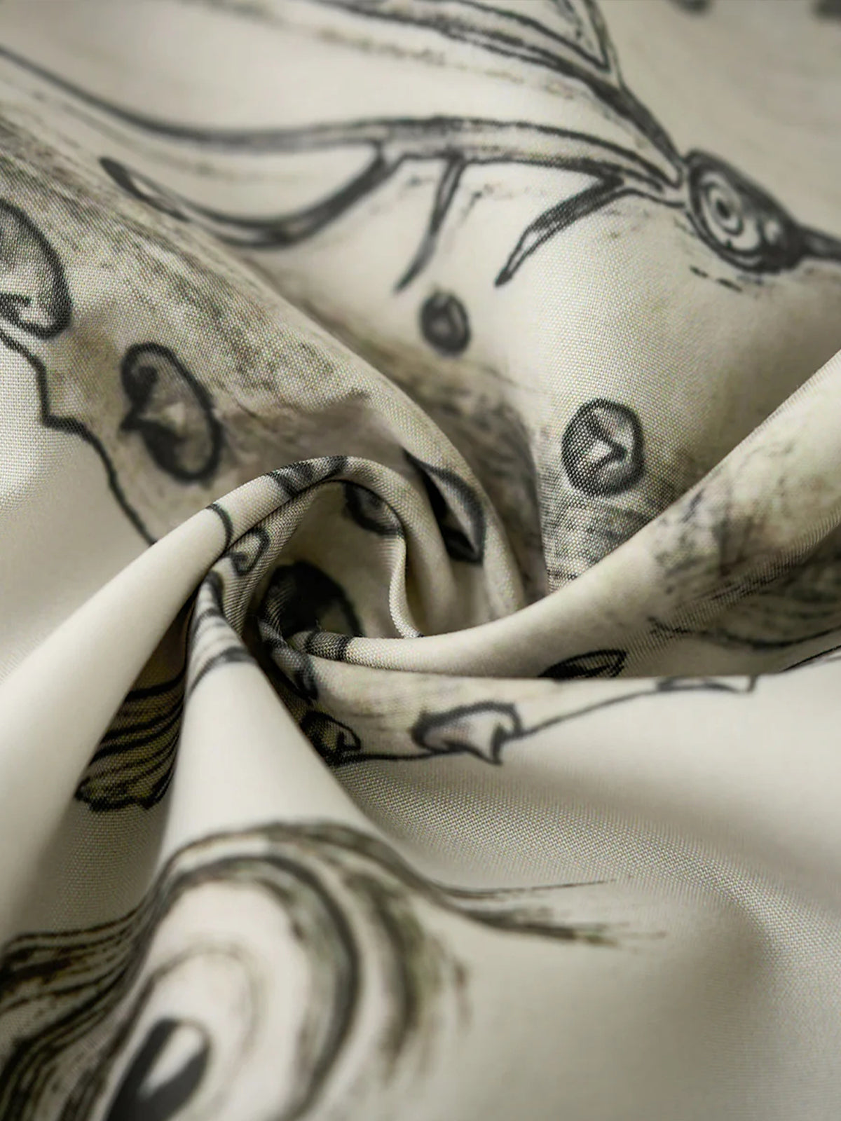 An open collar shirt featuring uniquely detailed deep sea creatures drawn in a delicate hand-sketched style like an illustrated guide. The muted color palette balances playful motifs, creating a design that’s chic from afar and intriguingly quirky up close. Turquoise-style buttons add a stylish touch. Its relaxed open collar makes it perfect for casual summer looks.