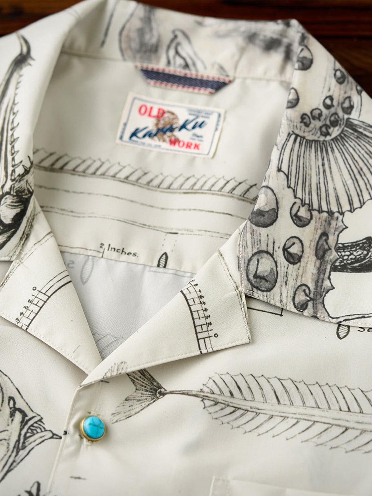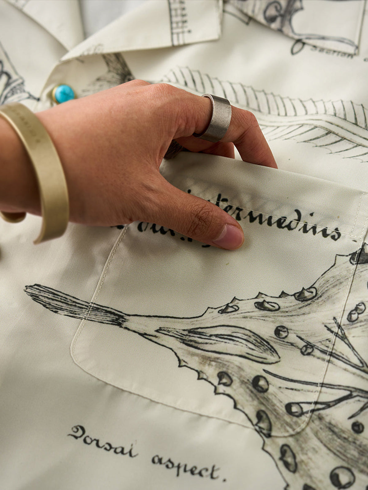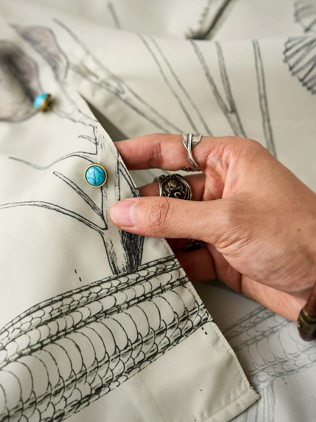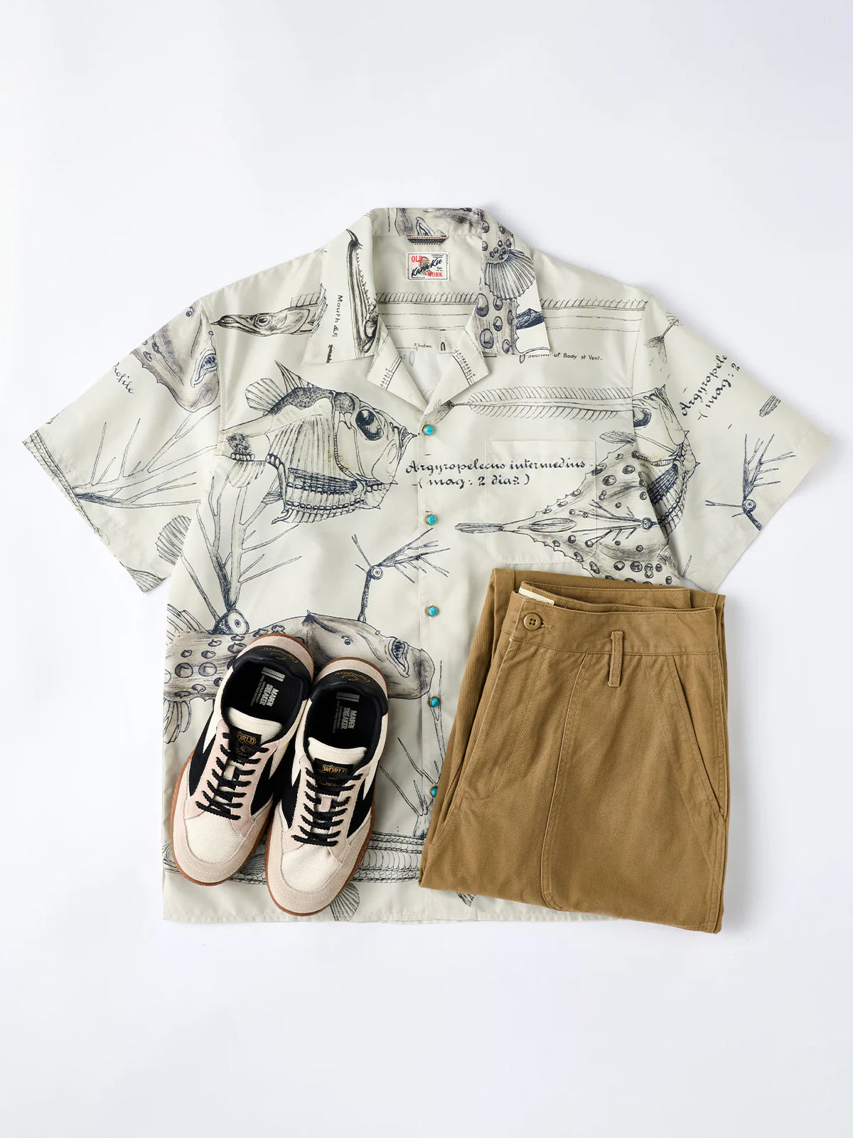 An open collar shirt featuring uniquely detailed deep sea creatures drawn in a delicate hand-sketched style like an illustrated guide. The muted color palette balances playful motifs, creating a design that’s chic from afar and intriguingly quirky up close. Turquoise-style buttons add a stylish touch. Its relaxed open collar makes it perfect for casual summer looks.