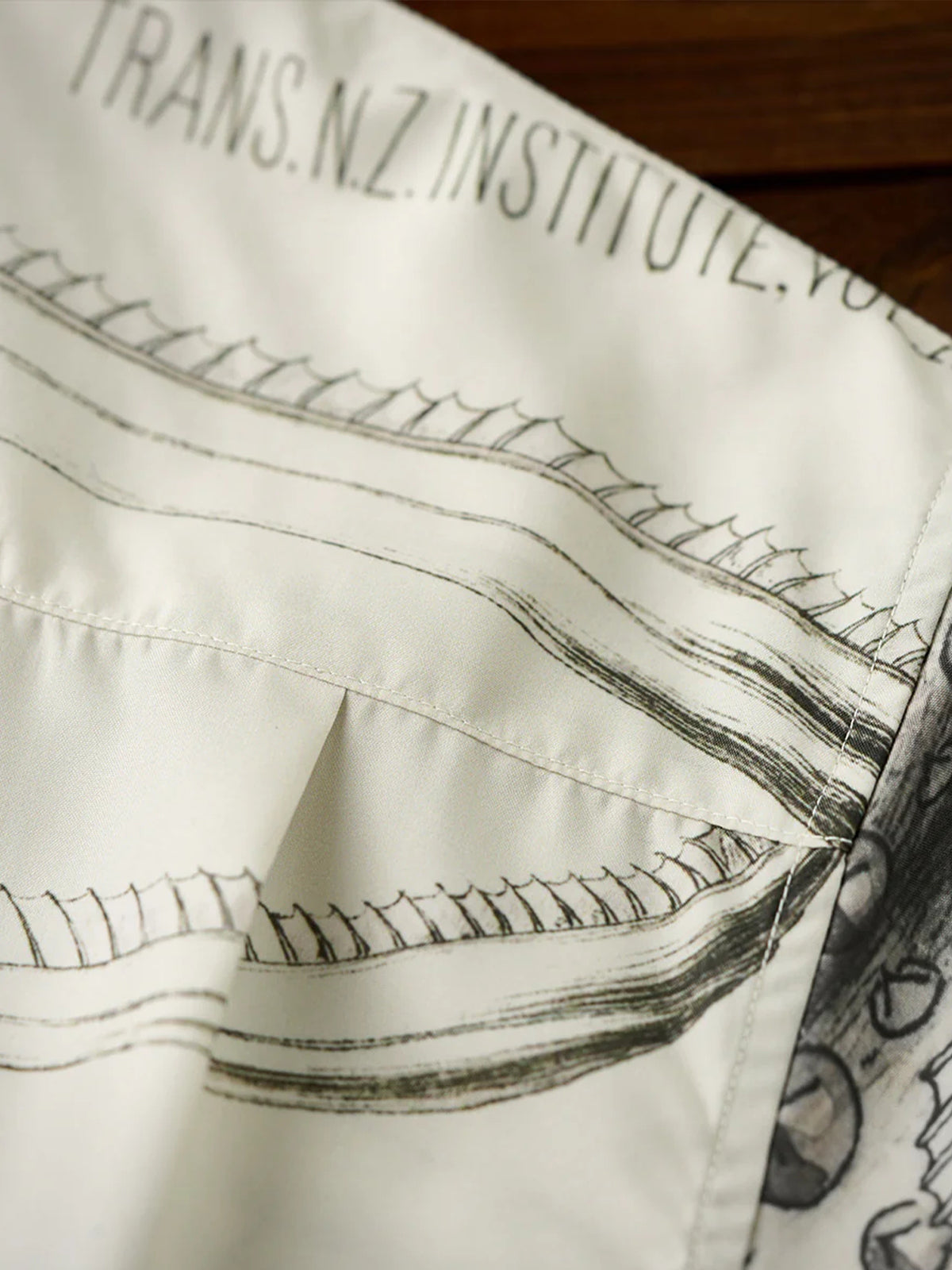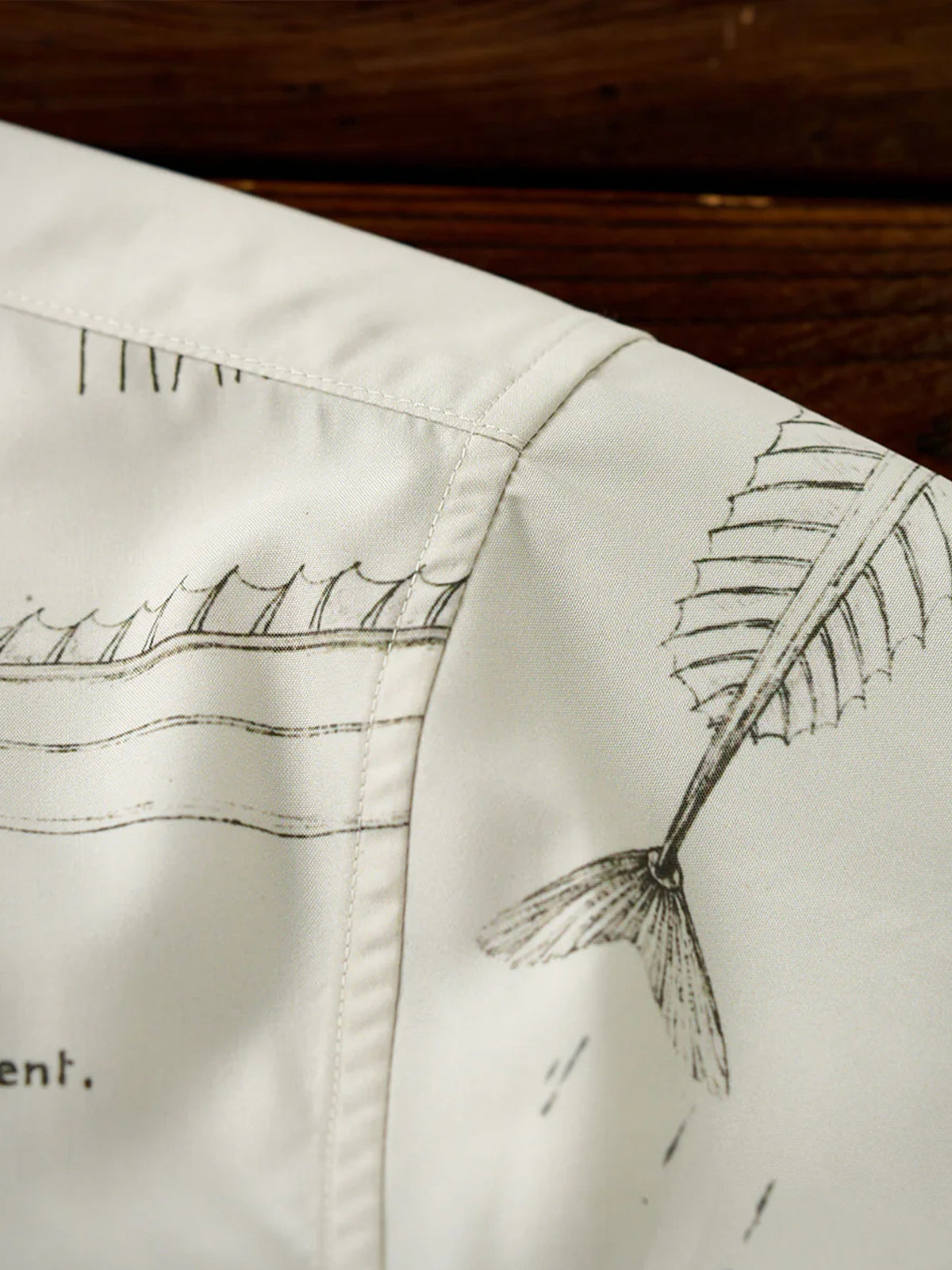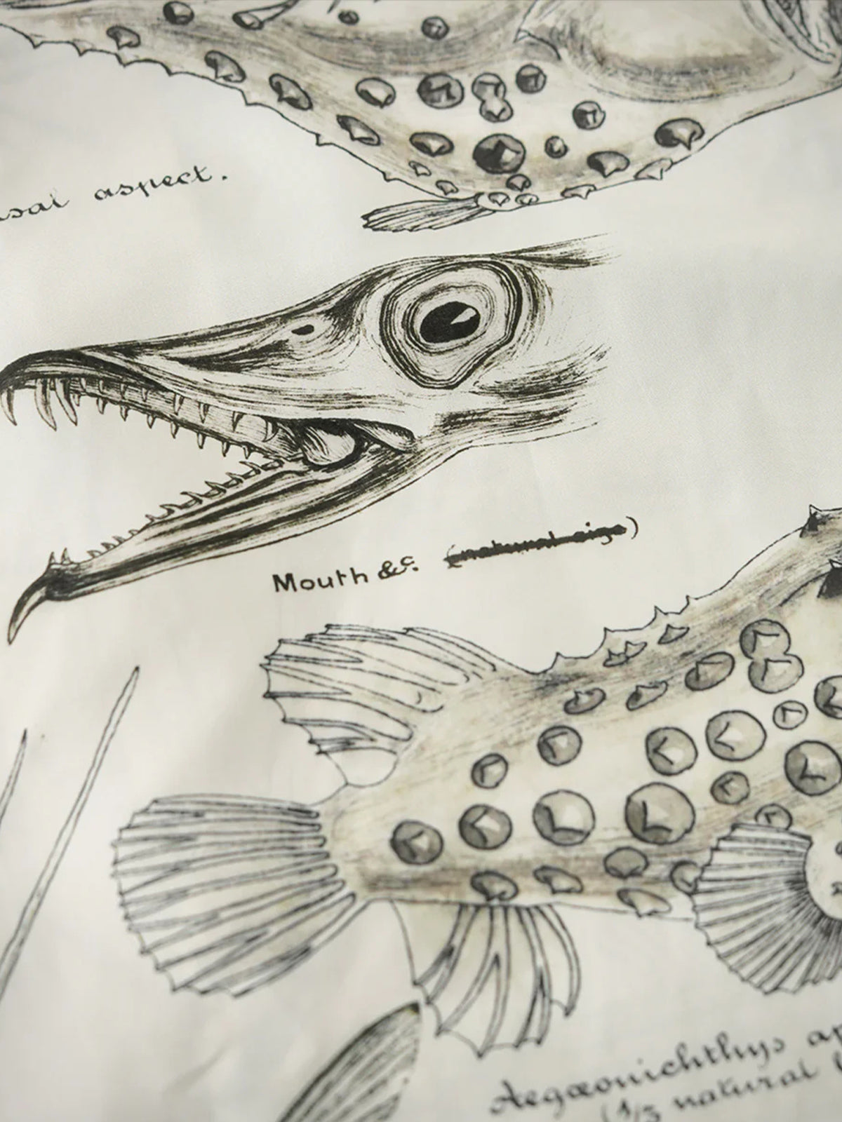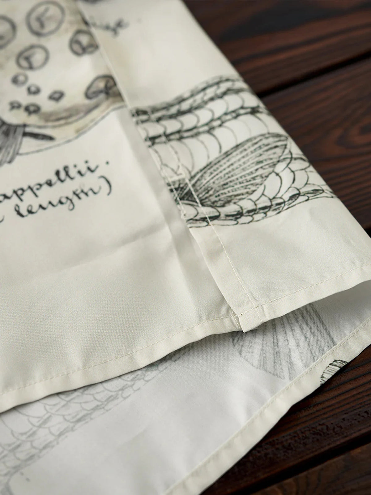 An open collar shirt featuring uniquely detailed deep sea creatures drawn in a delicate hand-sketched style like an illustrated guide. The muted color palette balances playful motifs, creating a design that’s chic from afar and intriguingly quirky up close. Turquoise-style buttons add a stylish touch. Its relaxed open collar makes it perfect for casual summer looks.