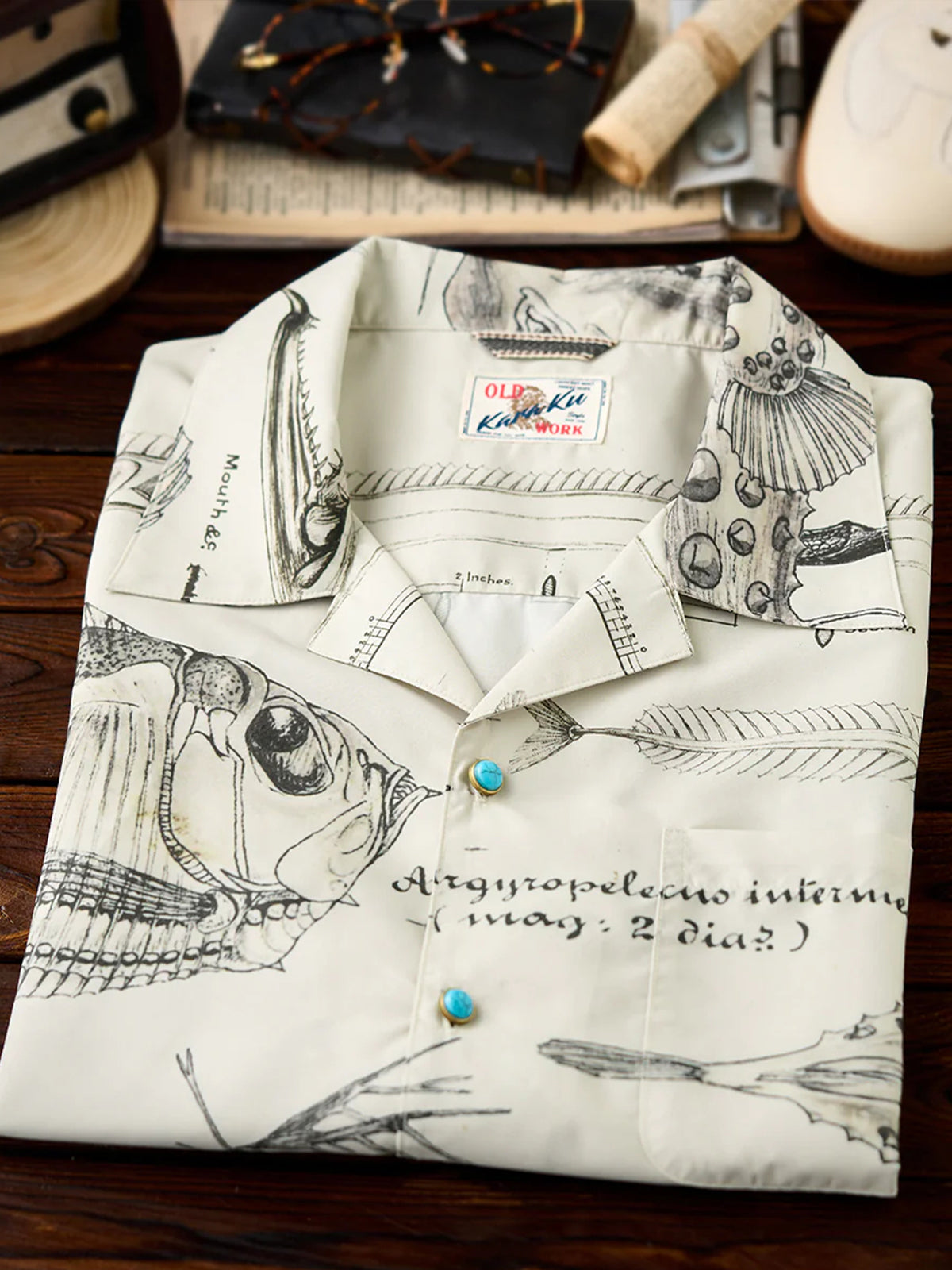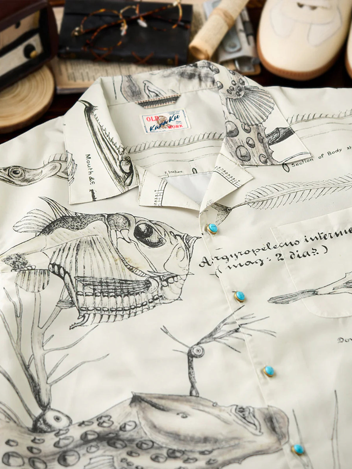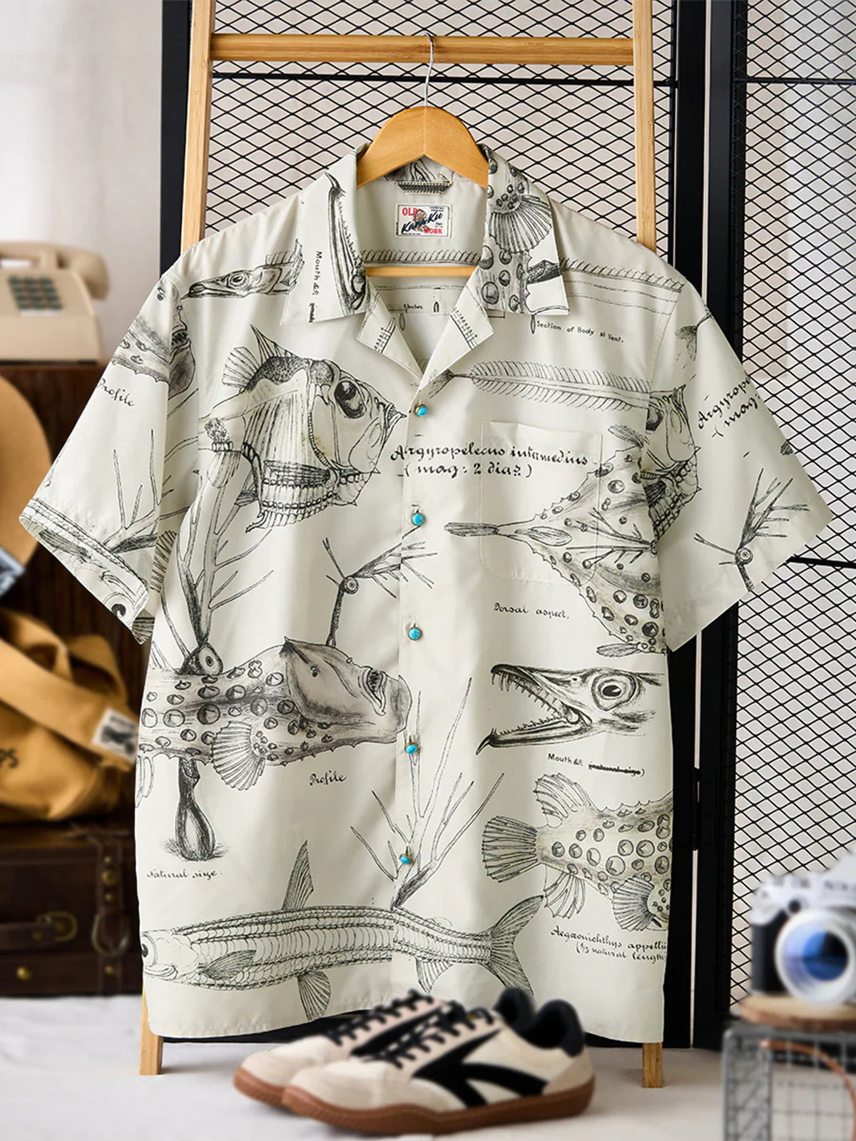 Turquoise-Style Buttons Hand-Drawn "Deep Sea Creatures Encyclopedia" Open Collar Shirt