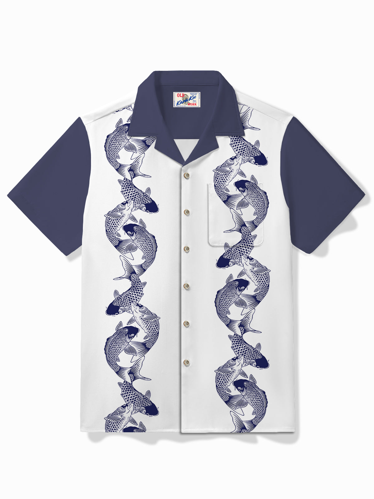 Inspired by the 60s and 70s retro bowling culture, this cotton shirt features bold color blocking and a vibrant koi design symbolizing luck and prosperity. The breathable, soft cotton fabric ensures comfort and durability. Combining nostalgic charm with modern style, this shirt offers both unique flair and everyday wearability for those seeking quality and individuality.