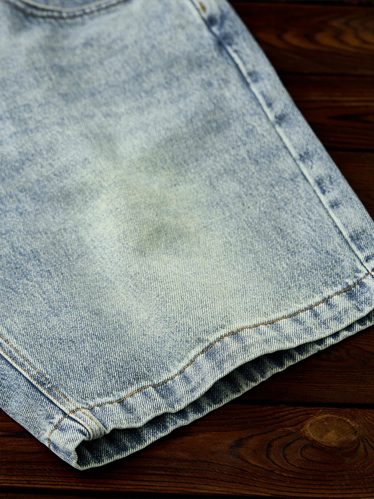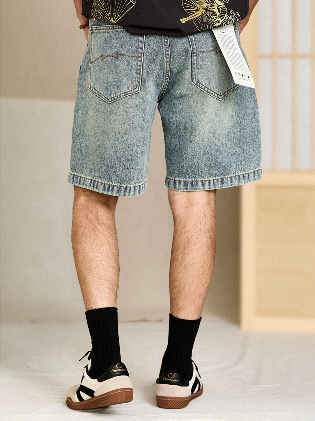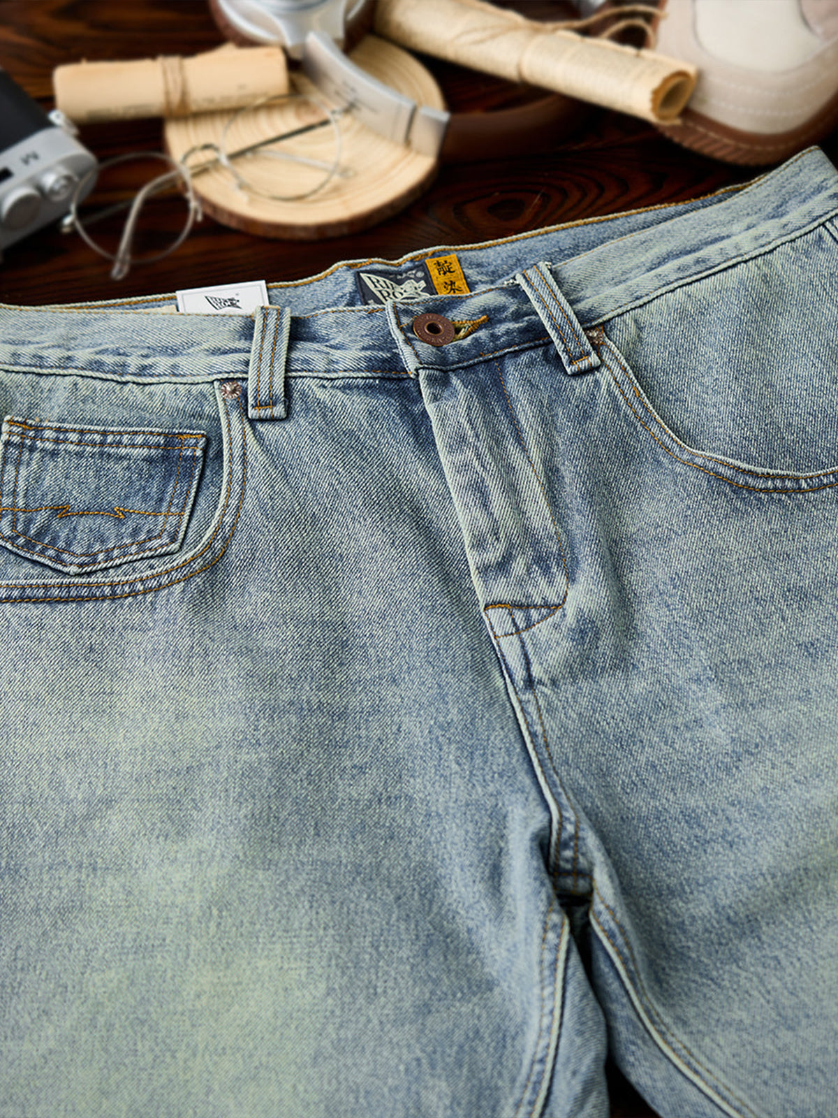 Whiskered Pocket-Stitch Denim Shorts