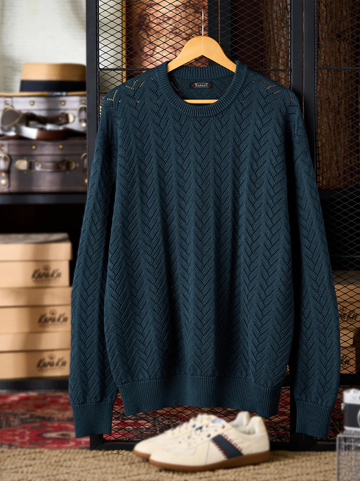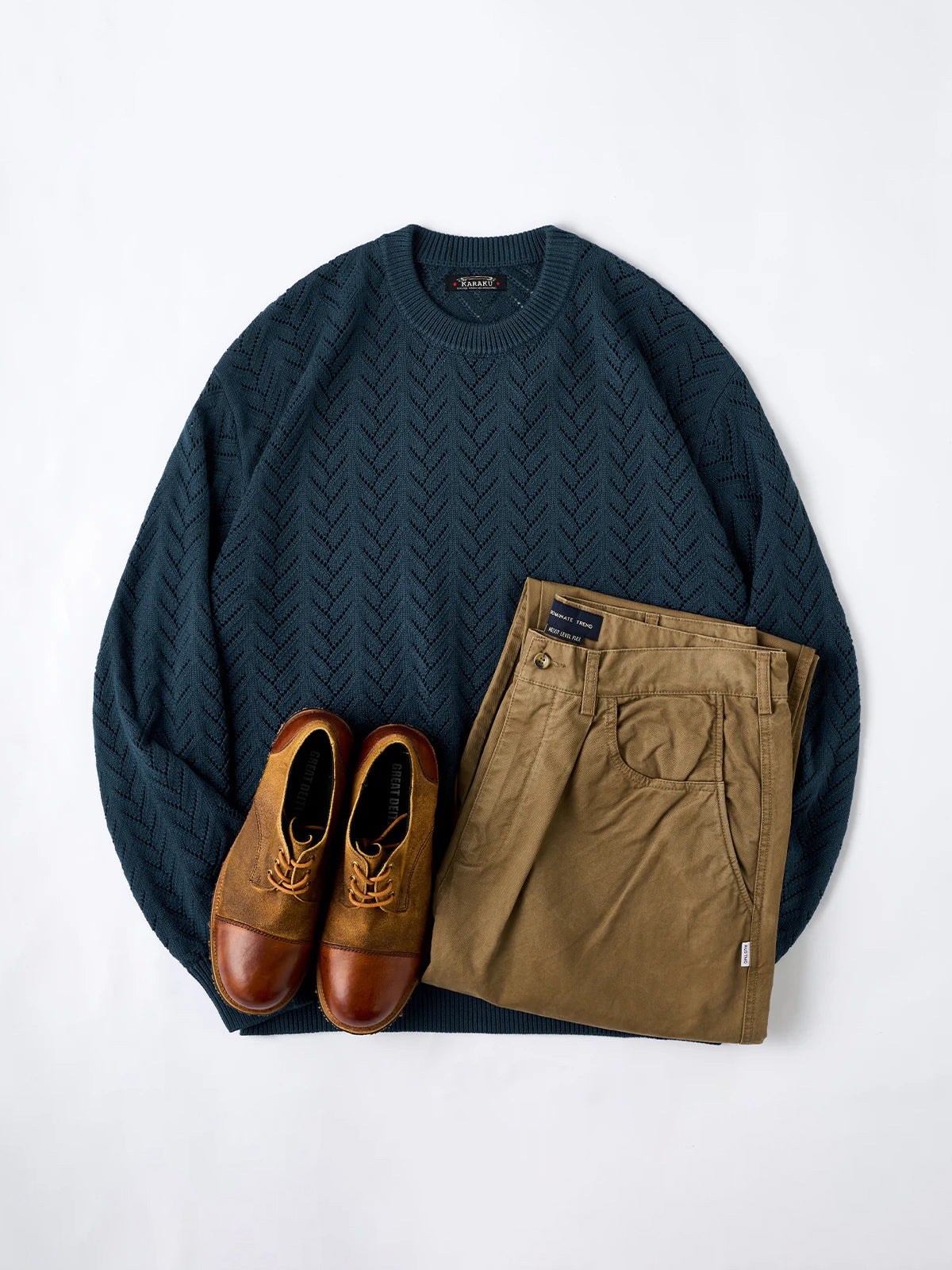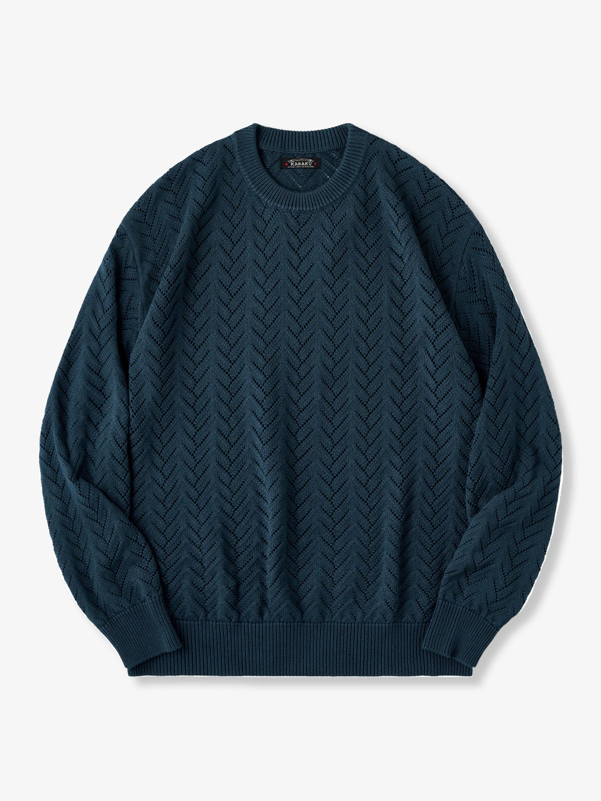 This relaxed-fit sweater features delicate openwork knitting that creates an airy, layered look. The intricate lace pattern adds a lightweight texture, achieving a simple yet refined and sophisticated aesthetic. The roomy drop-shoulder silhouette offers a comfortably relaxed fit. Crafted from soft, high-quality yarn with optimal thickness, it provides comfortable wear during seasonal transitions. Perfect for layering over shirts or long-sleeve tees.