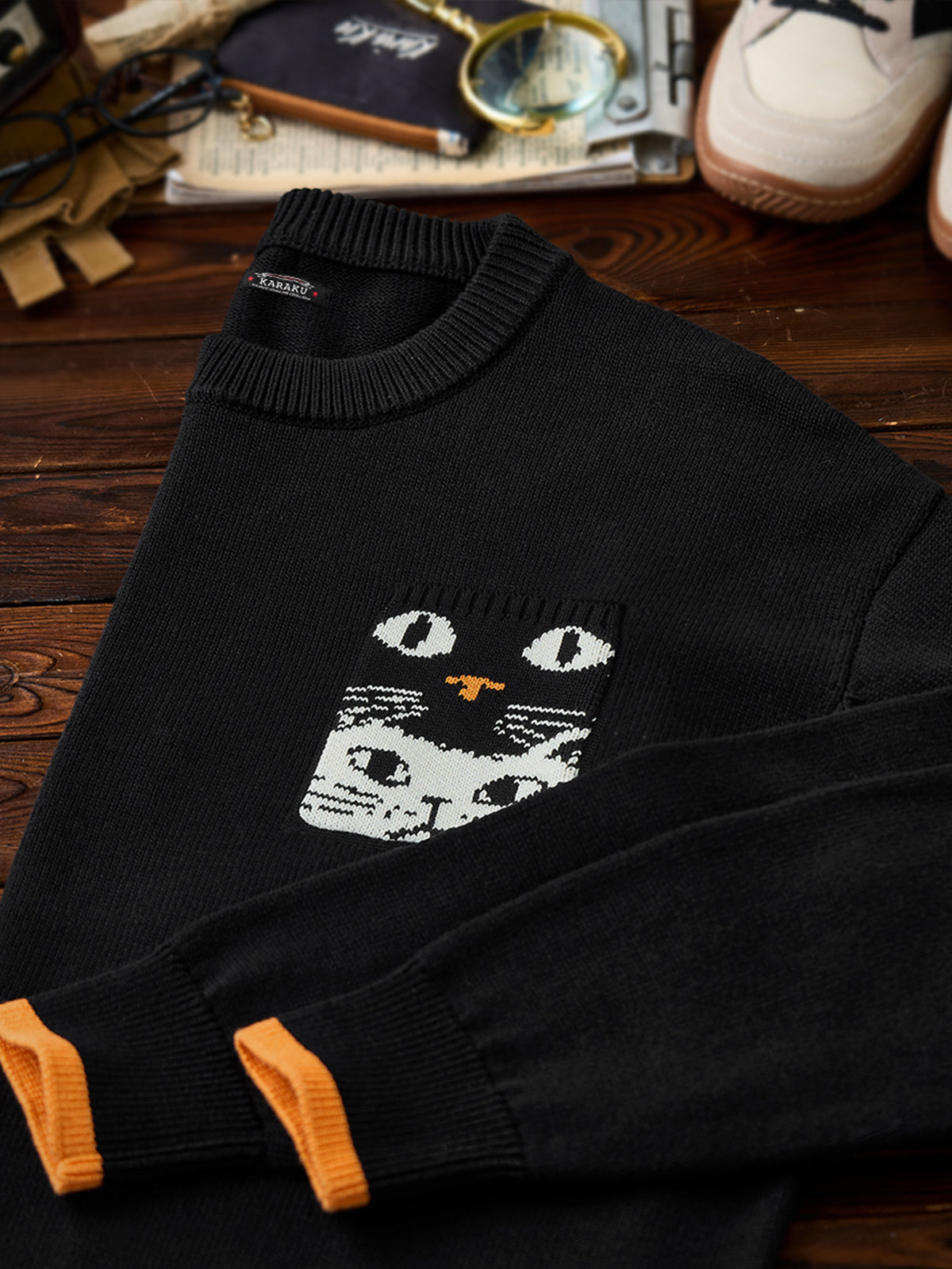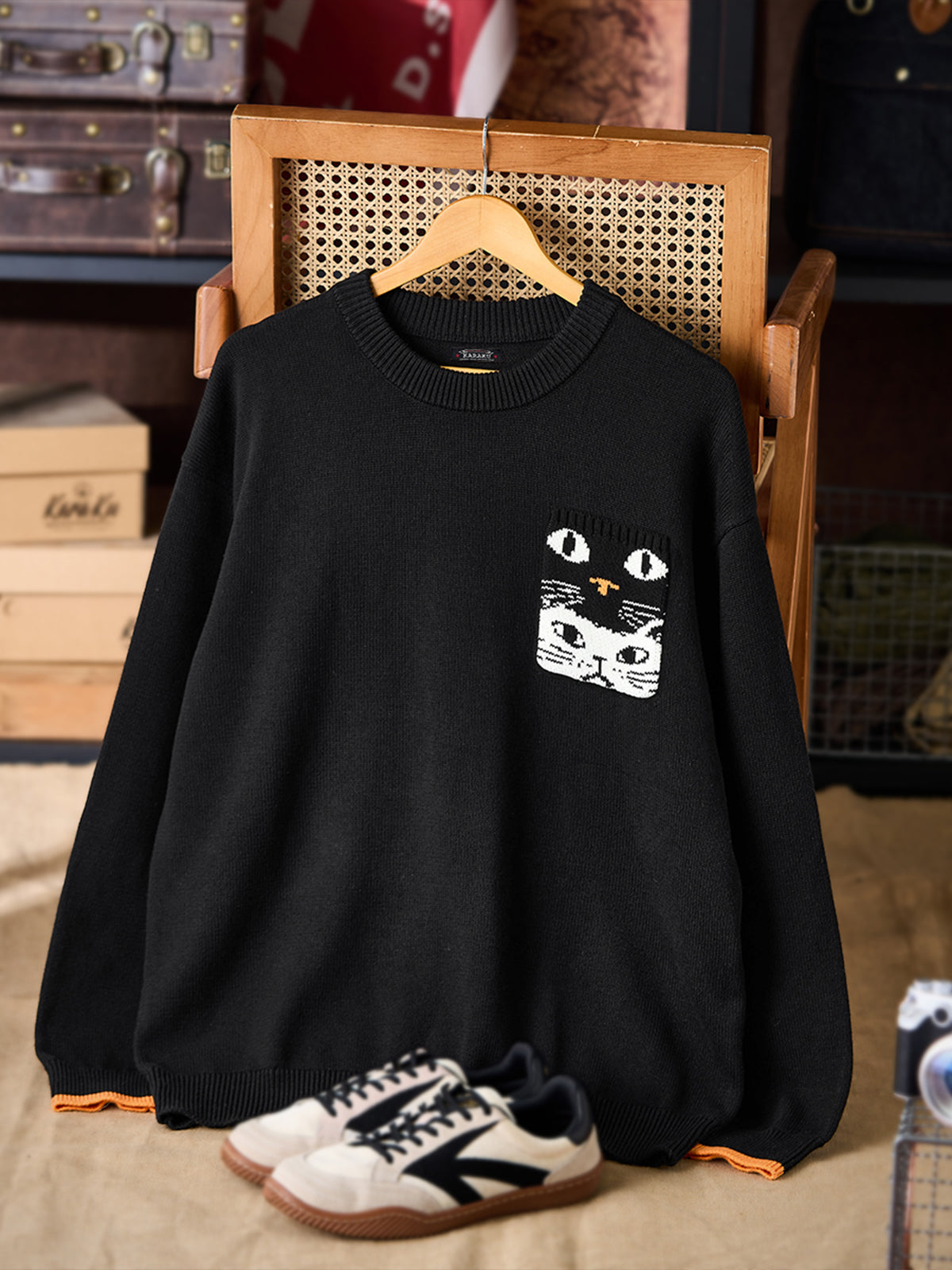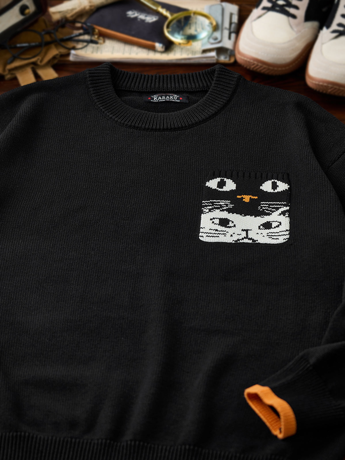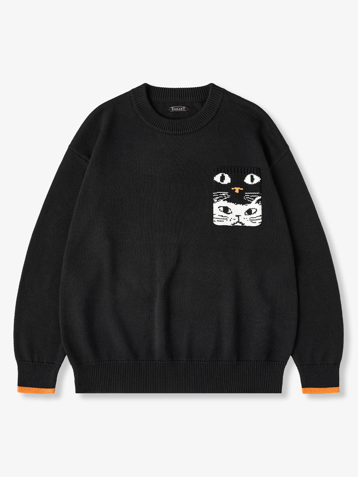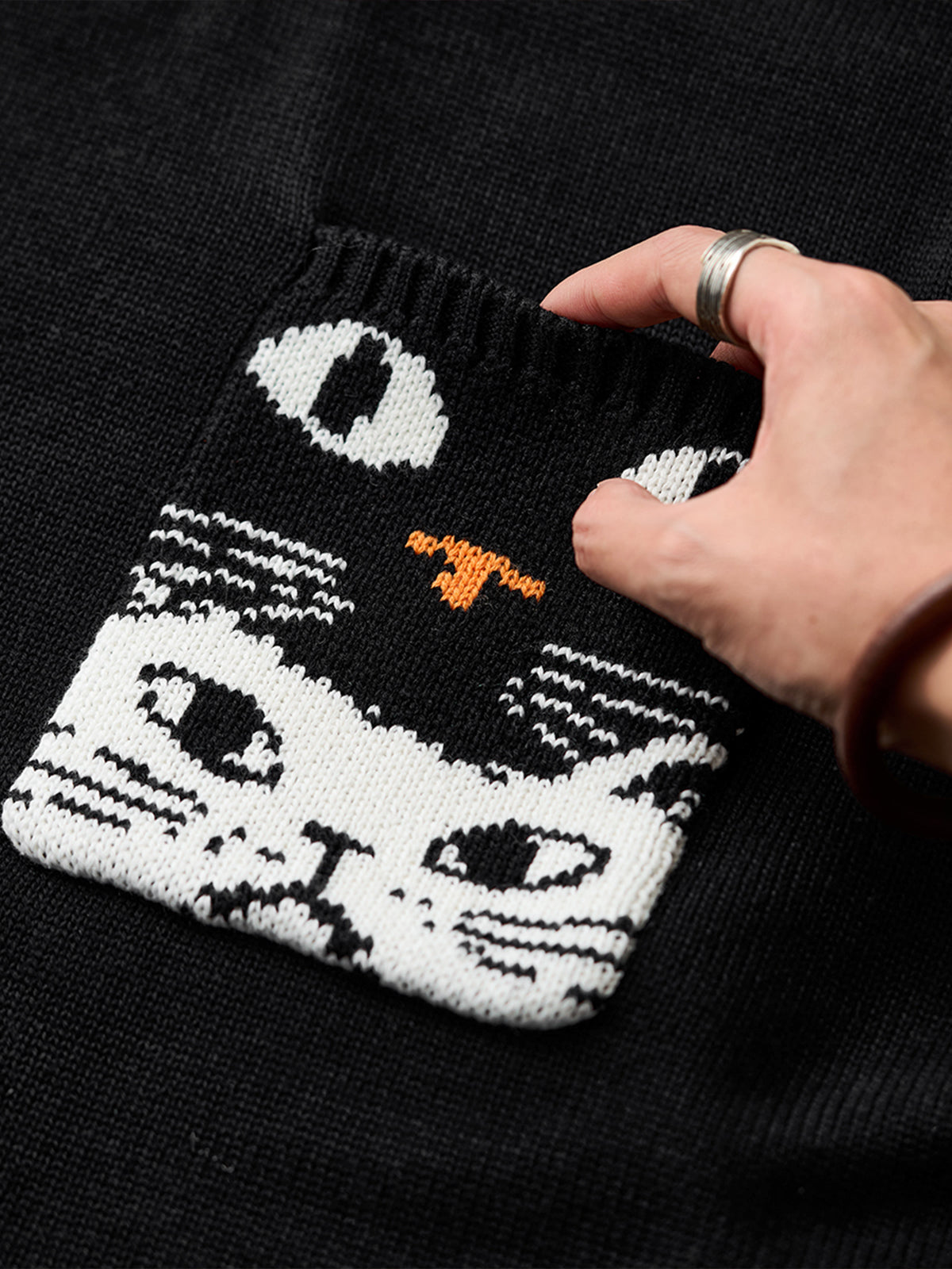 The chest pocket features a jacquard-knit design depicting a cat's eyes and face, creating a unique and eye-catching detail. Against the simple black sweater, the cat design on the pocket serves as a visual focal point and emphasizes individuality.