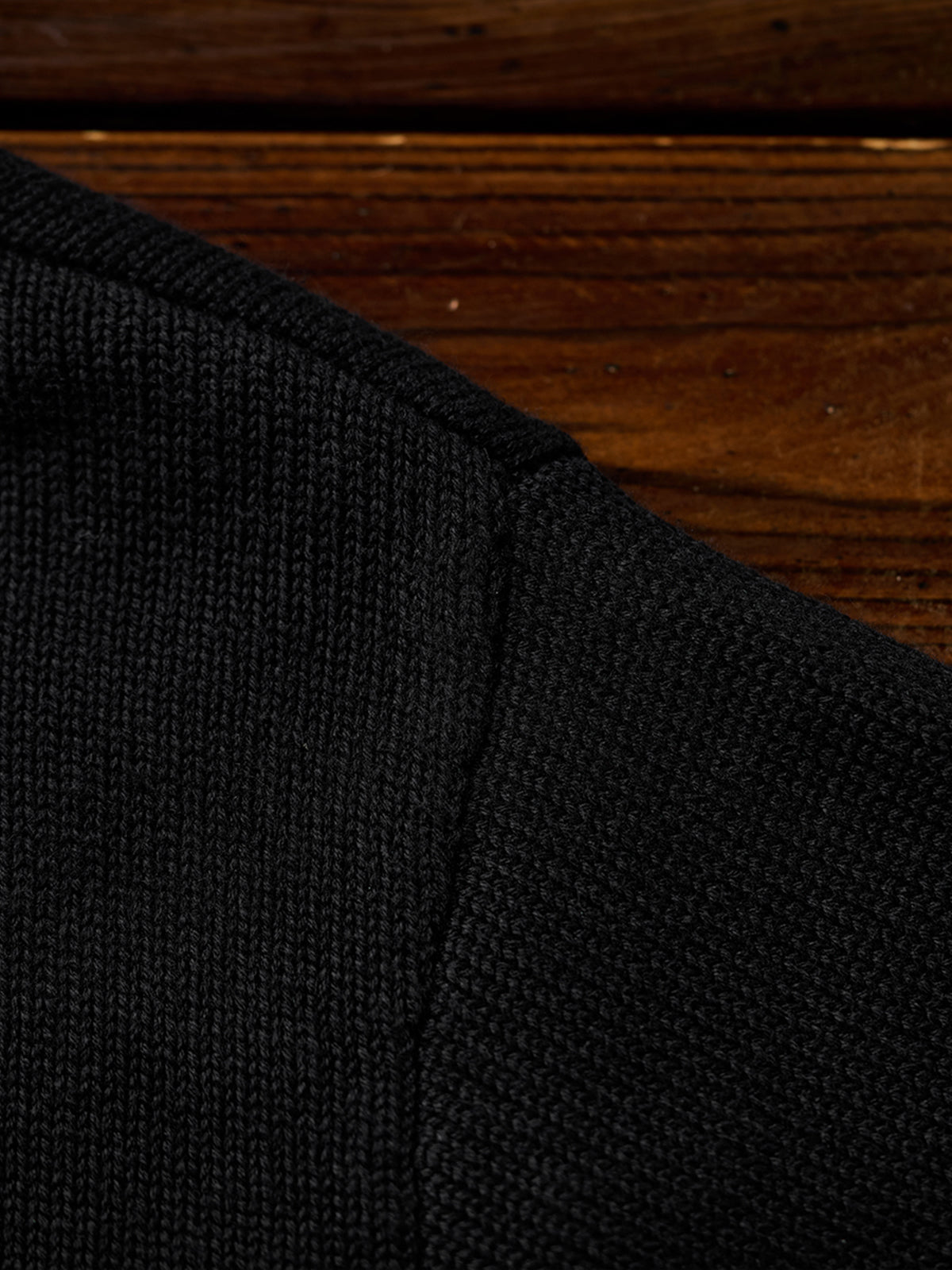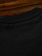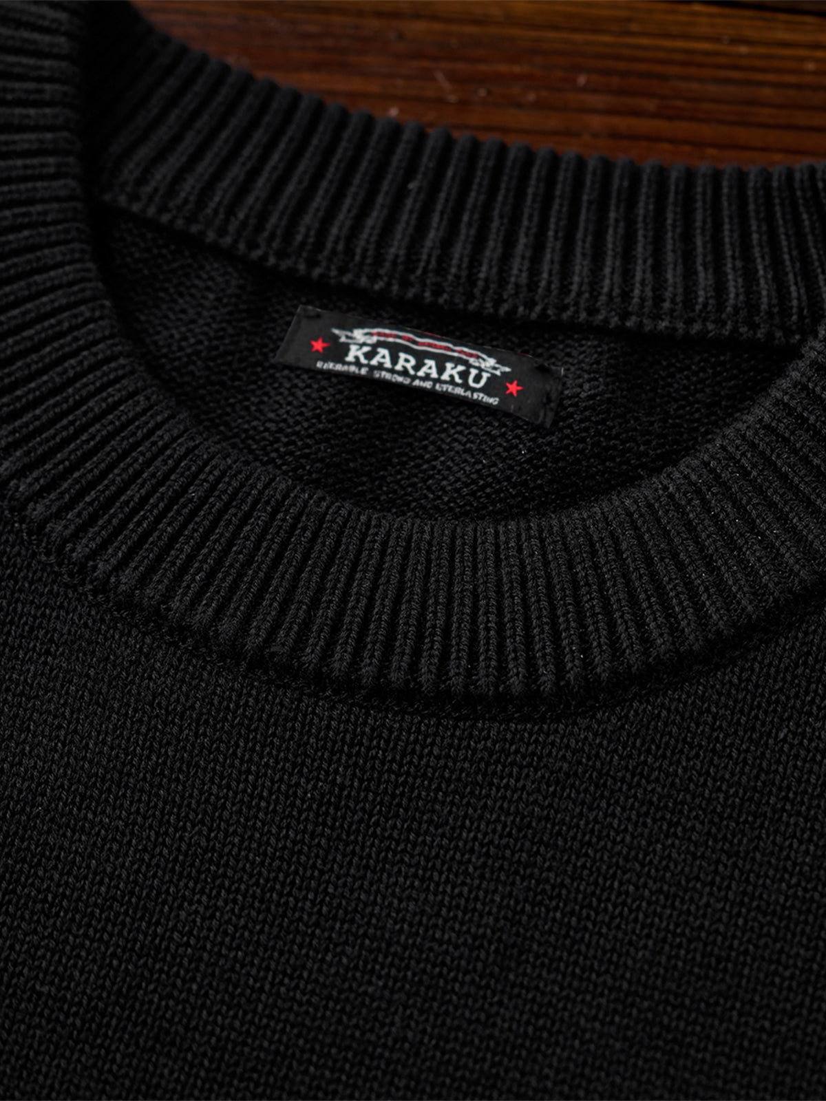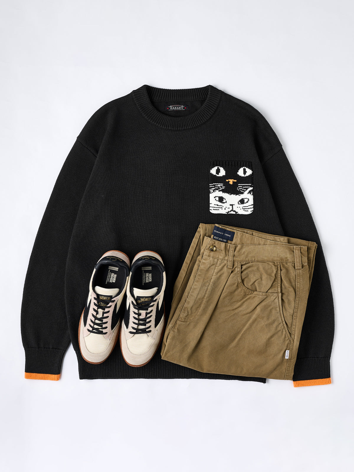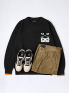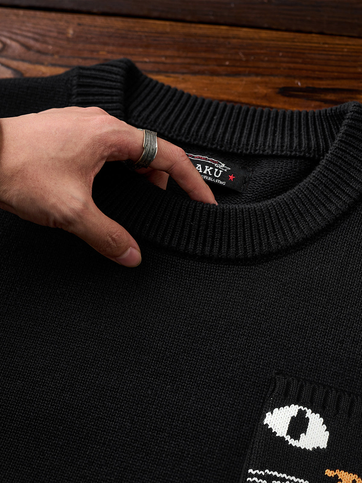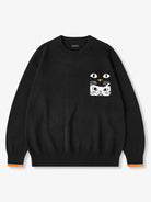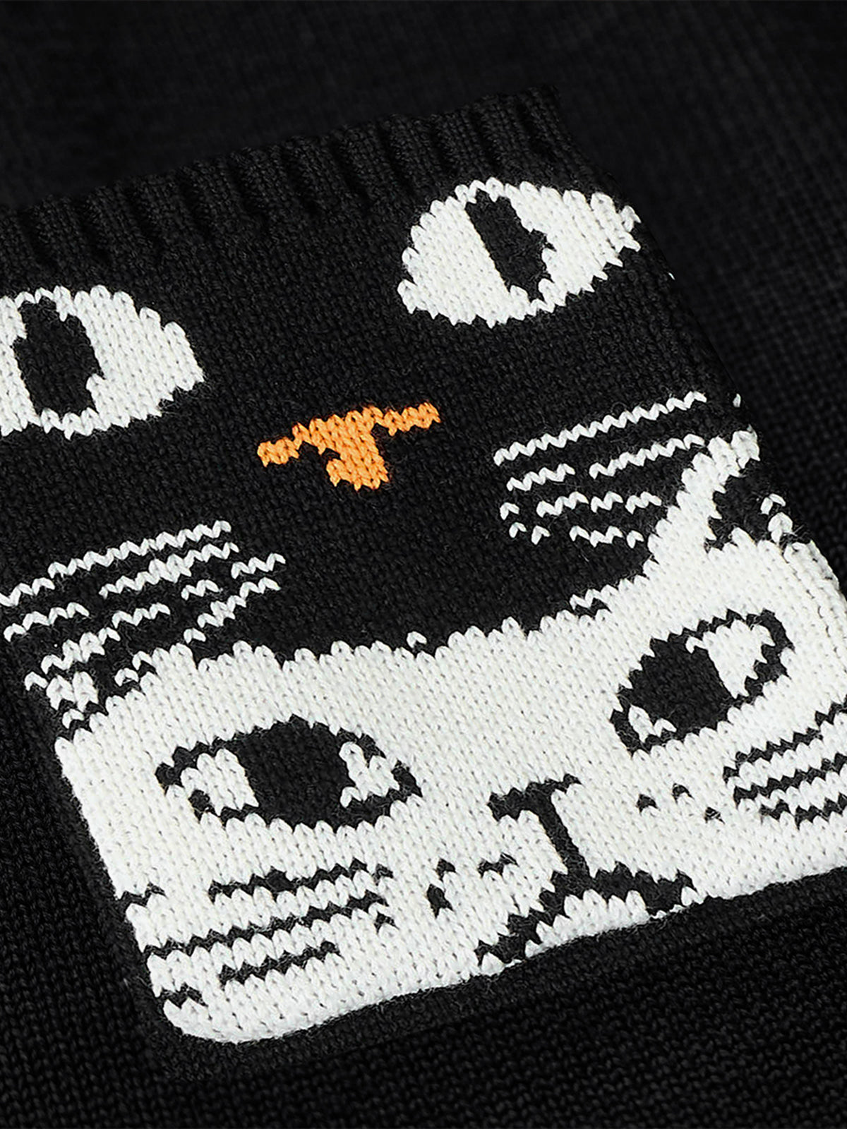 The chest pocket features a jacquard-knit design depicting a cat's eyes and face, creating a unique and eye-catching detail. Against the simple black sweater, the cat design on the pocket serves as a visual focal point and emphasizes individuality.