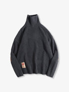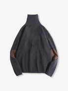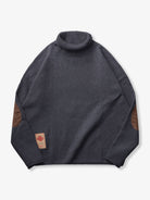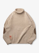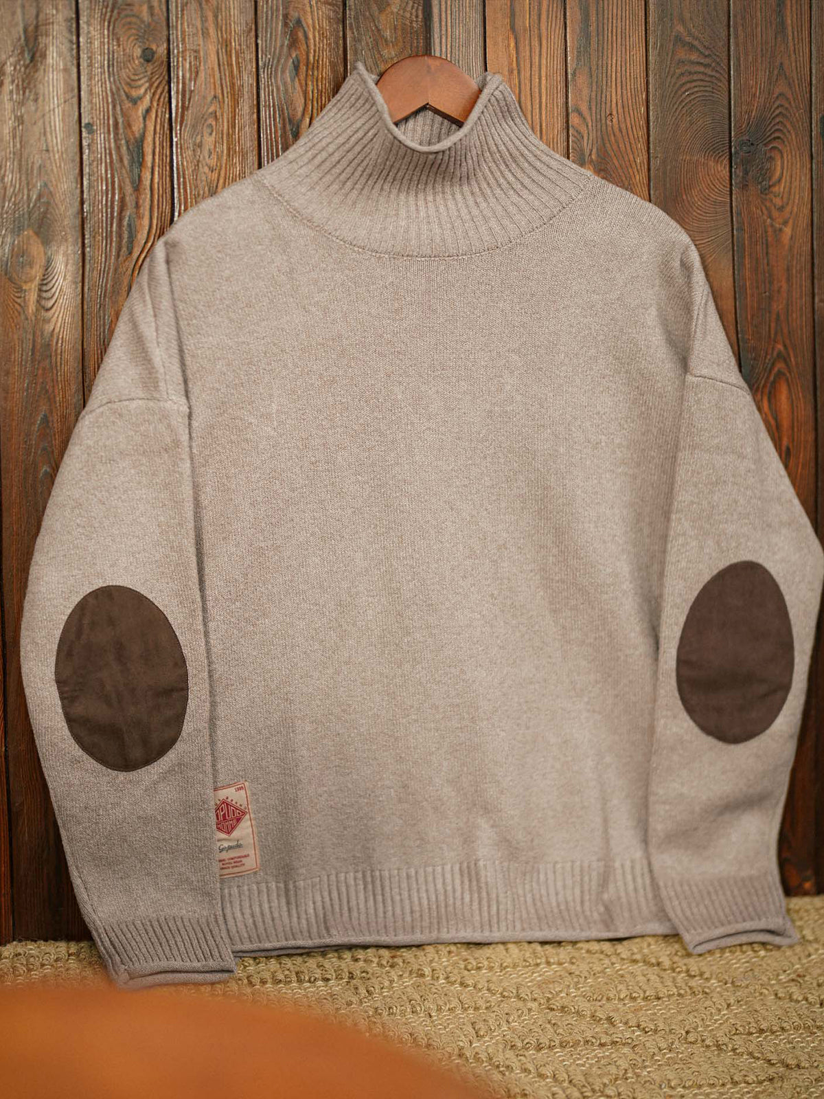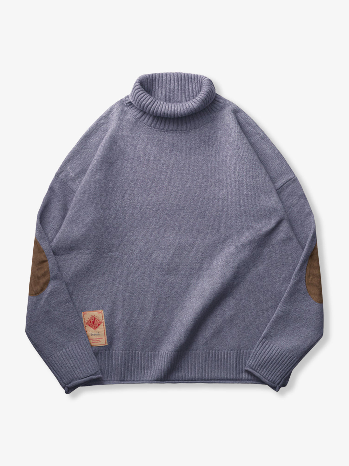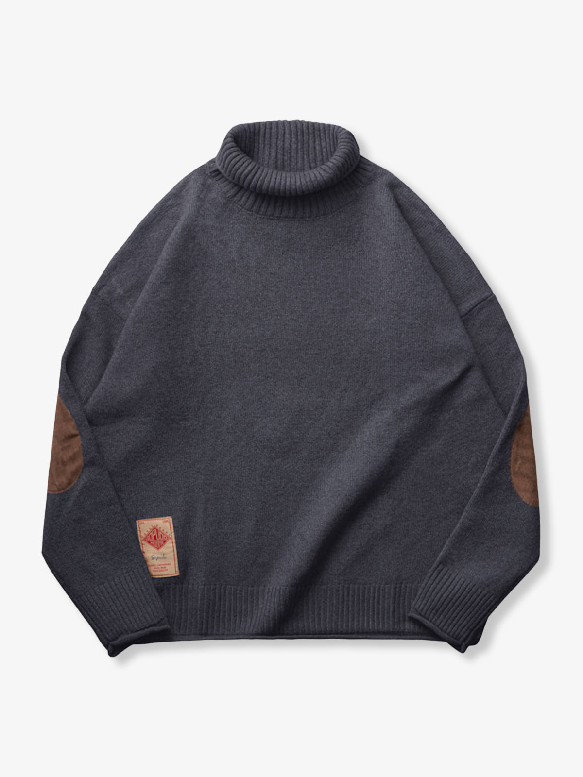 The turtleneck rises high with a long collar shape that covers the neck, keeping it warm in cold seasons while giving a stylish impression. The fancy knit combines different stitches and textures, creating a unique knitted fabric with distinctive patterns and design. Patchwork-style elbow patches add eye-catching detail and a vintage-inspired look, giving the sweater a strong presence even when worn on its own. Ribbed cuffs and hem provide stretch adjustment and a better fit.