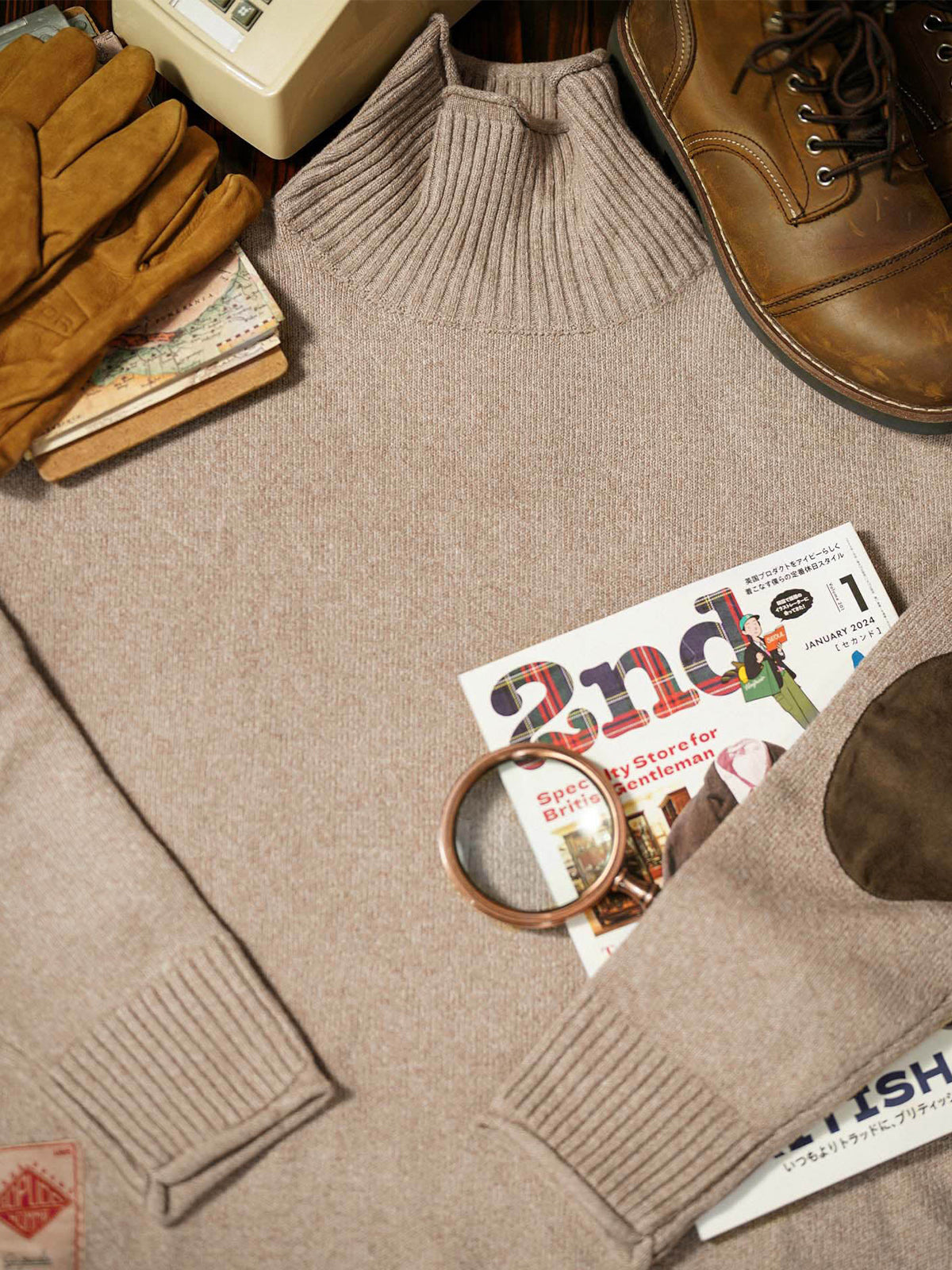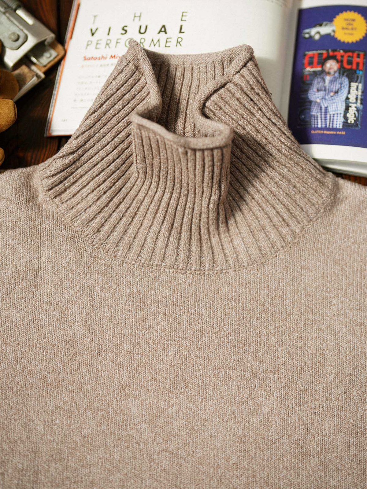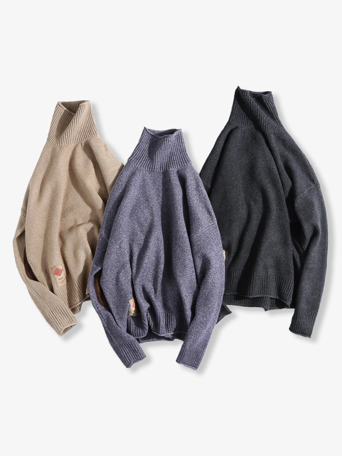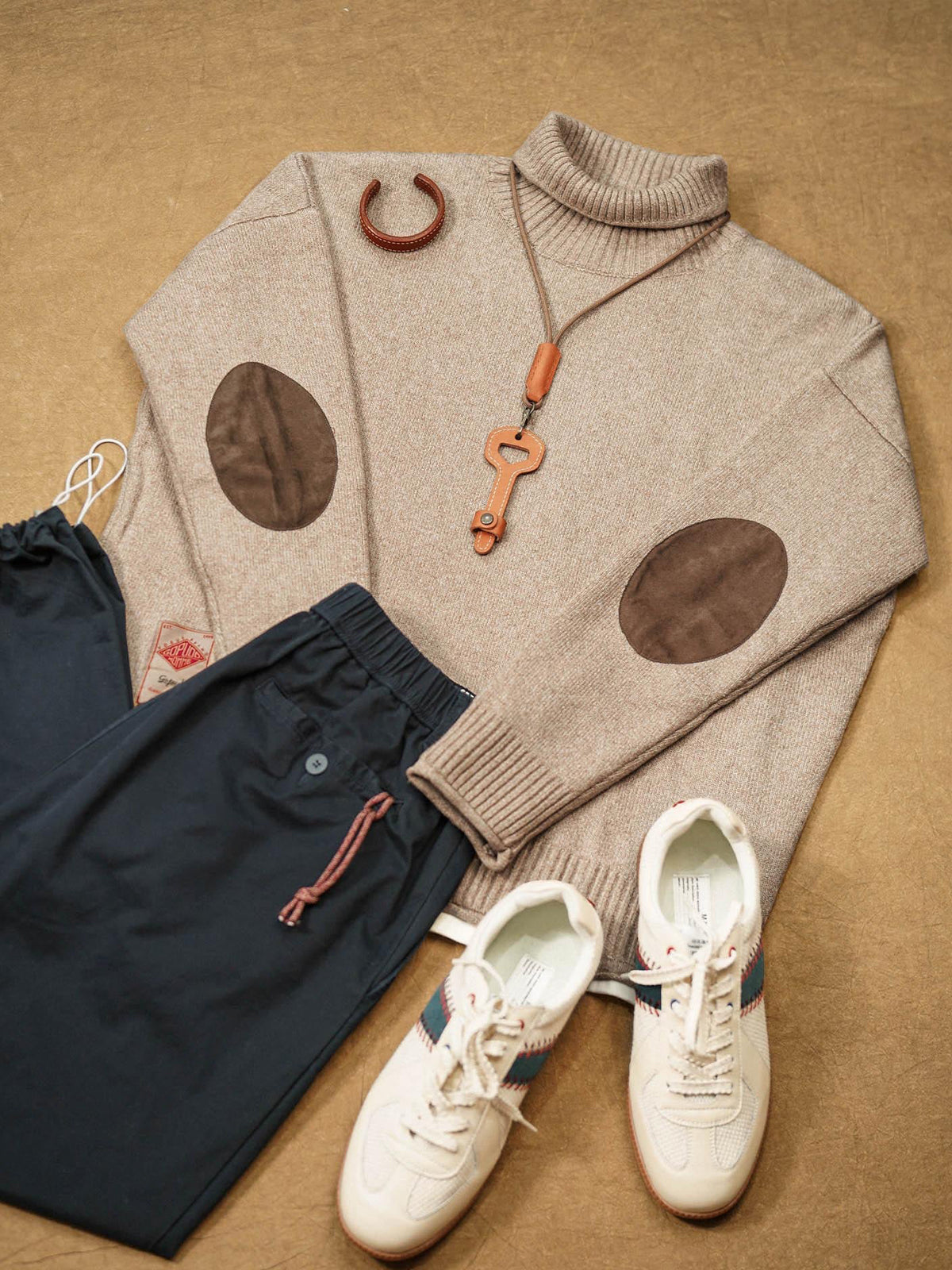 The turtleneck rises high with a long collar shape that covers the neck, keeping it warm in cold seasons while giving a stylish impression. The fancy knit combines different stitches and textures, creating a unique knitted fabric with distinctive patterns and design. Patchwork-style elbow patches add eye-catching detail and a vintage-inspired look, giving the sweater a strong presence even when worn on its own. Ribbed cuffs and hem provide stretch adjustment and a better fit.