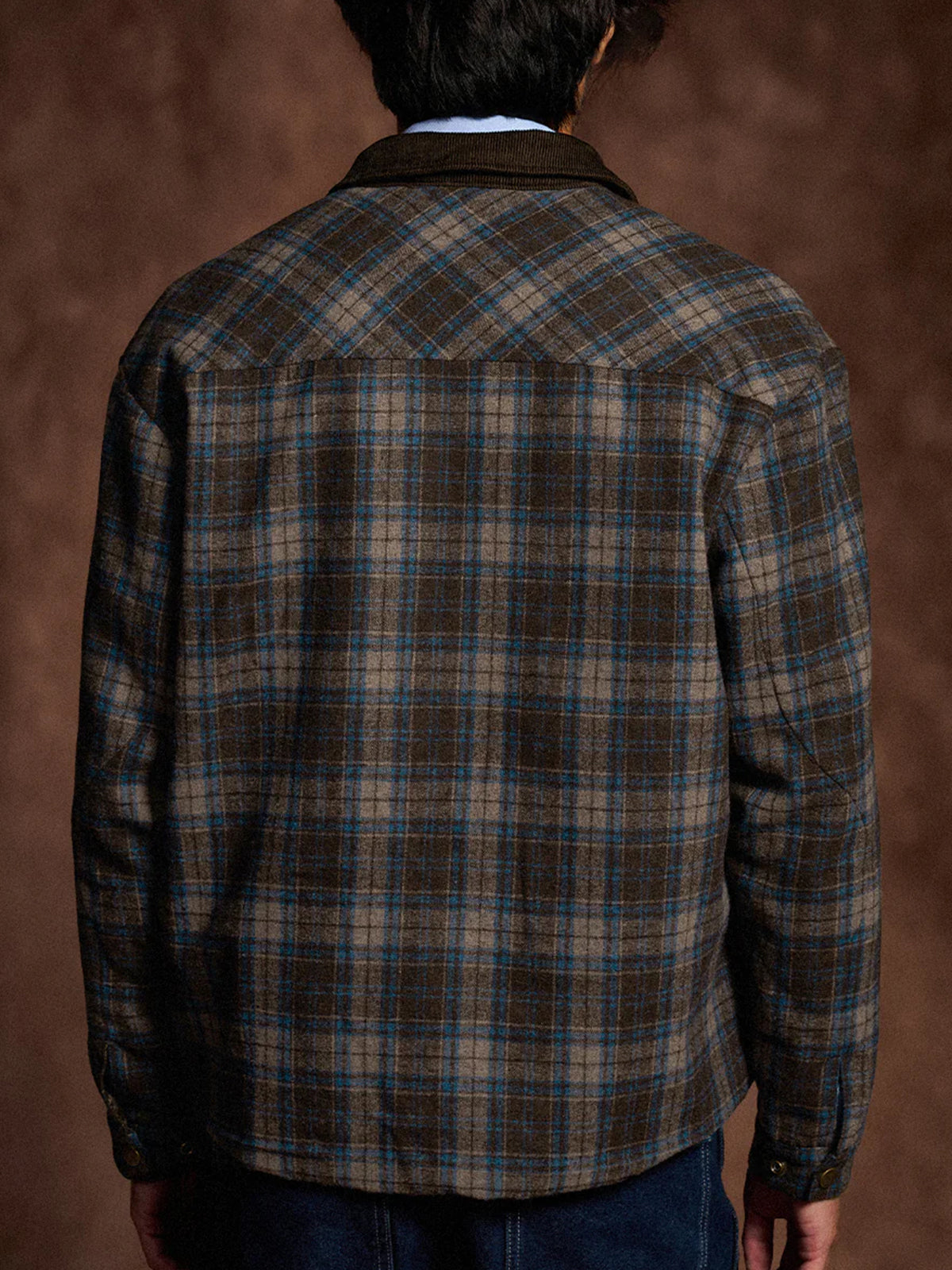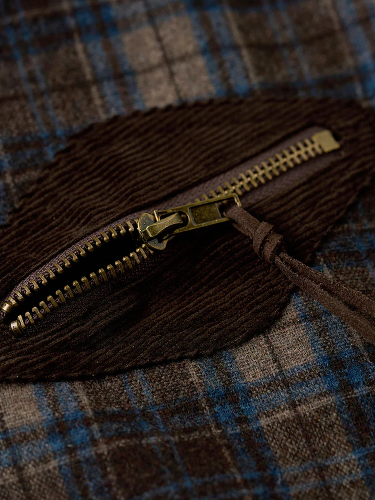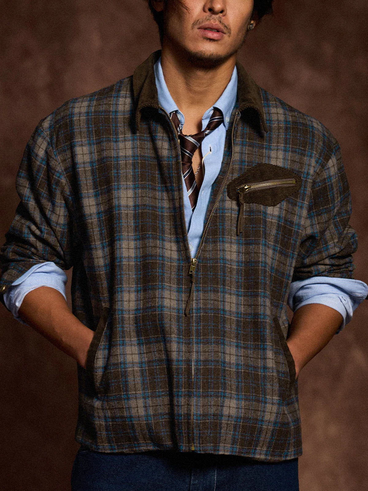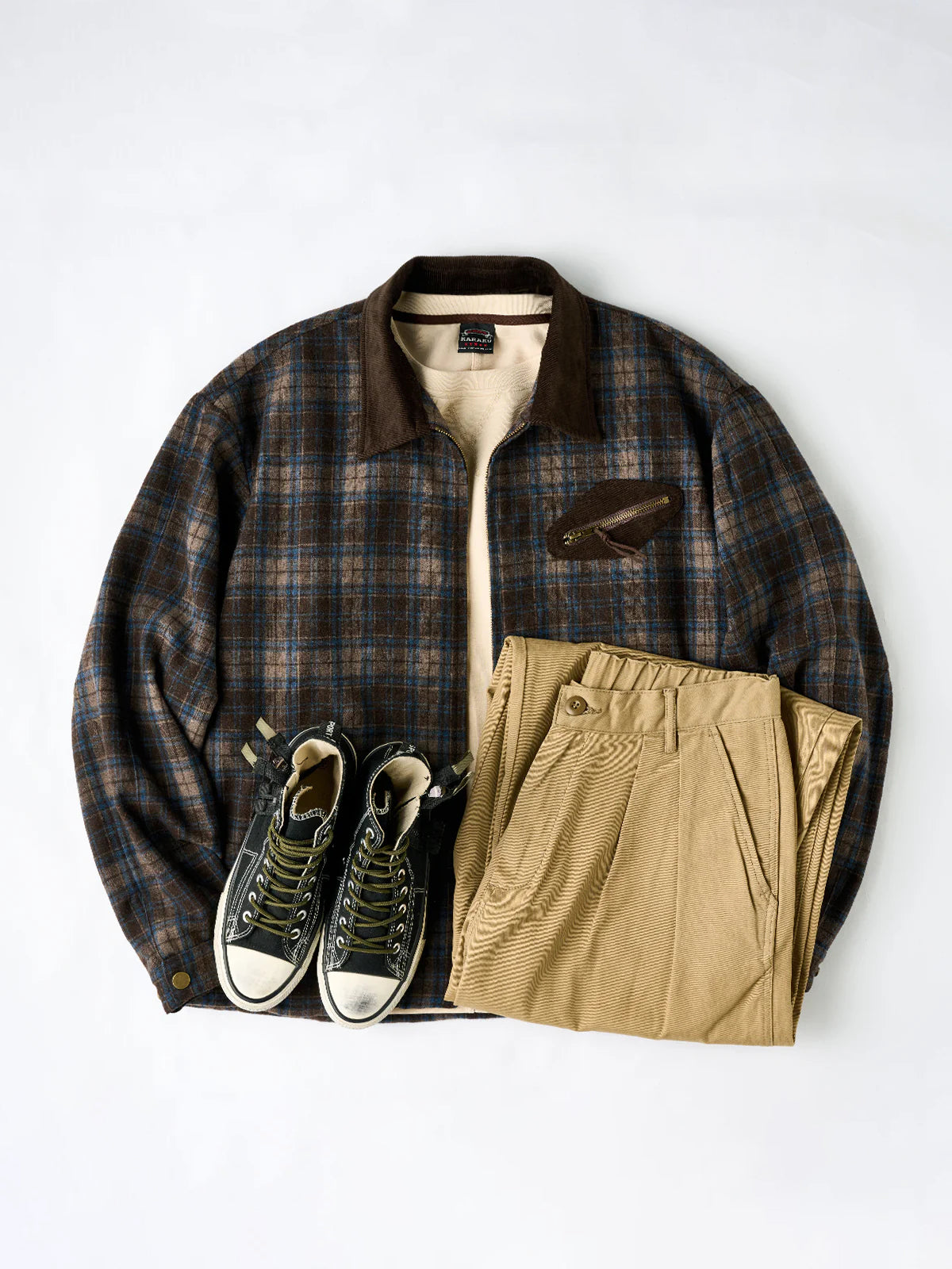 A Detroit jacket rooted in rugged workwear has been updated with a wool-blend tweed check pattern. The warm appearance is complemented by corduroy switch accents throughout, giving it a vintage feel. The moderately relaxed silhouette allows for layering with inner garments and matches a wide range of autumn and winter styling. This seasonal piece combines the toughness of workwear with the refined elegance of traditional style.